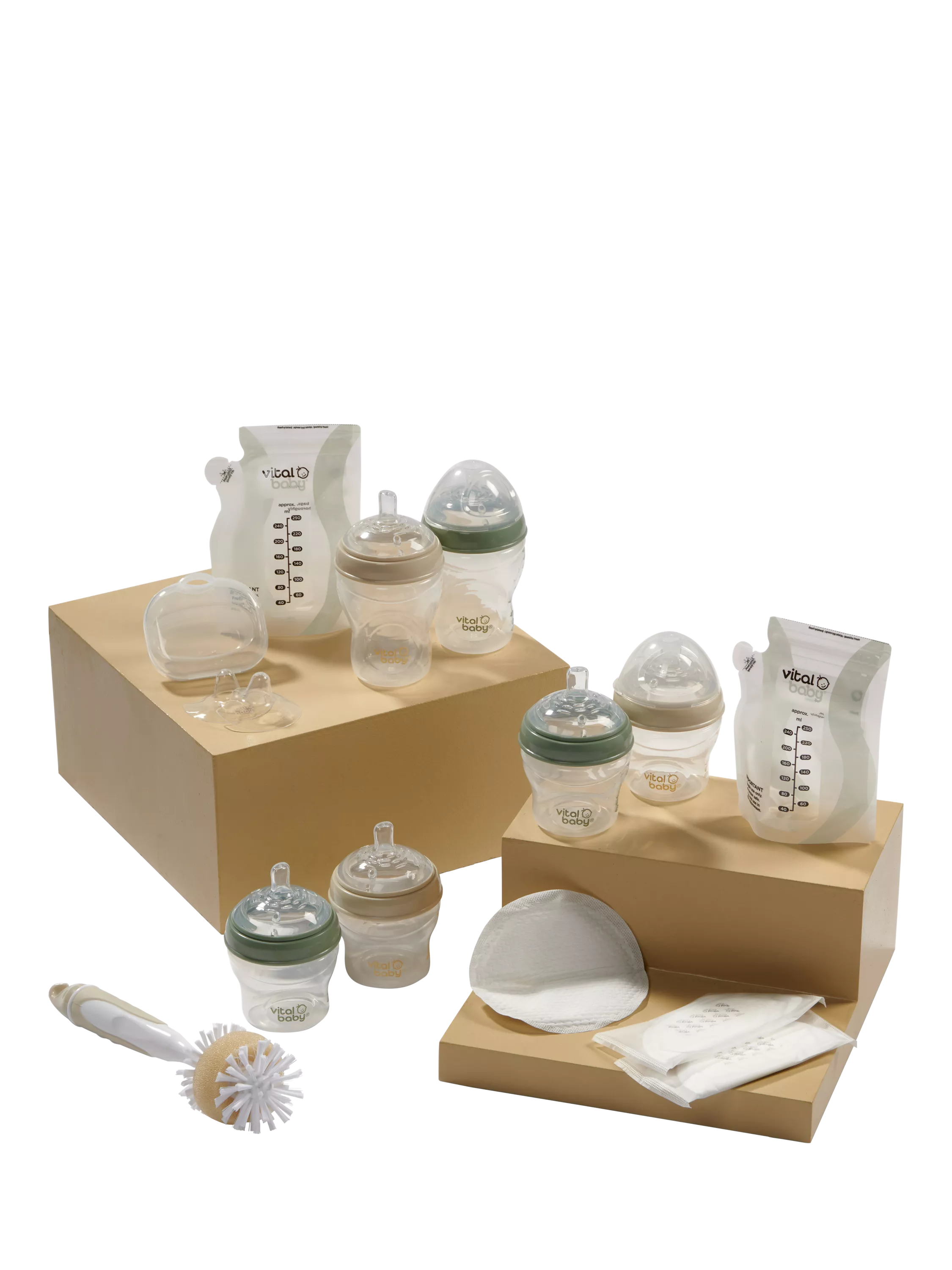 Carefully designed for comfortable, convenient, and seamless breastfeeding and bottle feeding, Vital Baby has bundled their Breast-Like Bottles, Deluxe Baby Bottle Brush, Easy Pour Breast Milk Storage Bags, Nipple Shields and Ultra Comfort Breast Pads to get you started on the feeding journey with your baby with confidence.