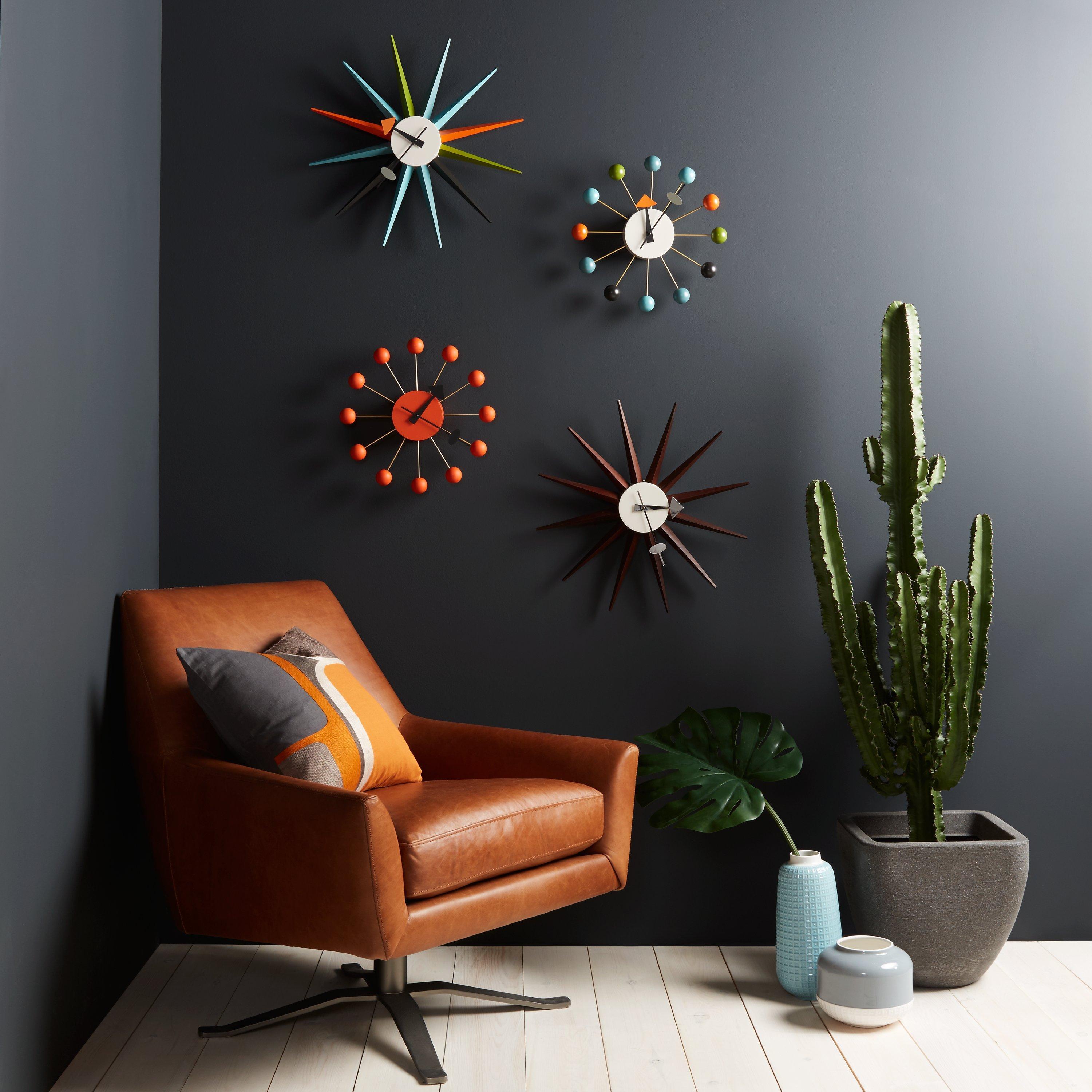 This stunning wall clock is a faithful re-edition of the cherished 1950s collector's piece from George Nelson. As with all of the eminent Nelson's designs, the structural, sun-inspired form and diverse use of materials really embody the joie de vivre of his mid-century heyday while remaining relevant and influential today. It features a trusty Quartz clock movement and includes a rechargeable battery.