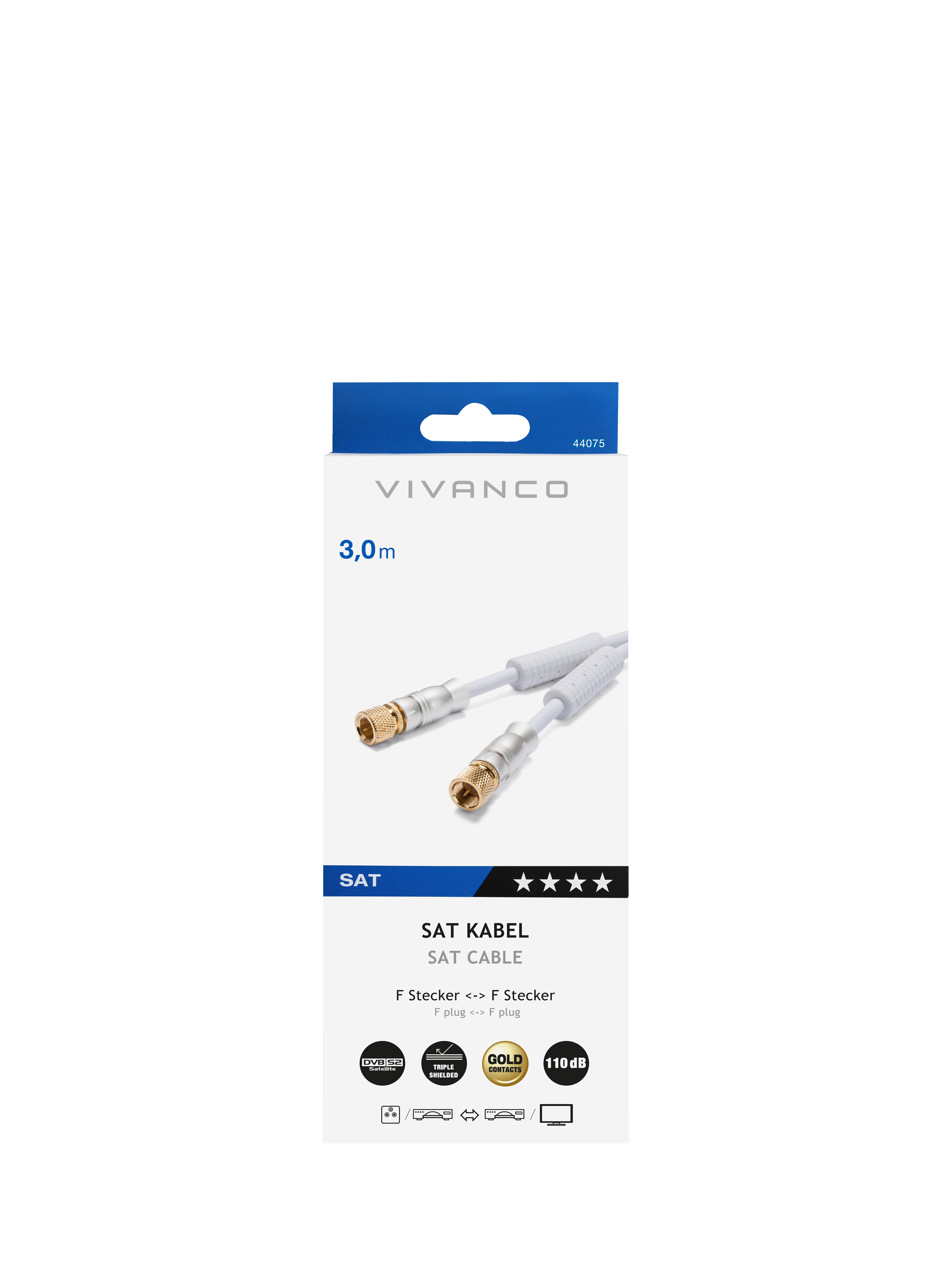 Used for connection of satellite receivers to the satellite aerial socket. With an ‘F’ plug at both ends, high-quality shielding and a ferrite core provide perfect picture and sound quality. It has 24-carat gold-plated contacts, and reaches a screening efficiency of 110dB.