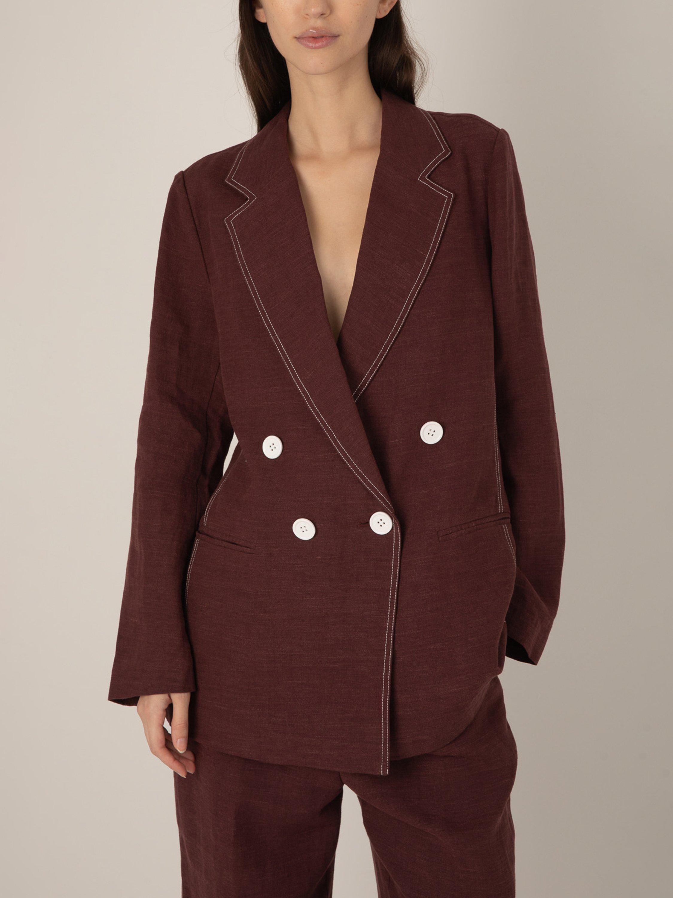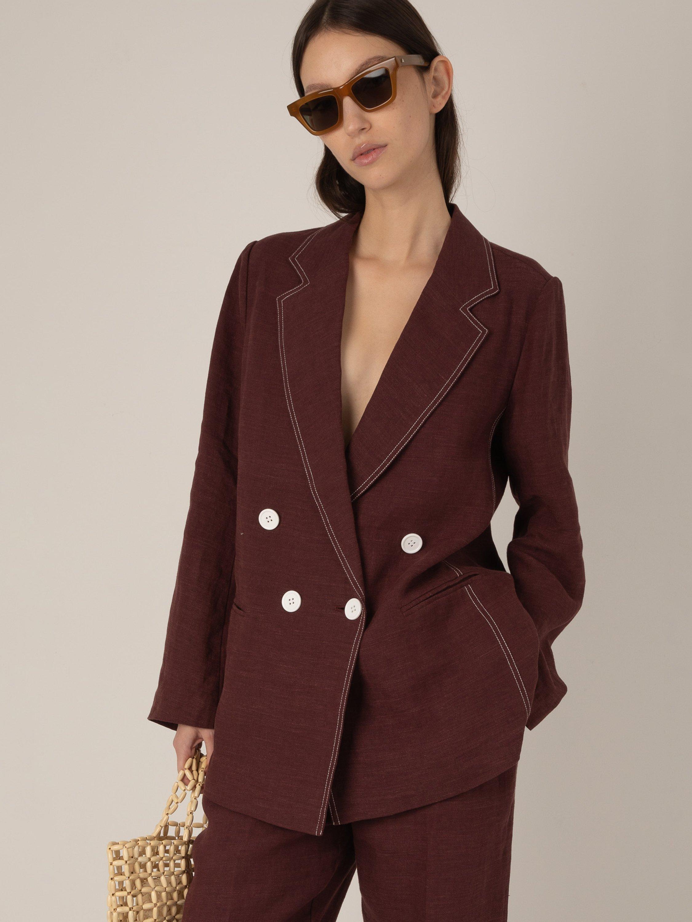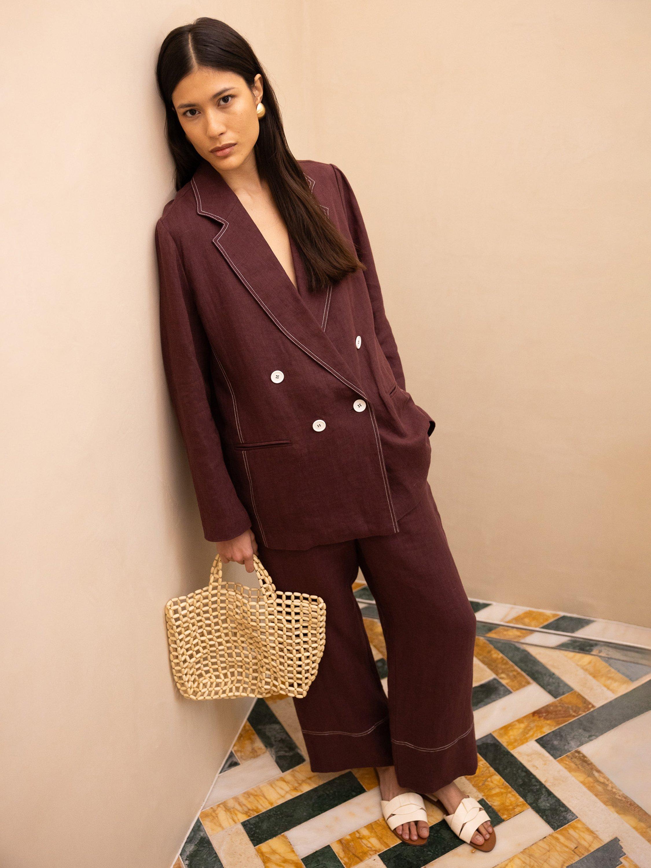 VIVERE’s tailored blazer brings sharp style and comfort to your plans. Fully lined for easy layering and detailed with white contrast buttons and stitching, its natural linen build keeps you feeling fresh.