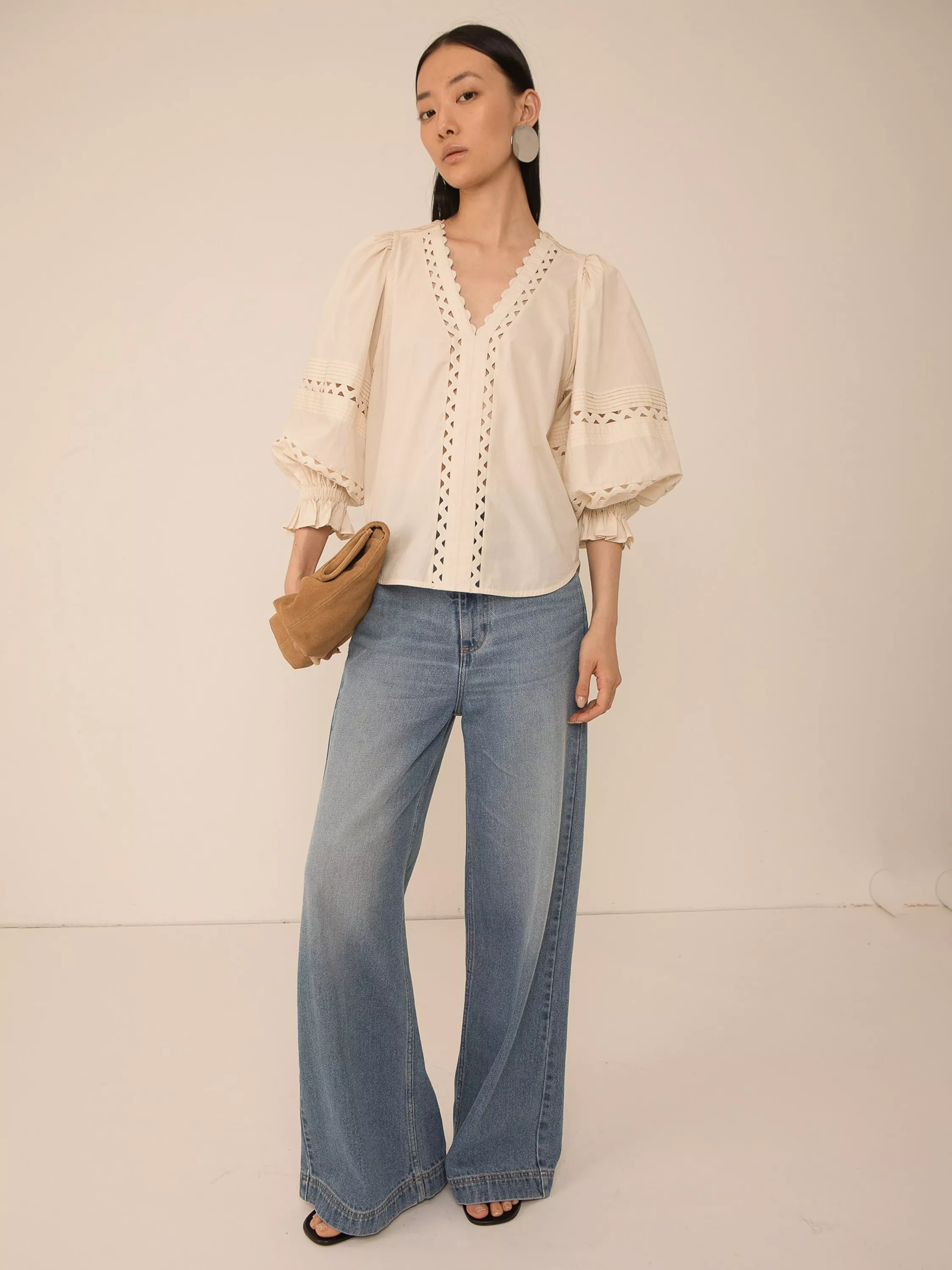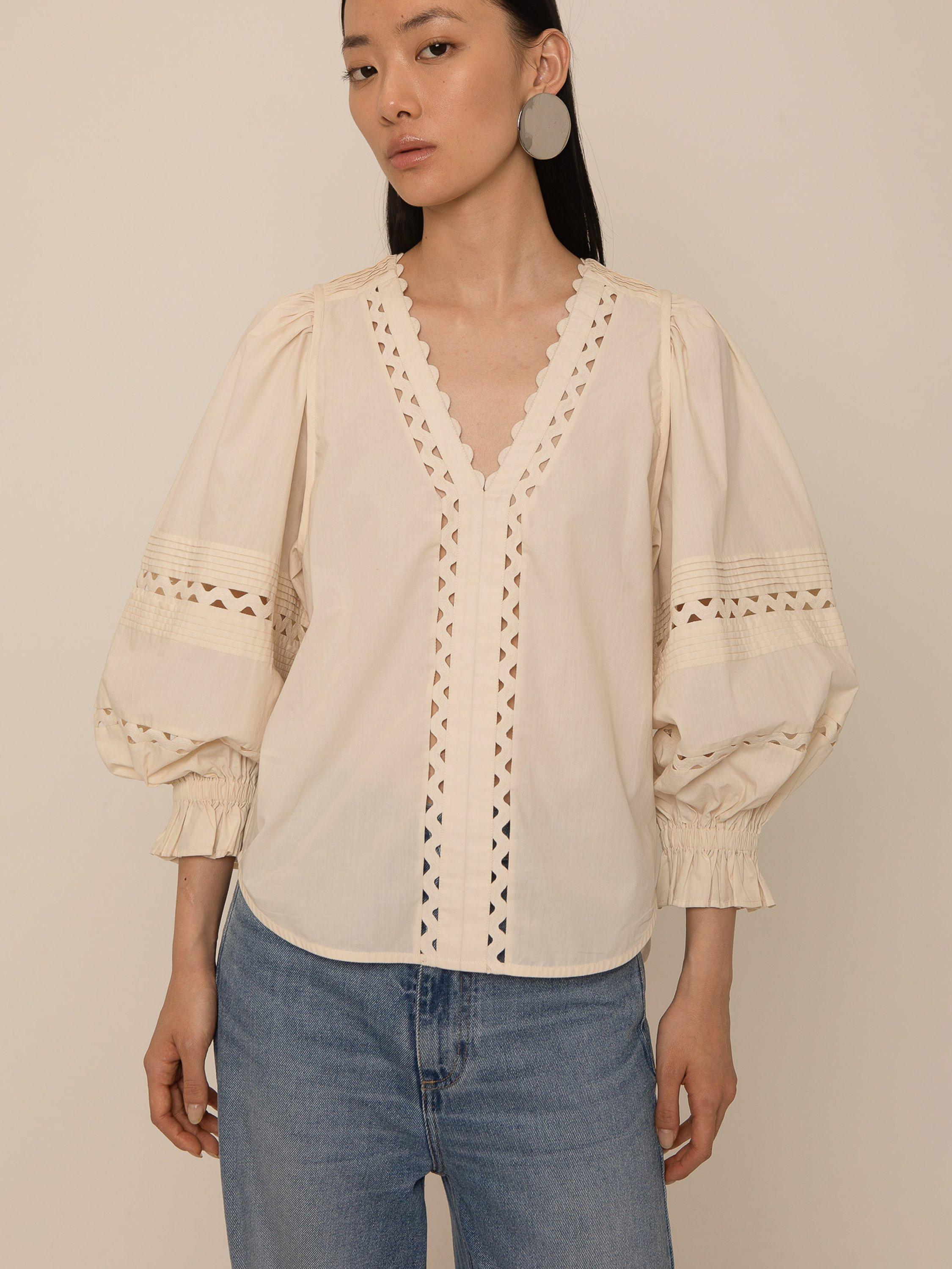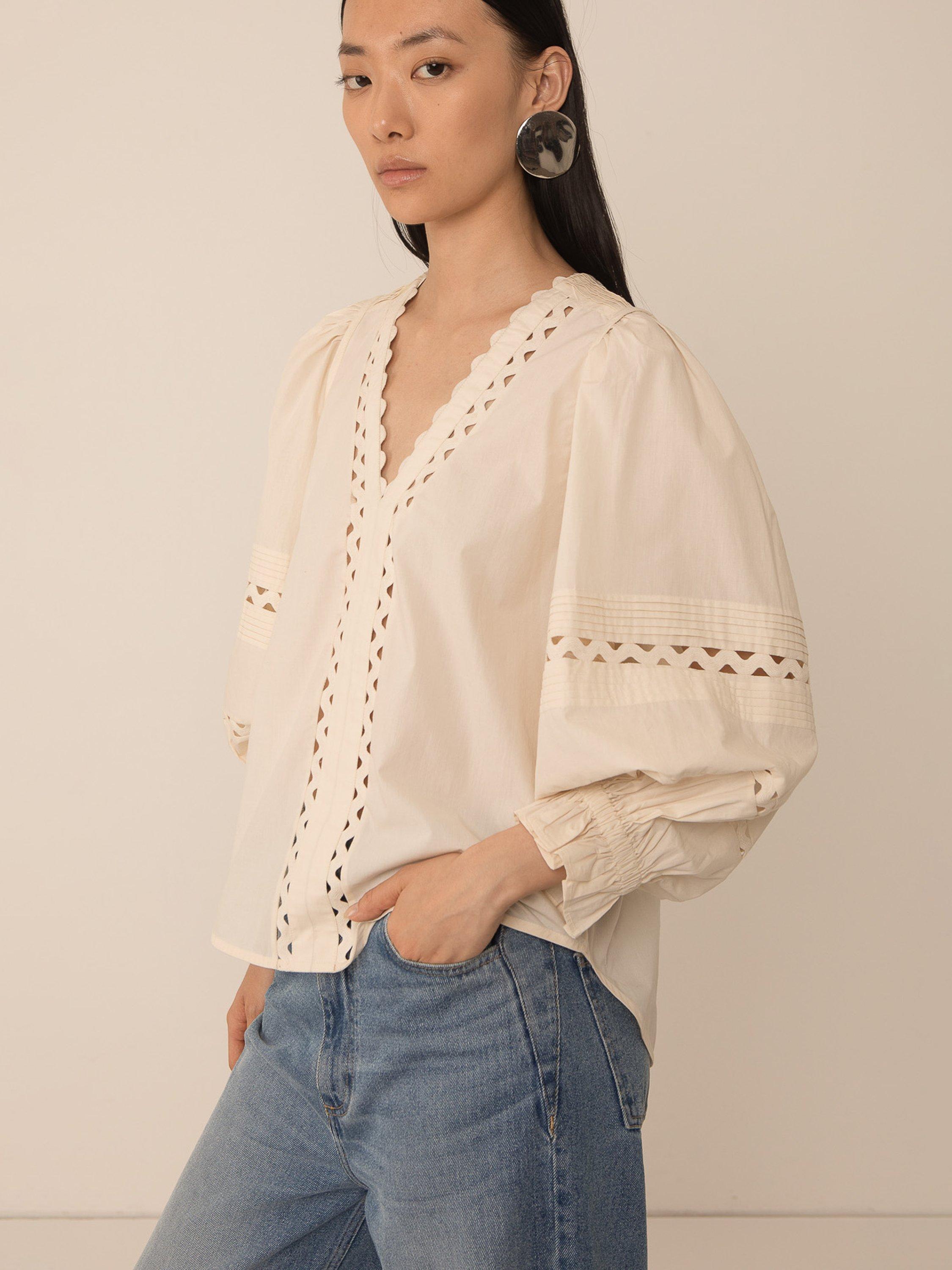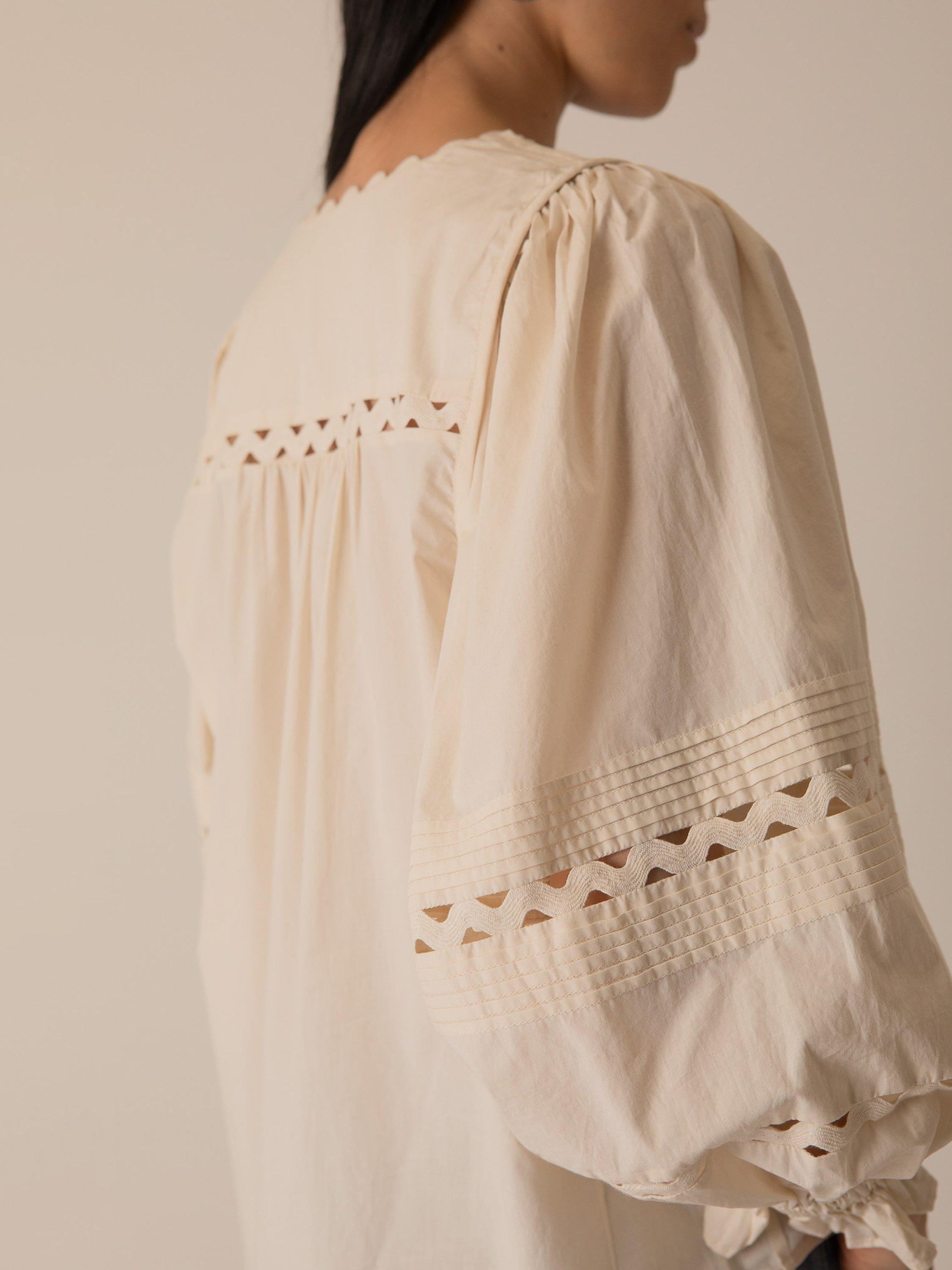 A pintuck blouse by VIVERE, made from cotton for comfortable wear. Featuring a V-neck and three-quarter length puff sleeves with elasticated cuffs, it's textured with a lace zig-zag trim and scalloped hems.