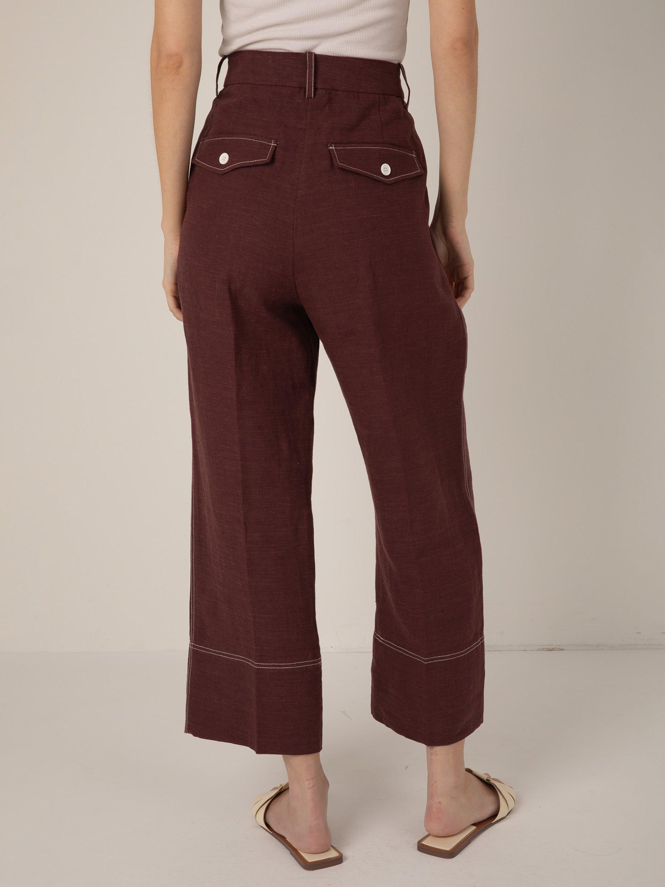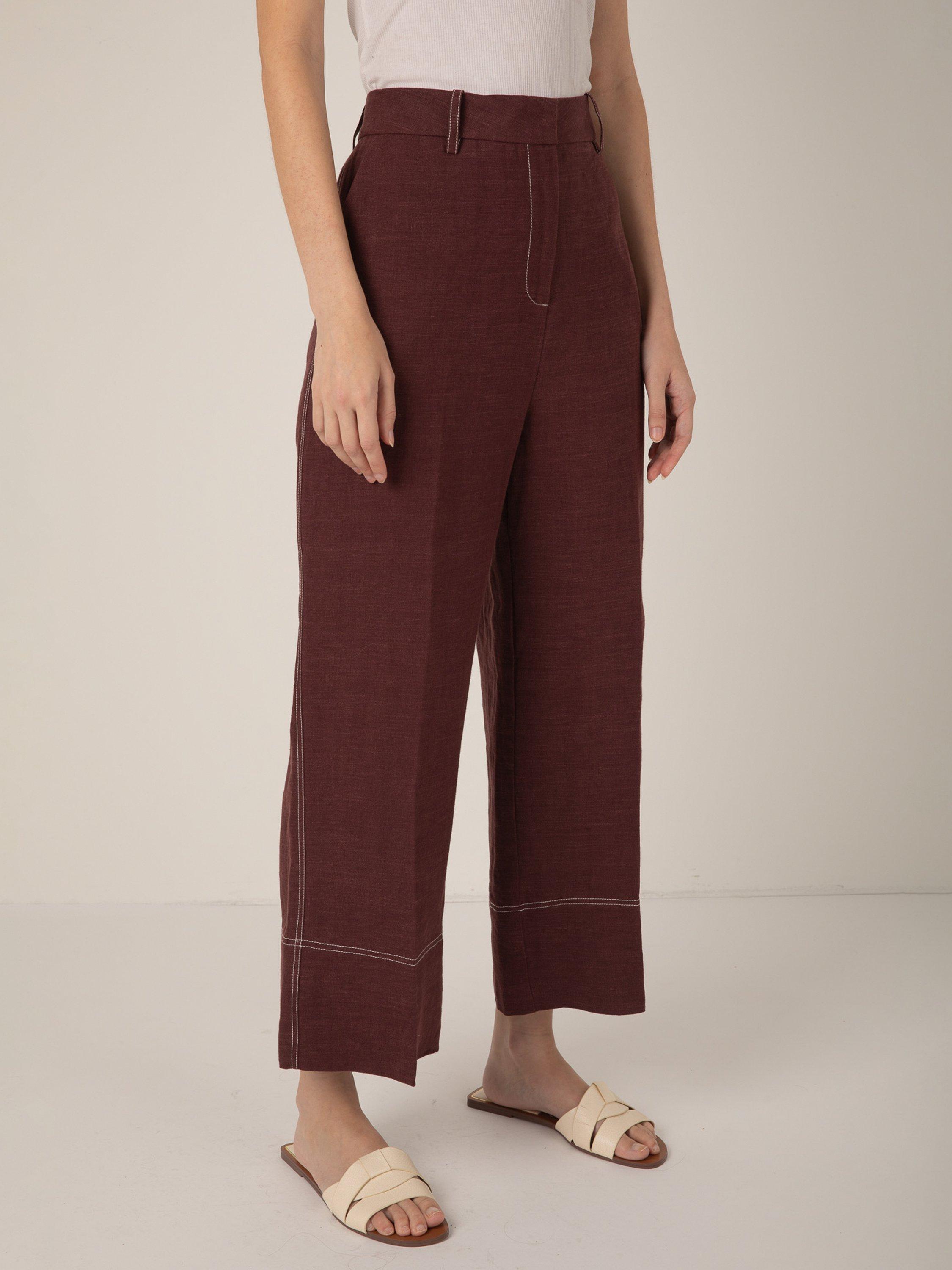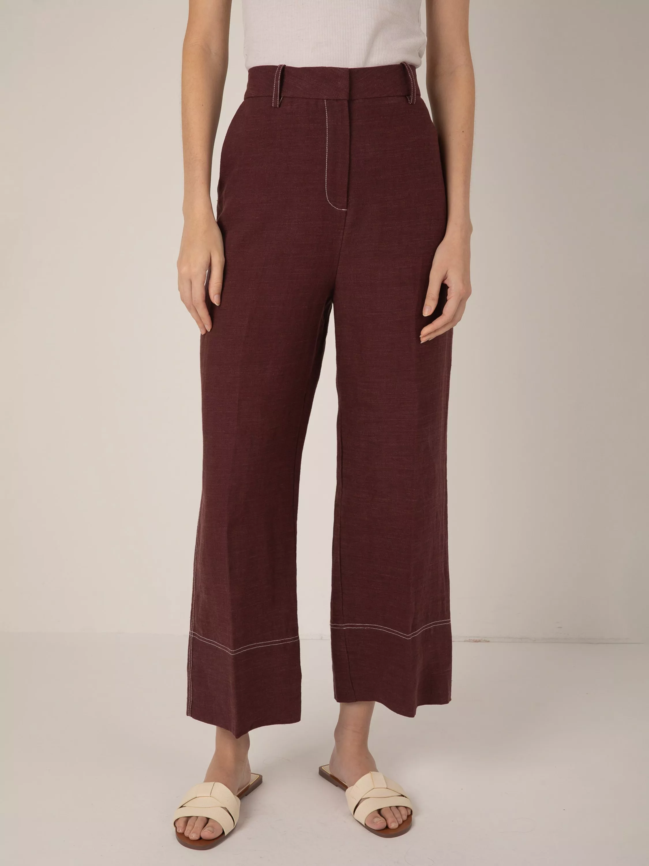 A pair of confident, exaggerated wide-leg trousers by VIVERE, crafted from linen featuring contrast stitching on the seams. They are designed to sit high on the hips with a slightly-flared hem that lightly grazes the ankle.