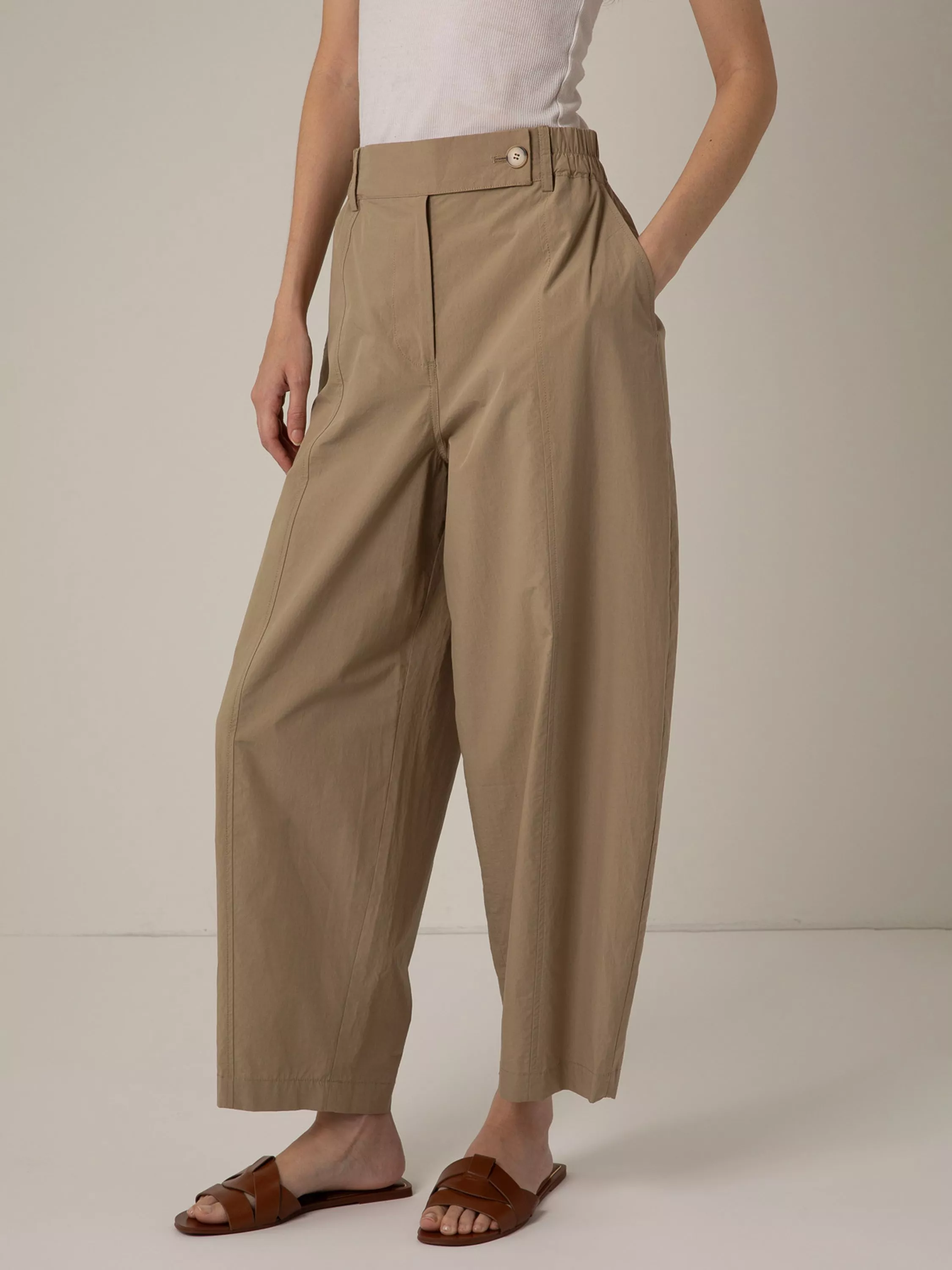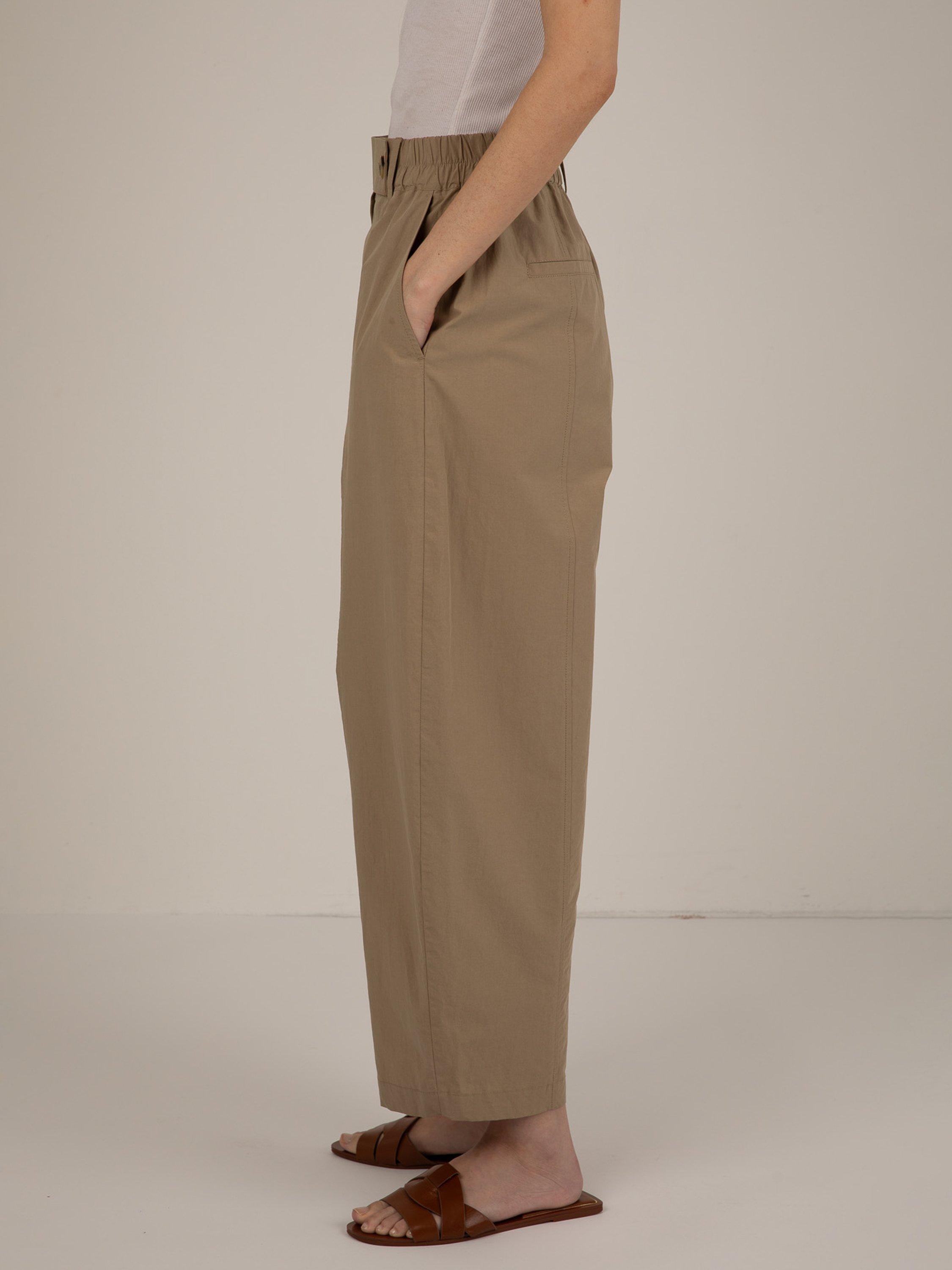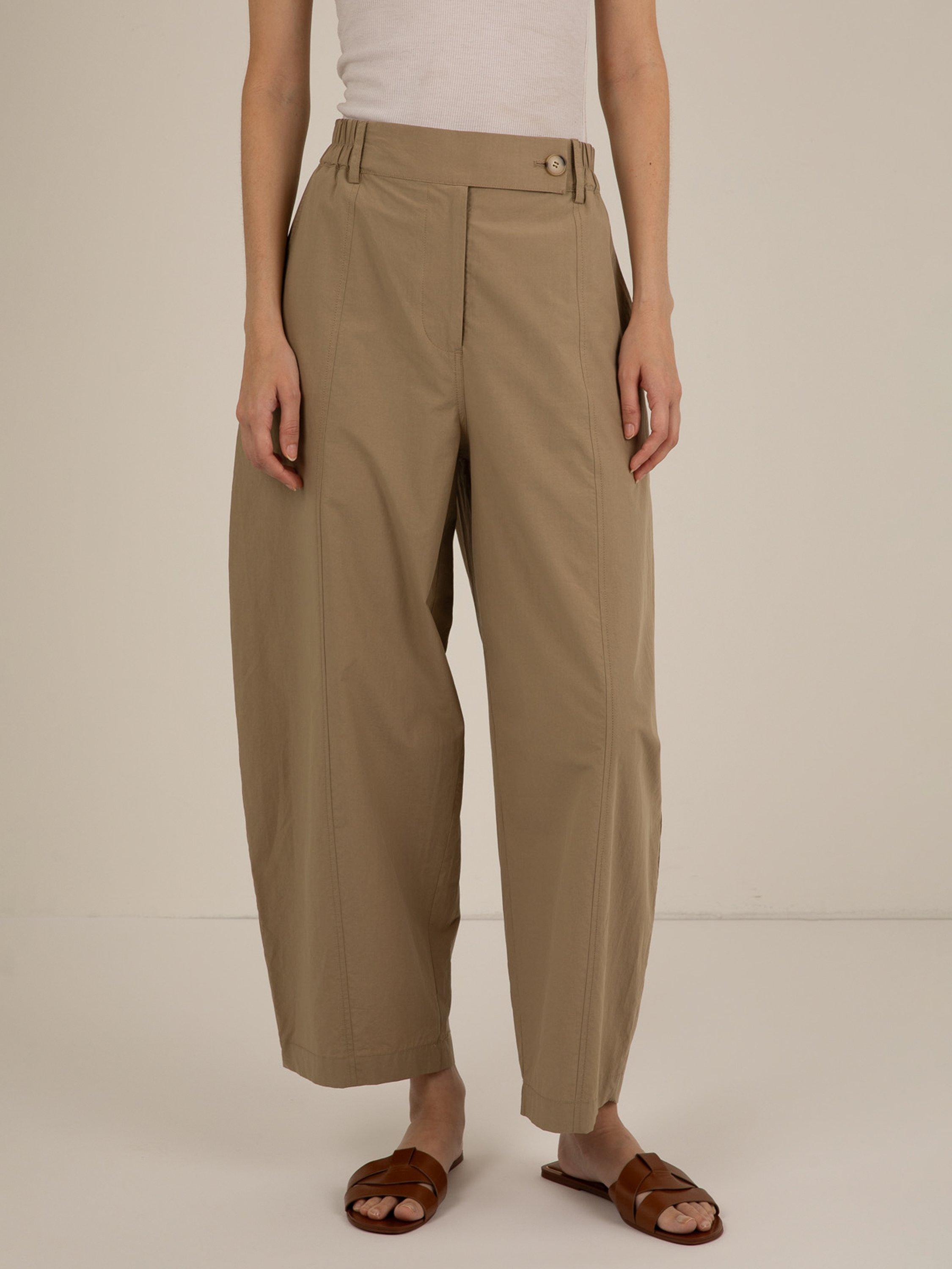 A pair of tapered barrel leg trousers by VIVERE, crafted from pure cotton with a mid-rise structured waistband. Finished with clean side-seam pockets and a pressed front crease, they offer an effortless, modern silhouette with a refined, tailored feel.