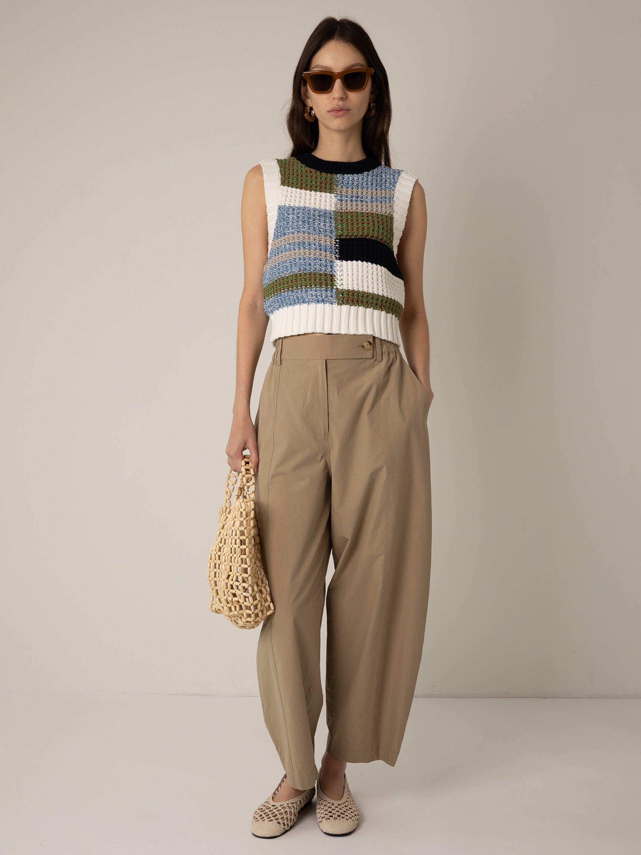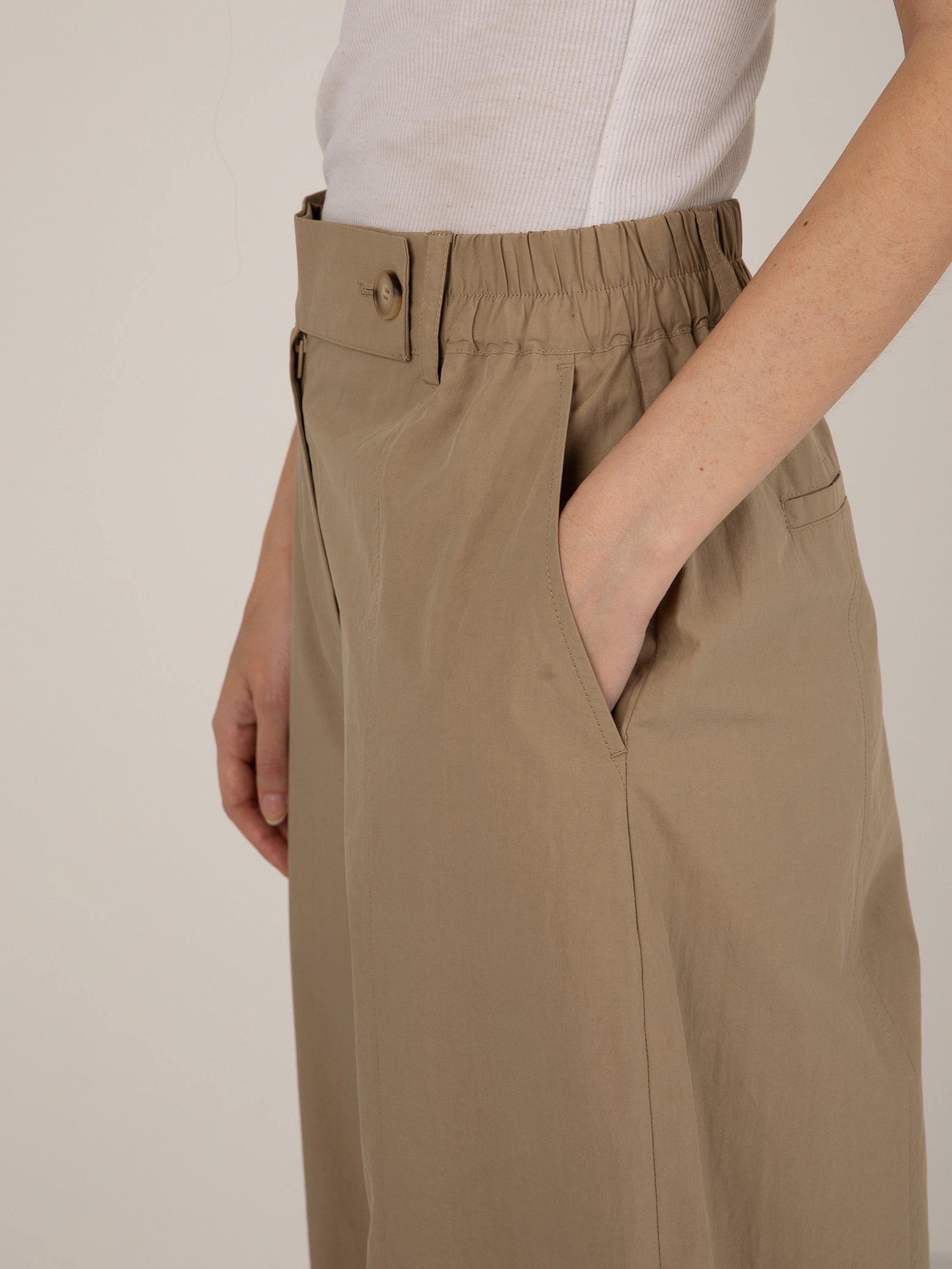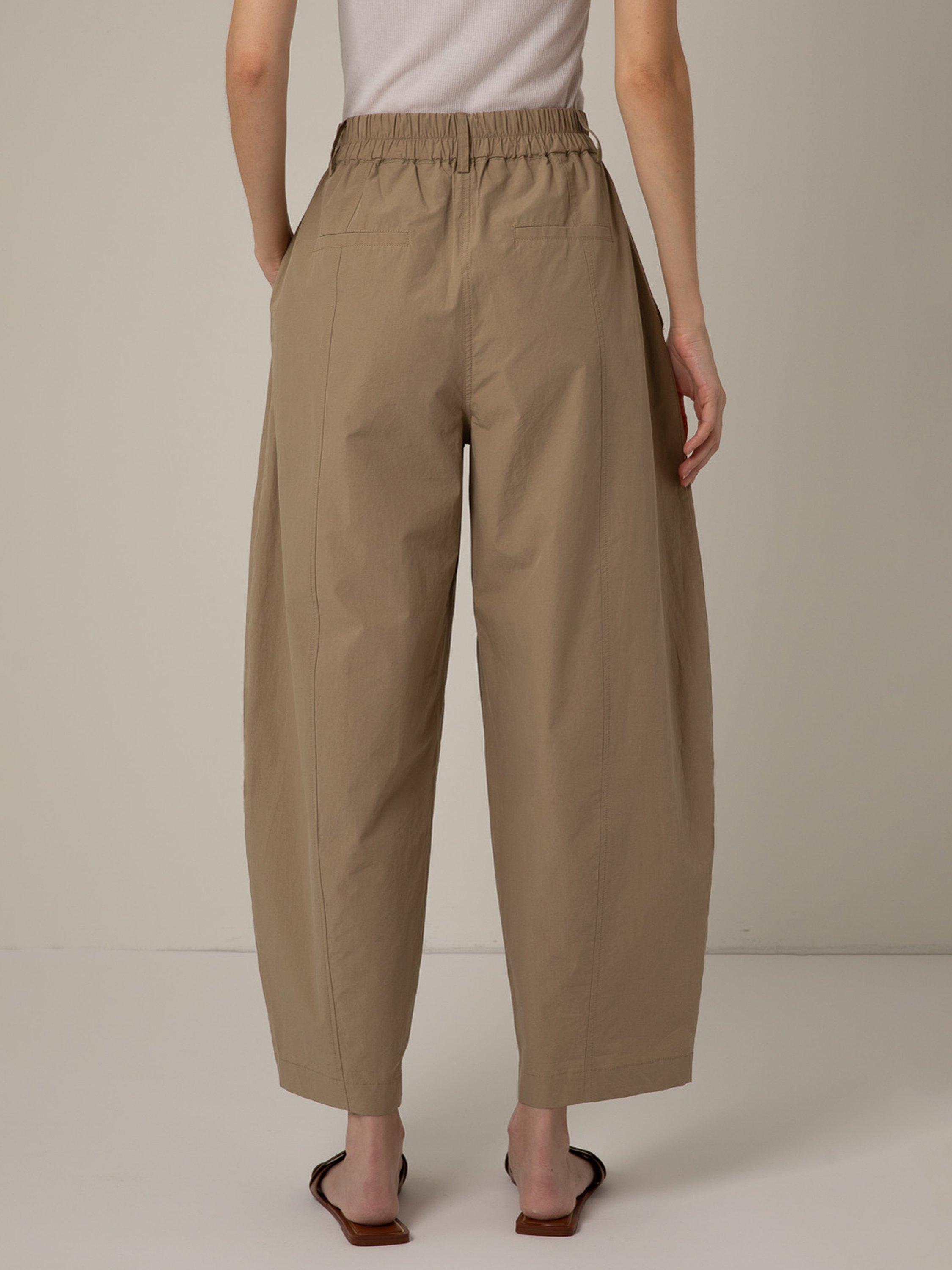 A pair of tapered barrel leg trousers by VIVERE, crafted from pure cotton with a mid-rise structured waistband. Finished with clean side-seam pockets and a pressed front crease, they offer an effortless, modern silhouette with a refined, tailored feel.