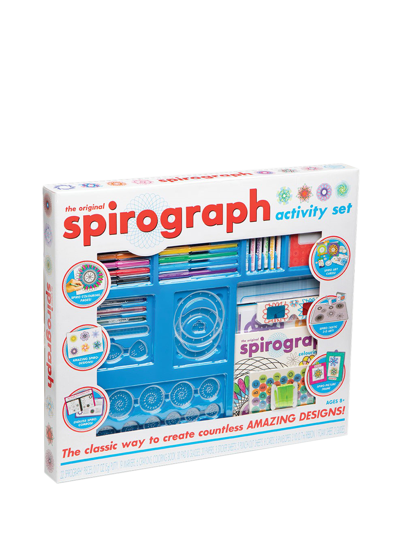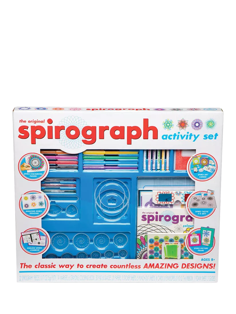 Everyone can have hours of creative fun with the amazing Spirograph Mega Activity Set. This set features all the iconic wheels and rings of the original Spirograph set, updated for today. Choose from the gears and wheels, put your paper in place, and create whirling, spiralling, mix and match patterns for totally awesome images. Use the guide to try out different designs, or your own cool and colourful graphics. From classic Spirograph drawing to 3D designs and card making, this kit is the perfect way to celebrate the creativity of Spirograph!