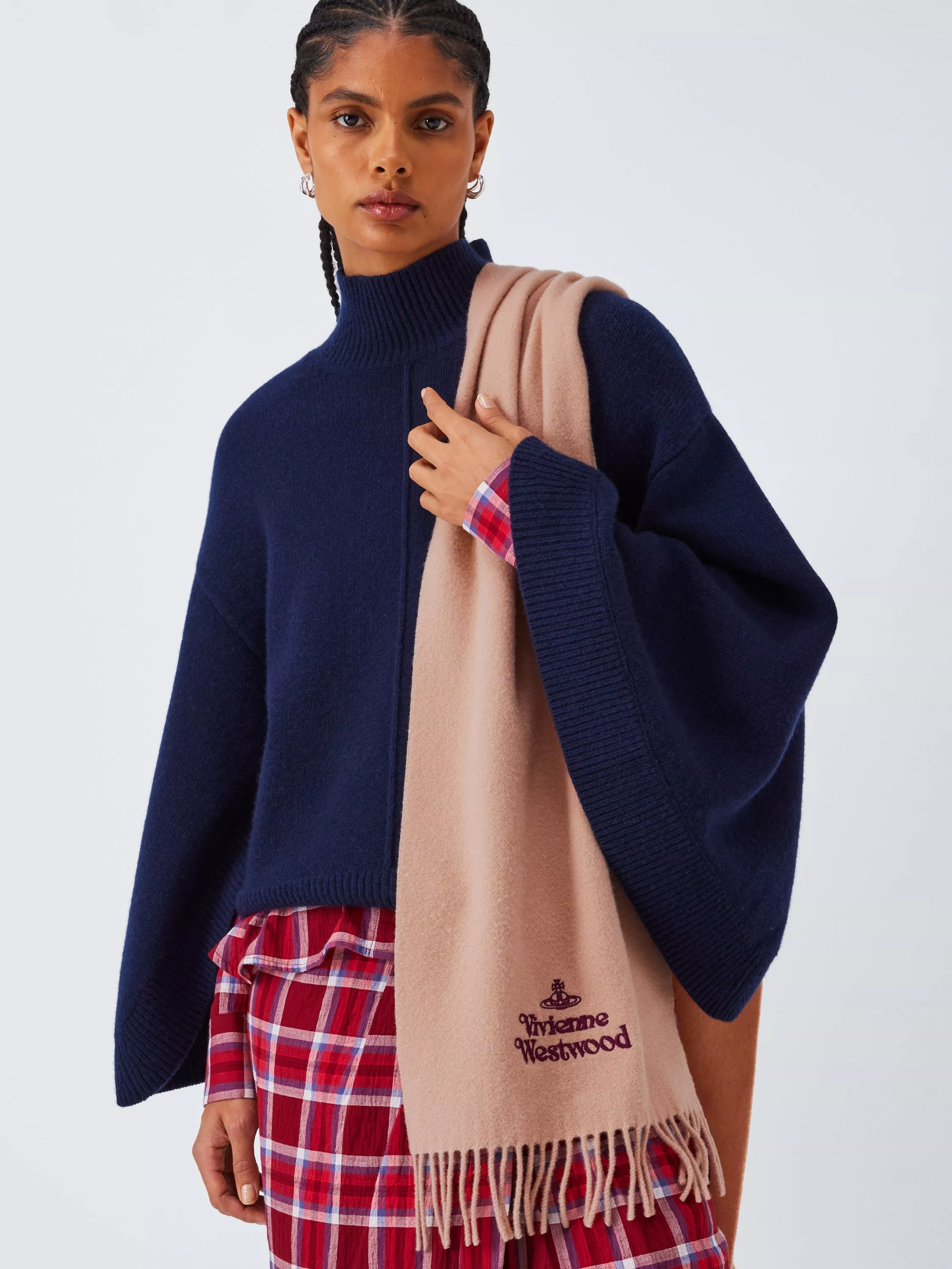 The Vivienne Westwood Embroidered scarf features a soft woollen silhouette, branded with the house's lettering motif at the bottom of the design. The piece offers tassel trims, complete with an embroidered orb, which symbolises tradition, encircled by the celestial rings of Saturn, symbolising the future.