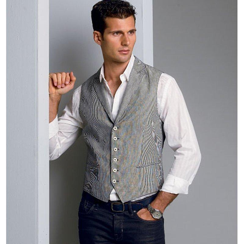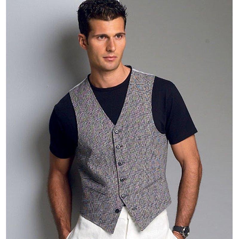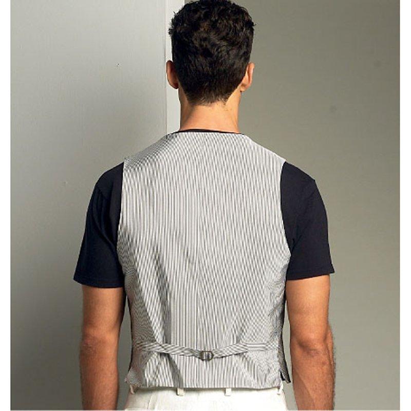 A paper pattern for a close-fitting, lined vest that has shaped front hemline, welt pockets and back tie with purchased buckle. Also features a collar, side panels, side front and back seams. All backs are cut of lining fabric and best fabrics to use are linen blends, gabardine and cotton sateen. Unsuitable for obvious diagonals.