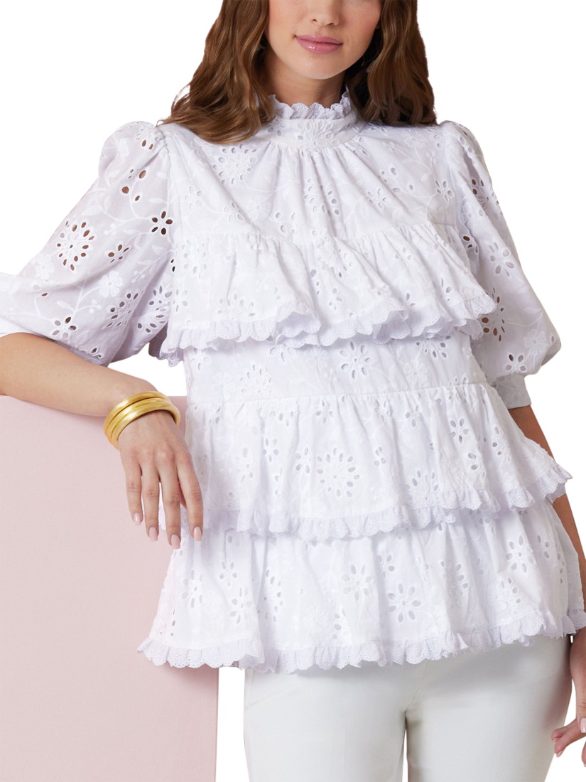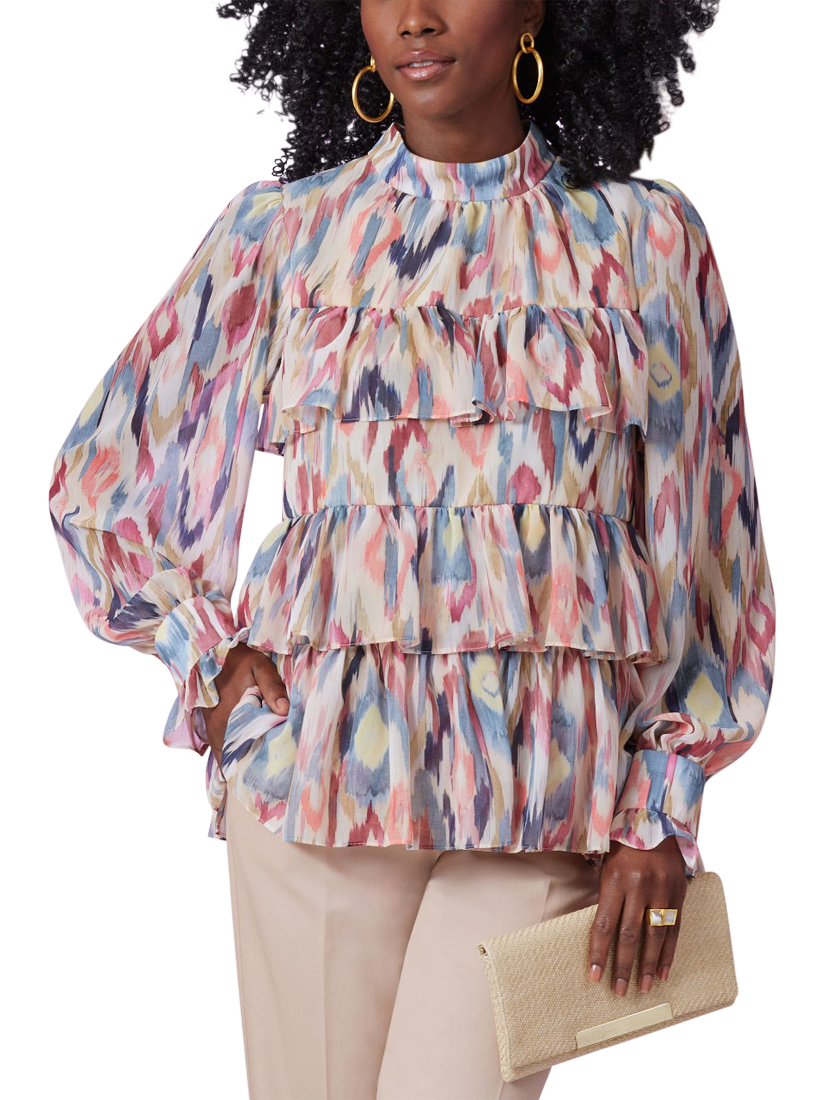 Loose-fitting, ruffled baby doll tops have lined body, stand up collar, front neck gathers, gathered set-in sleeves with button cuffs and back slit opening. Collar fastens with buttons and elastic loops.