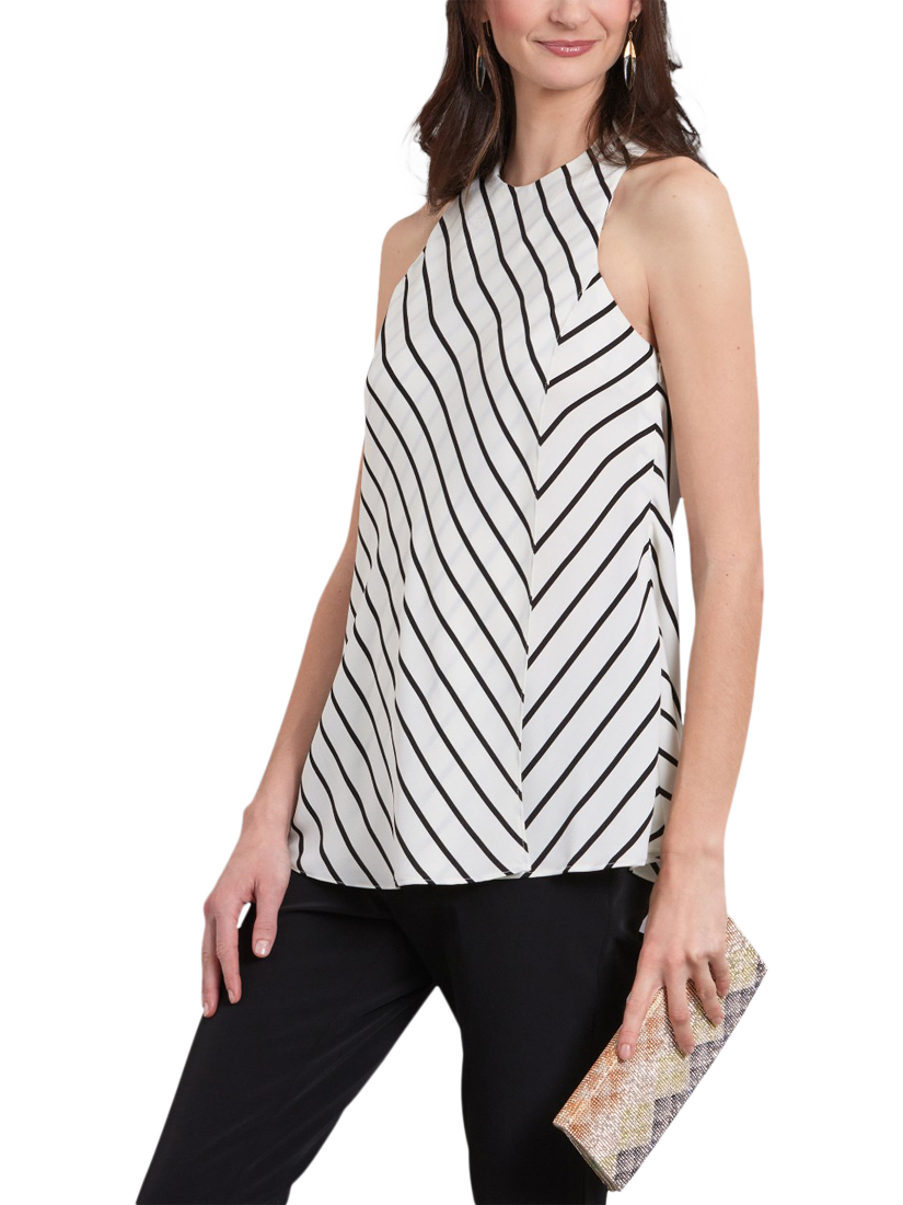 Bias cut tops have layered fronts, invisible side zip, hook and eye closure in back of neck, neck and armhole facings and baby hems. View B has back slit opening.