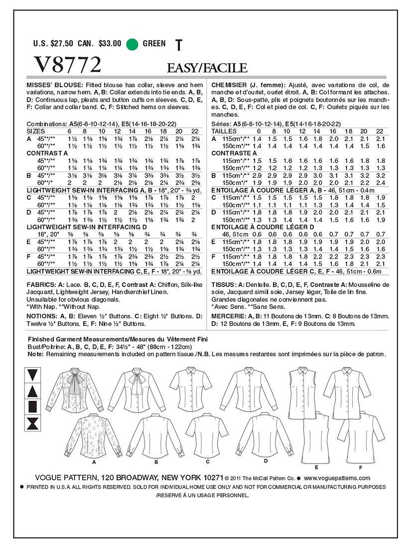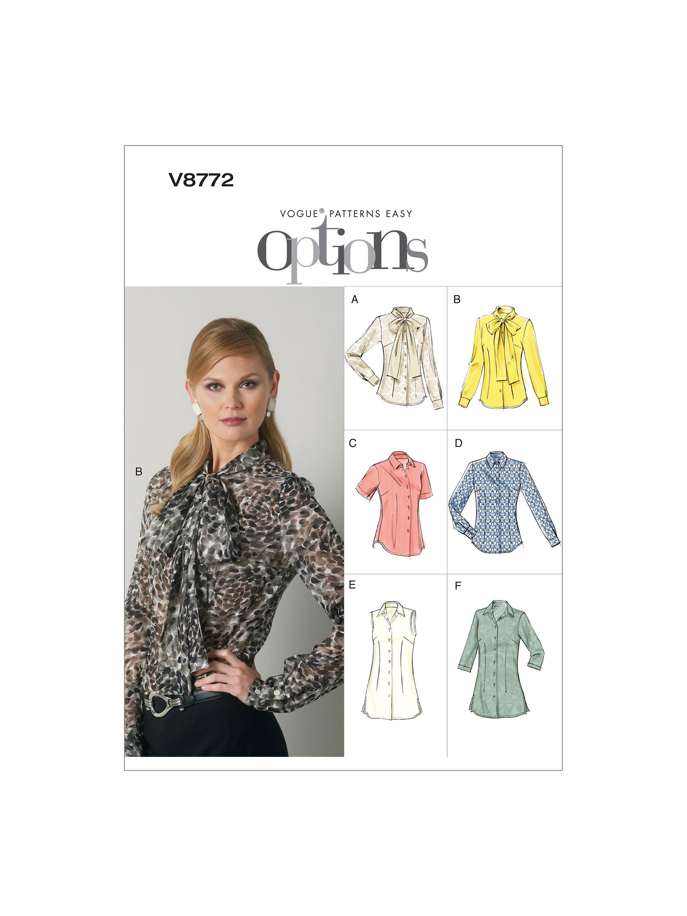 Fitted blouse has collar, sleeve and hem variations, and narrow hem. A and B: collar extends into tie ends. A, B and D: continuous lap, pleats and button cuffs on sleeves. C, D, E and F: collar and collar band. C and F: stitched hems on sleeves.