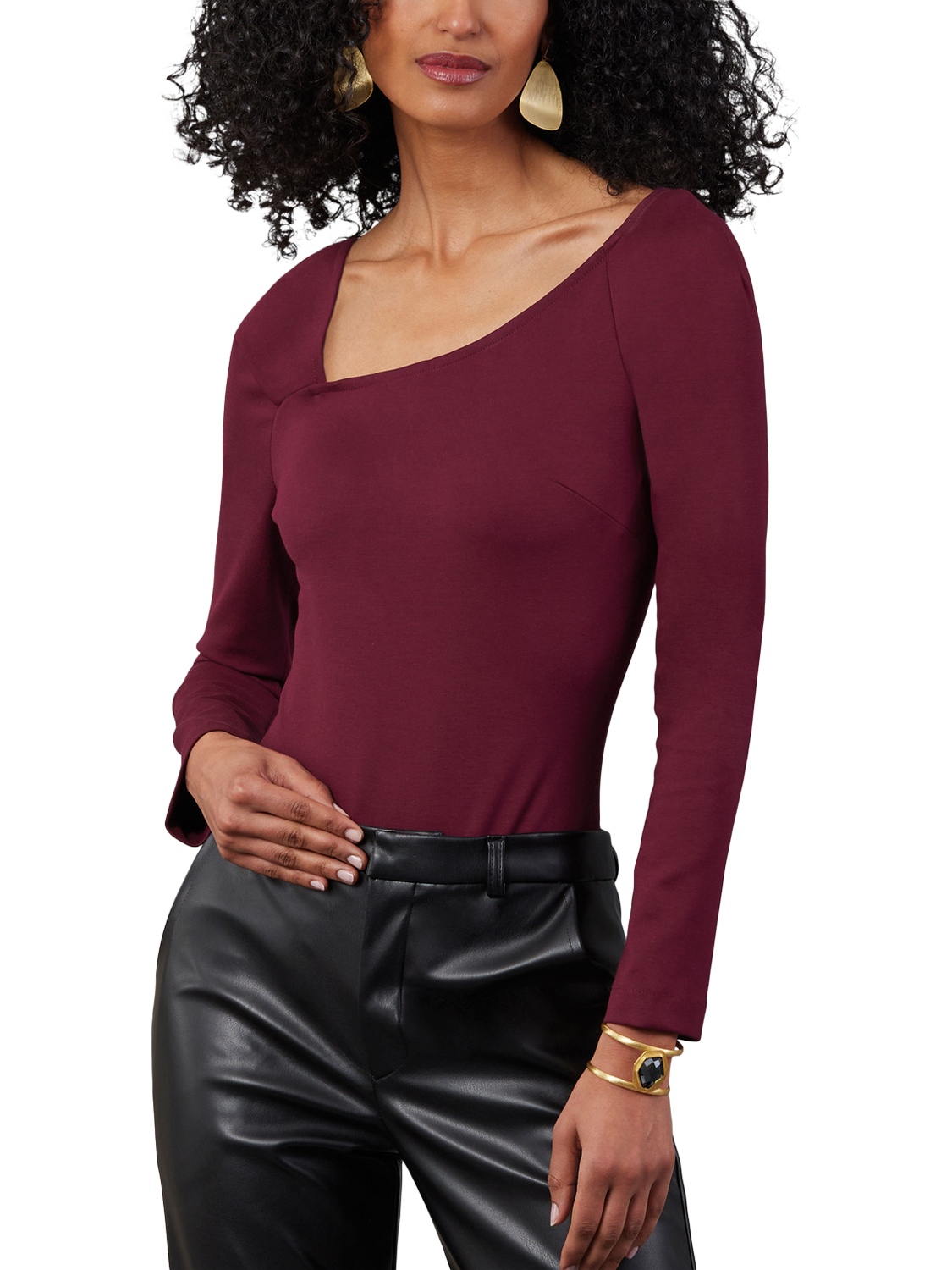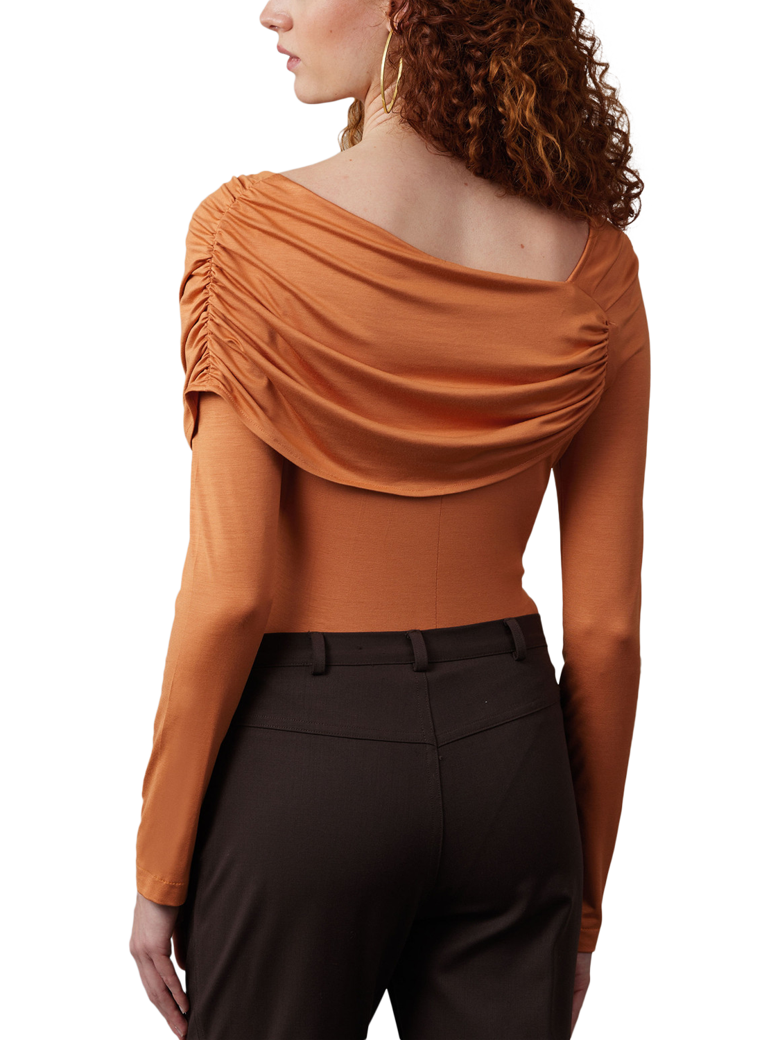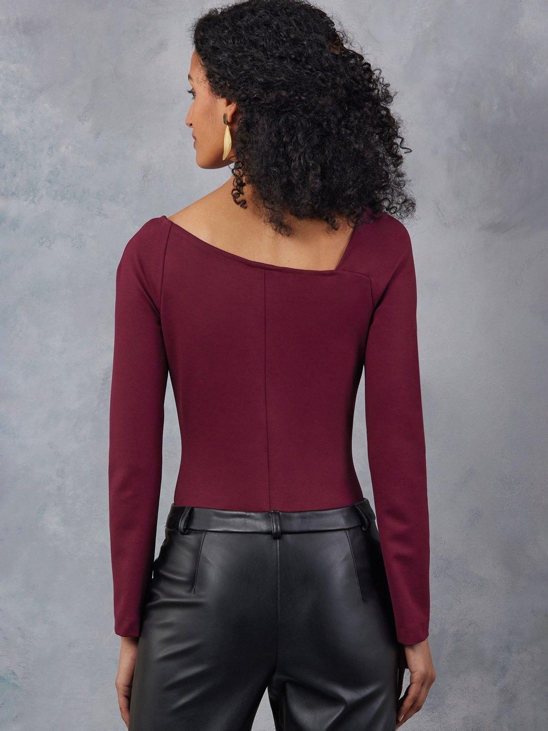 Close-fitting bodysuit has asymmetric neckline stabilised with 1/4" elastic, bust darts, long sleeves and fastens with snap closures. View A has front and back gathered drape pulled through loop.