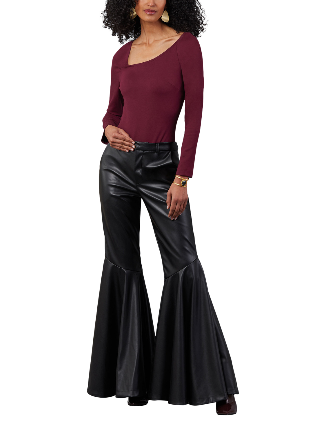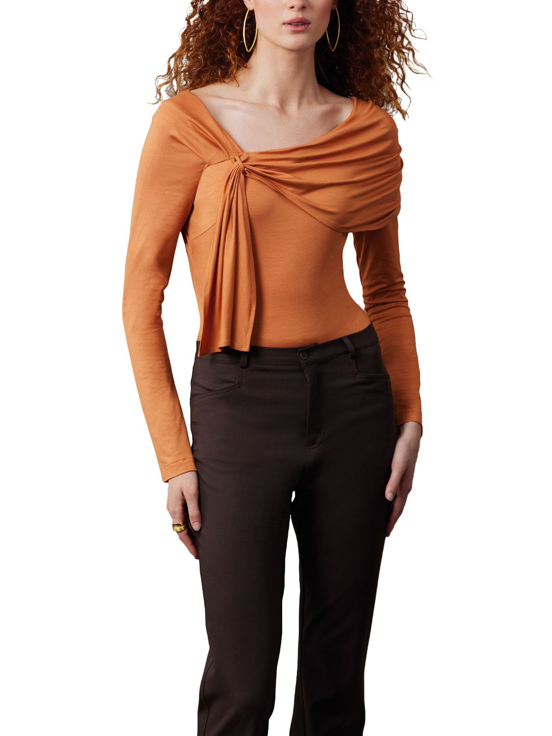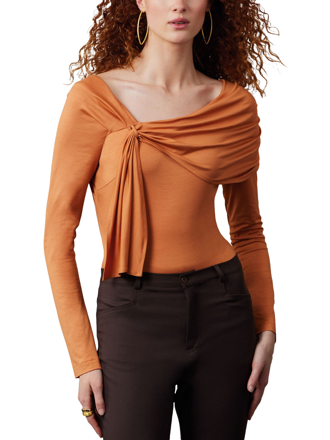 Close-fitting bodysuit has asymmetric neckline stabilised with 1/4" elastic, bust darts, long sleeves and fastens with snap closures. View A has front and back gathered drape pulled through loop.