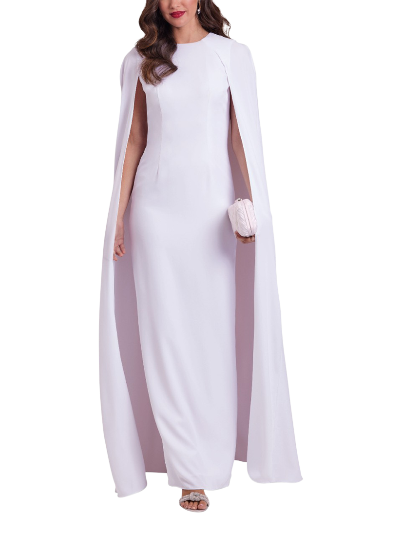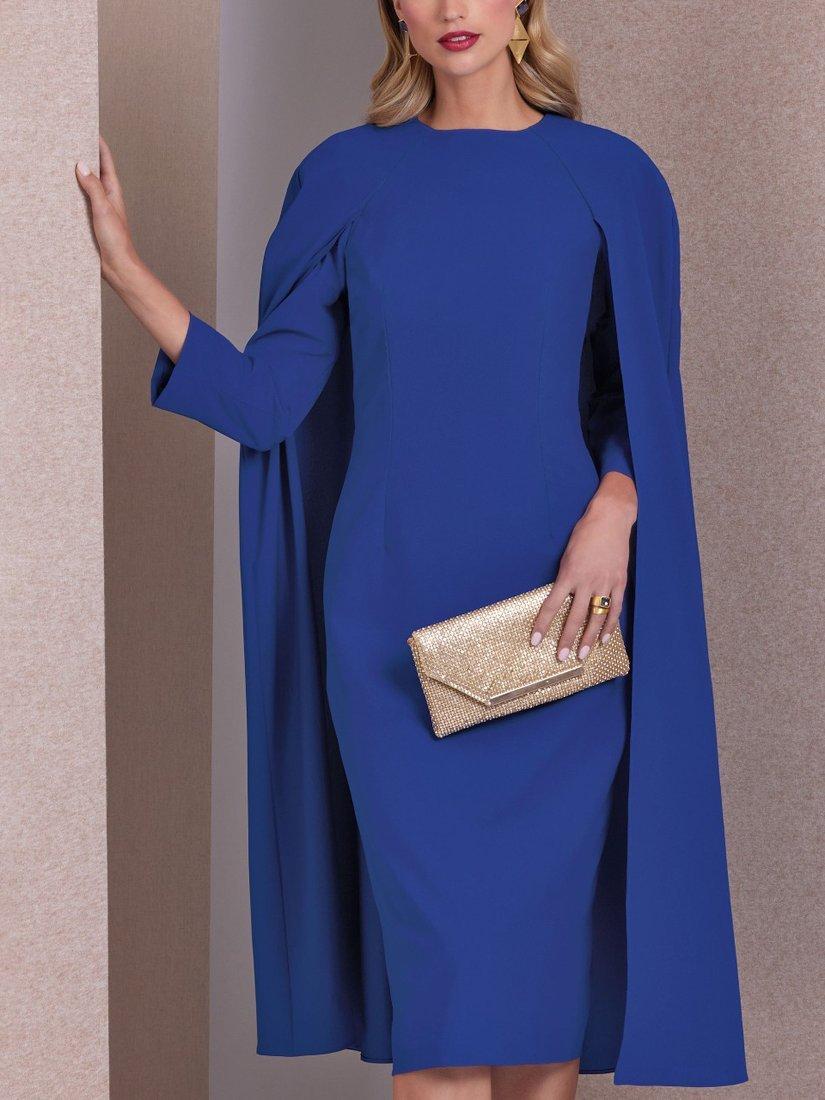 Fitted, lined cape dress has jewel neckline, front waist and bust darts, back princess seams, back slit and invisible back zip.
