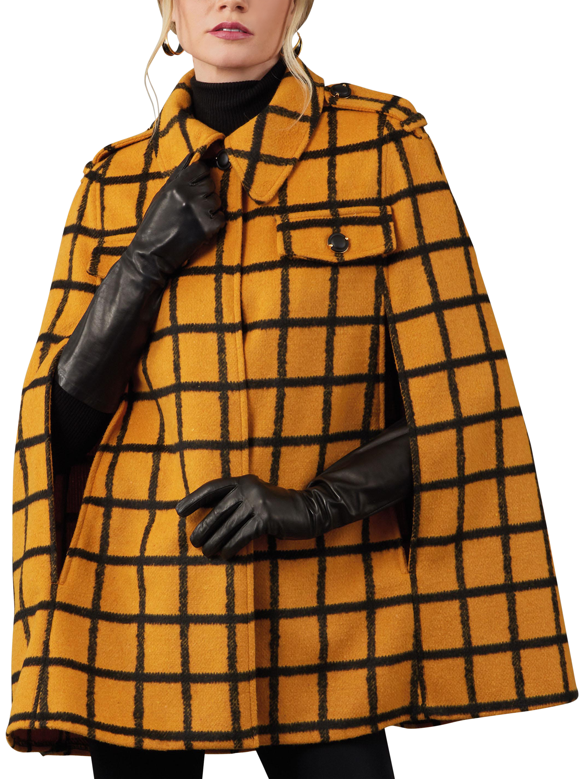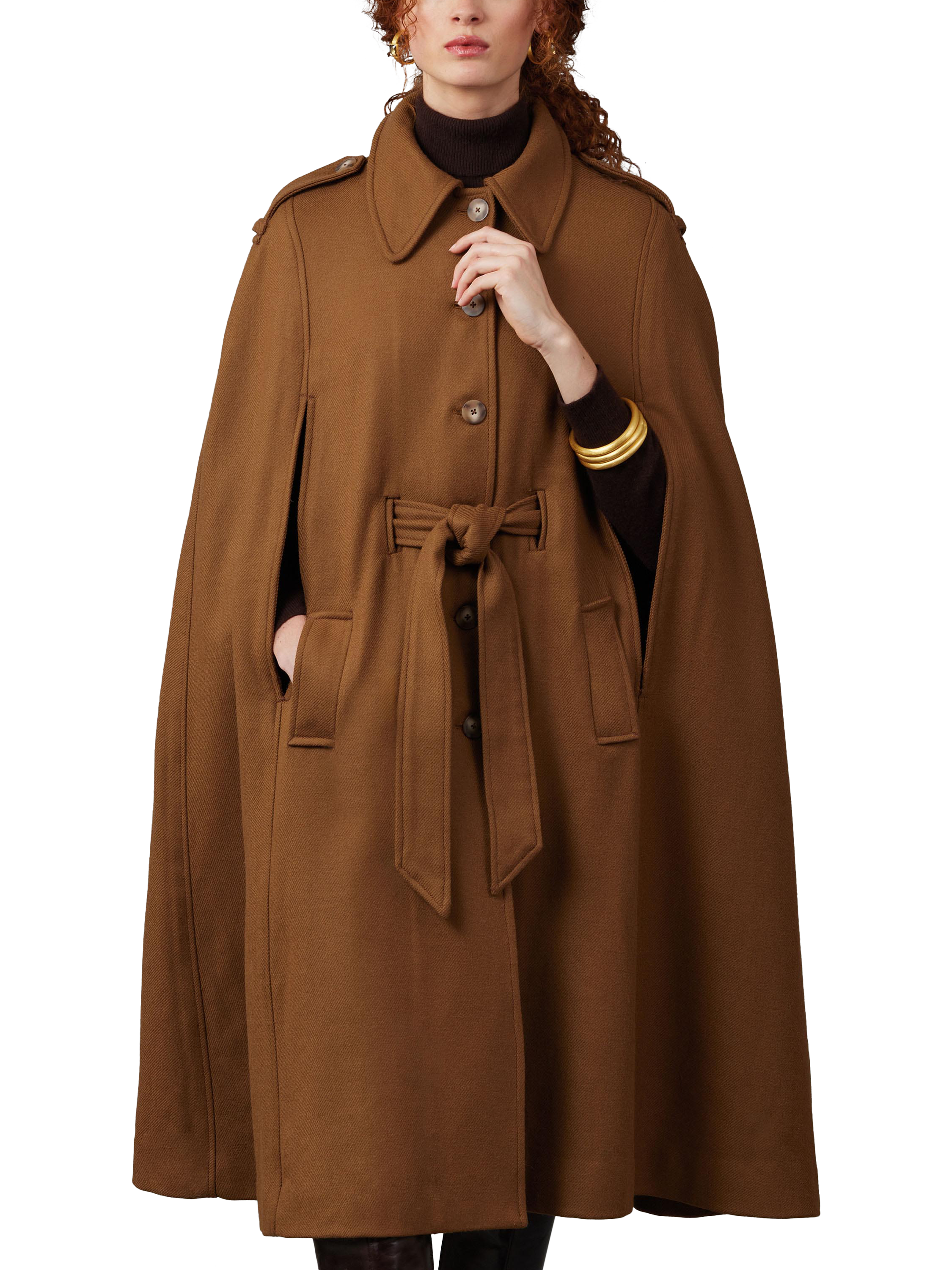 Unlined capes have pointed collar, front slit openings, collar stand, epaulettes, button front closure and topstitching.