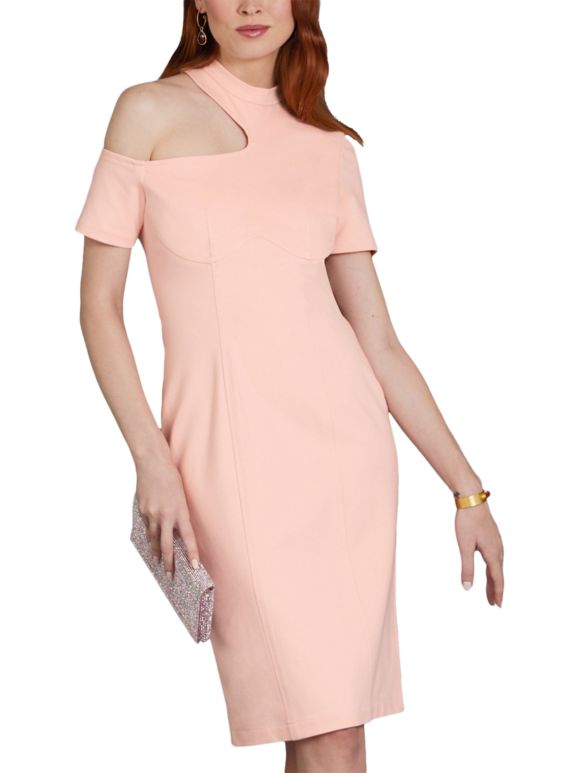 Close-fitting dress with cut-out shoulder design has under bust and princess seams with topstitching, invisible side seam zip, back vent and stitched hems.