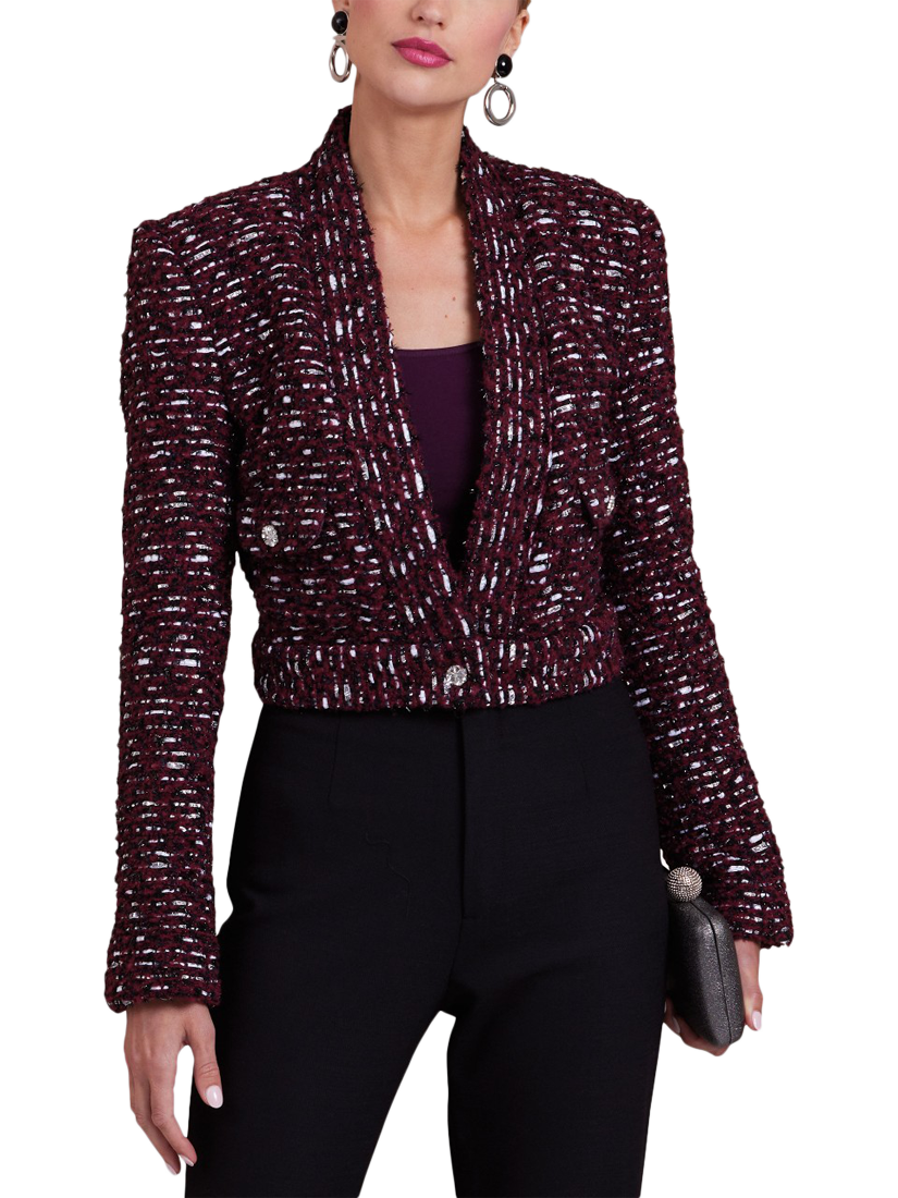 Fitted, cropped jackets have extended shoulders, shoulder pads and two-piece sleeves. View A has below elbow length sleeves and patch pockets. View B has long sleeves with working vents and patch pockets with flaps.