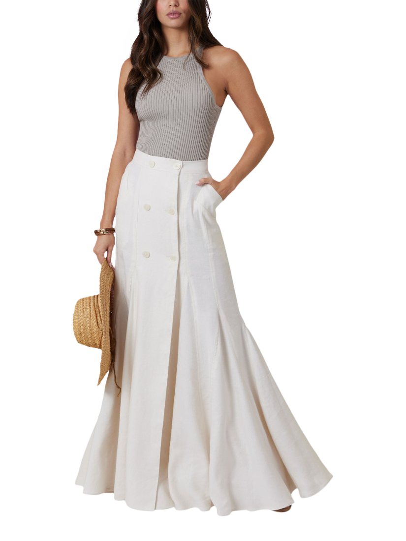 Fitted, unlined skirt has double-breasted front button opening, welt pockets and topstitching.