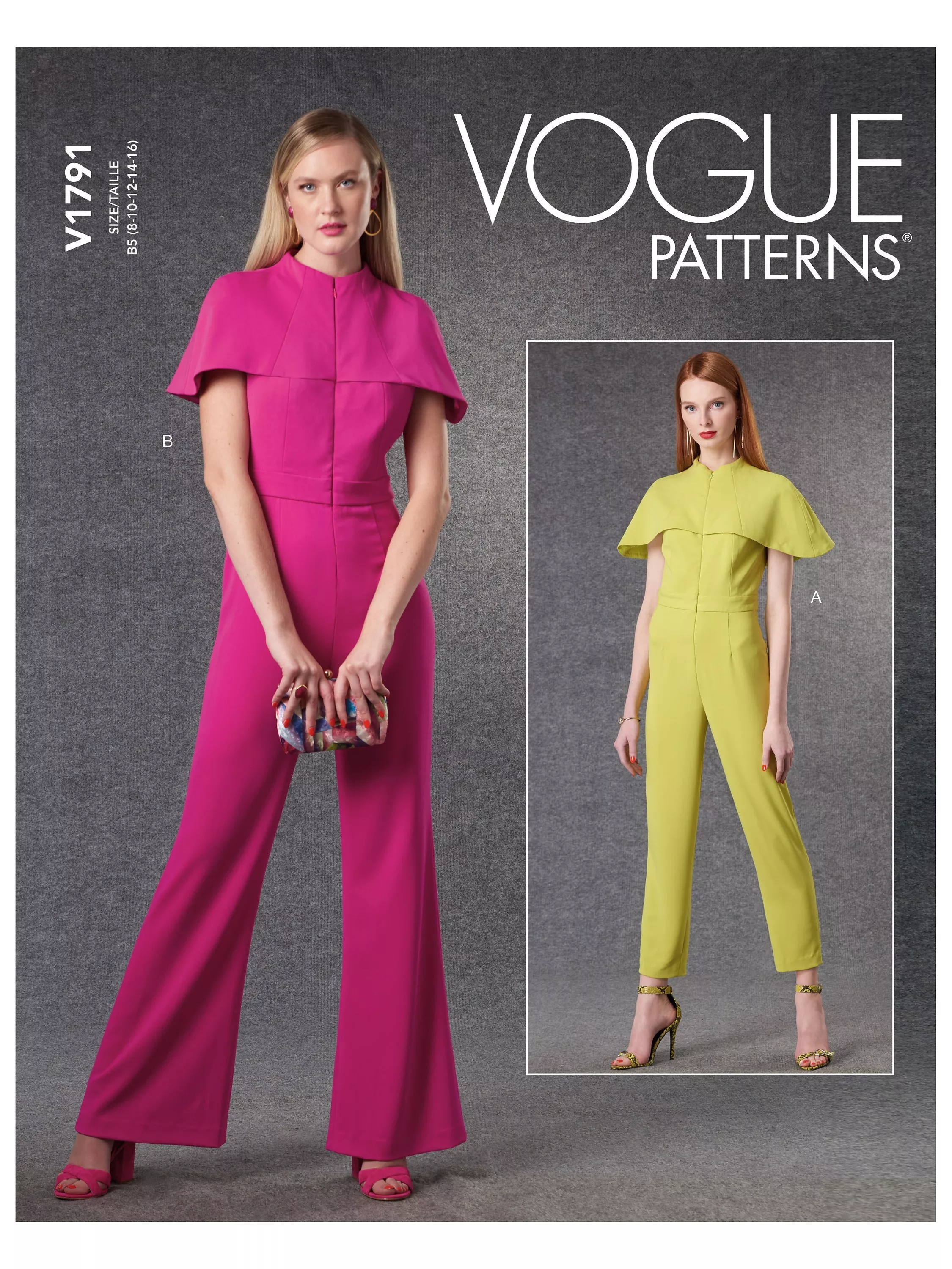 A Vogue Misses' sewing pattern for a fitted sleeveless jumpsuit with a lined to edge bodice, raised neck, attached lined capelet, invisible front zipper and leg variations.