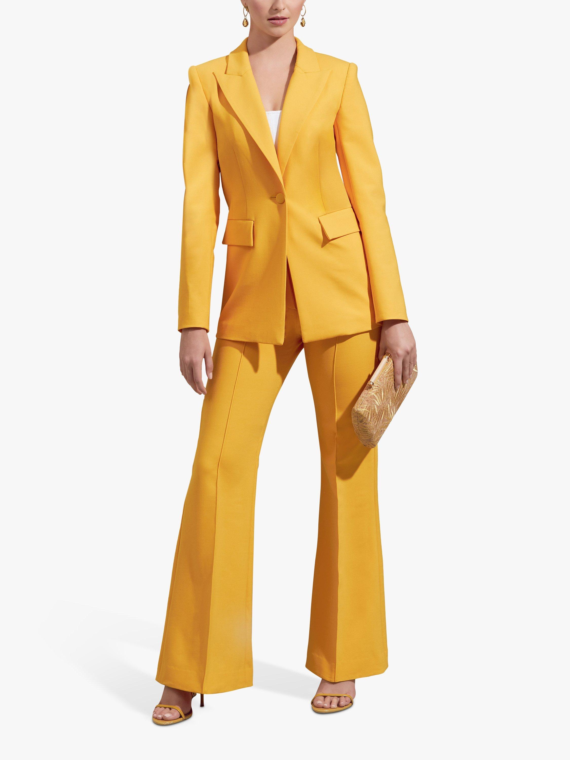 Semi-fitted, high-rise trousers have flared legs, stitched front crease, fly zip, contour waistband with hook and bar closure.