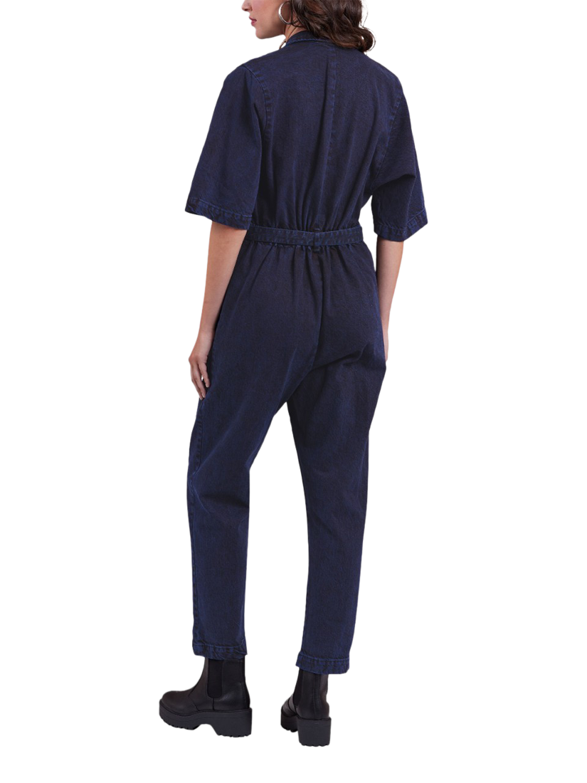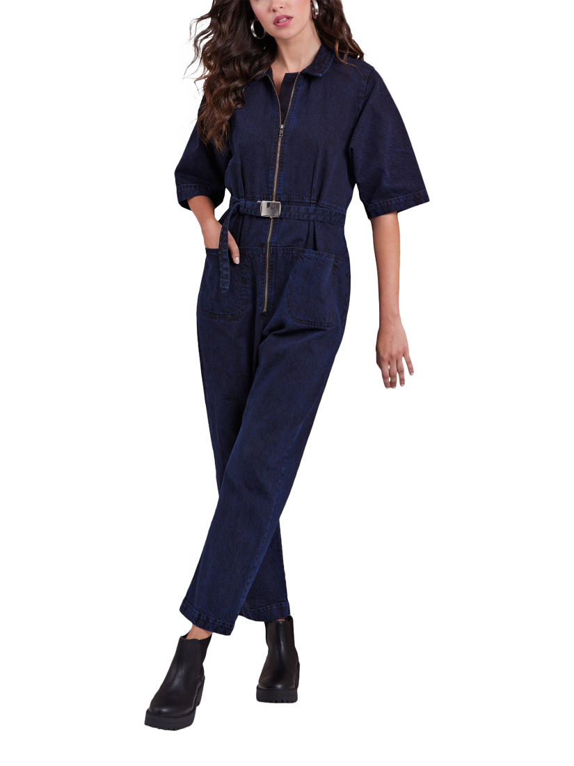 Loose-fitting jumpsuit with belt has front waist pleats, exposed front zip, pointed collar, front pockets, elastic back waist, topstitching and stitched hems.