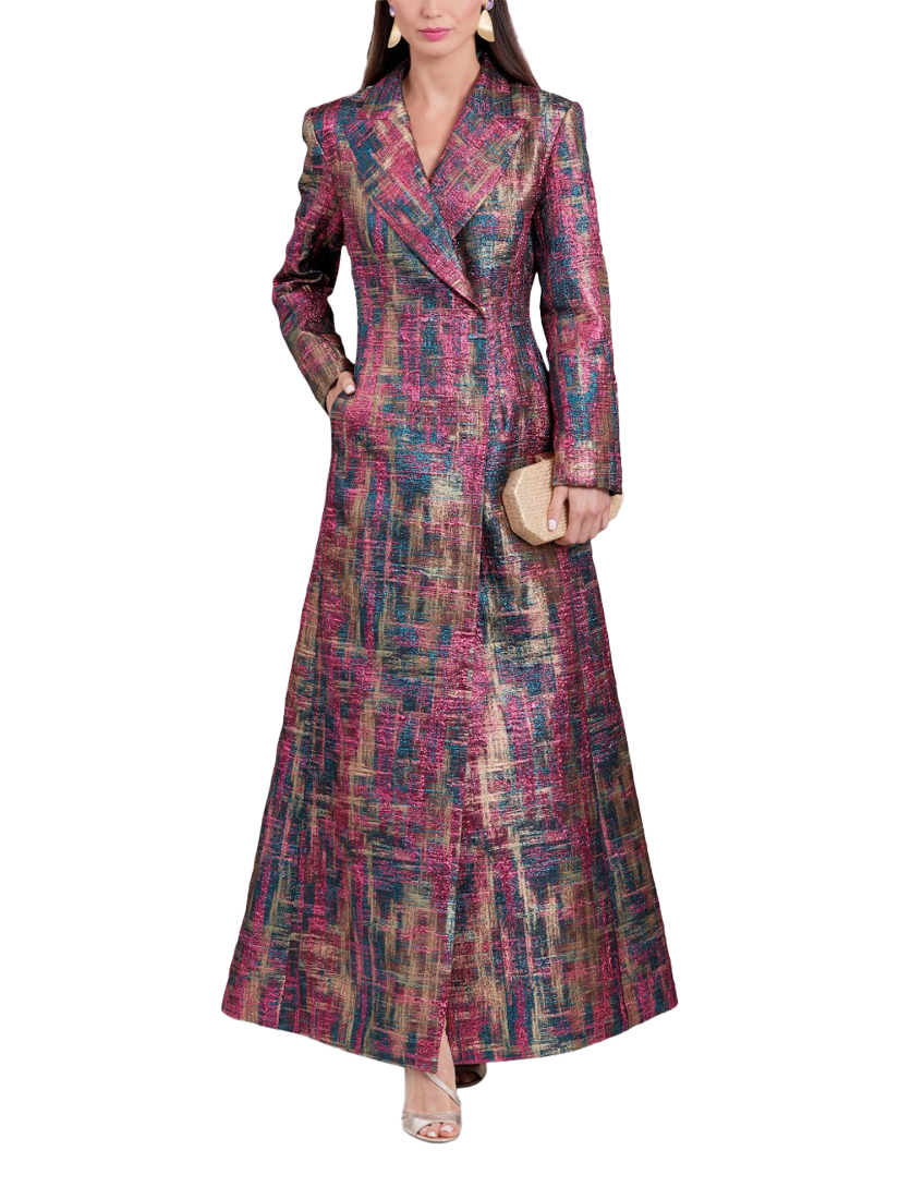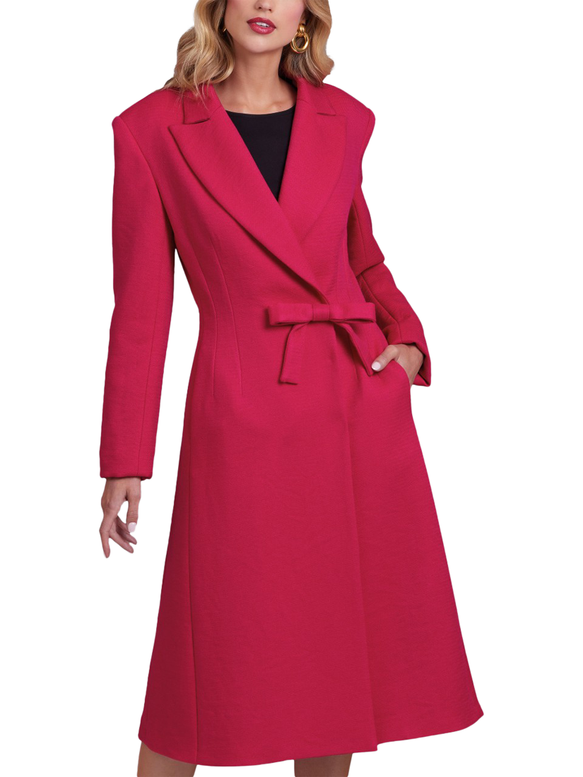 Lined coat has peak lapels, extended shoulders, shoulder pads, two-piece sleeves, waist darts, front in-seam pockets, concealed snap front closure and back vent.