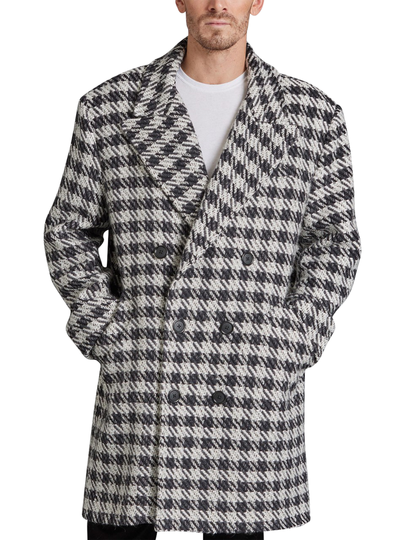 Loose fitting, lined coat with wide peak lapels has extended shoulders with shoulder pads, welt pockets, back vent, two piece sleeves with button vents and topstitching.