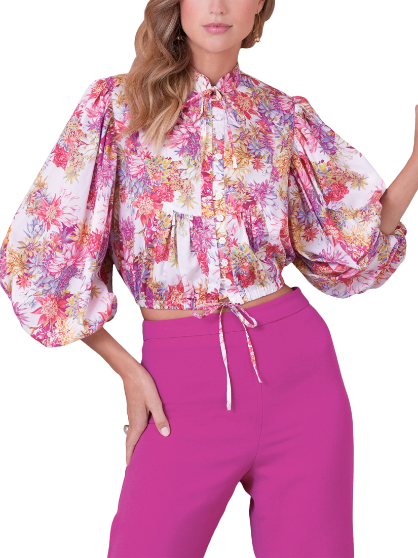 Loose-fitting top has gathered sleeves, and button with bias loop front closure.