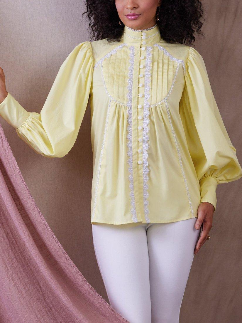 View A is cropped and has elastic waist, front ties, and three-quarter sleeves with elastic hems. View B has long sleeves, cuffs with button and bias loop closure, continuous lap opening, and lace trim.