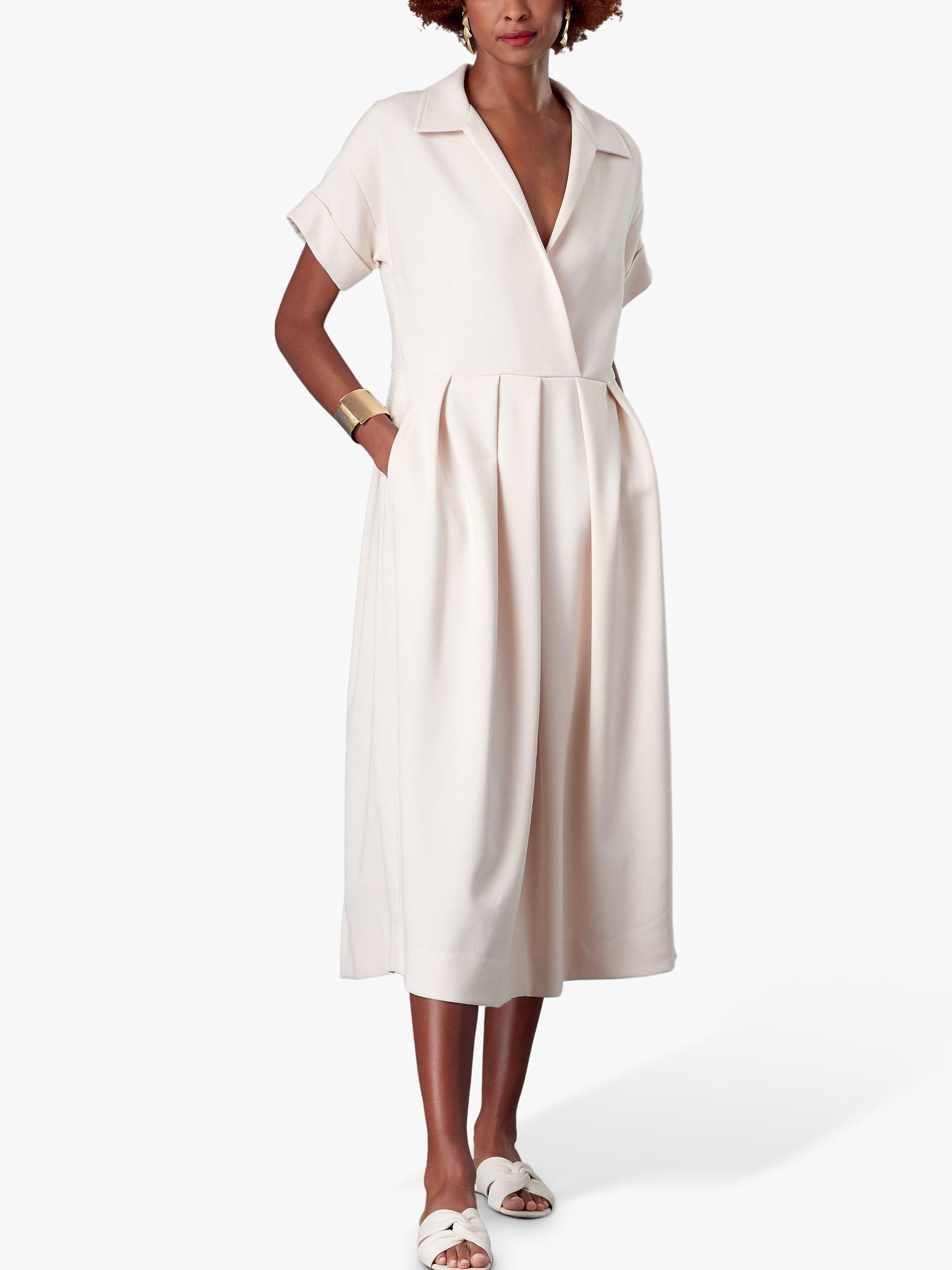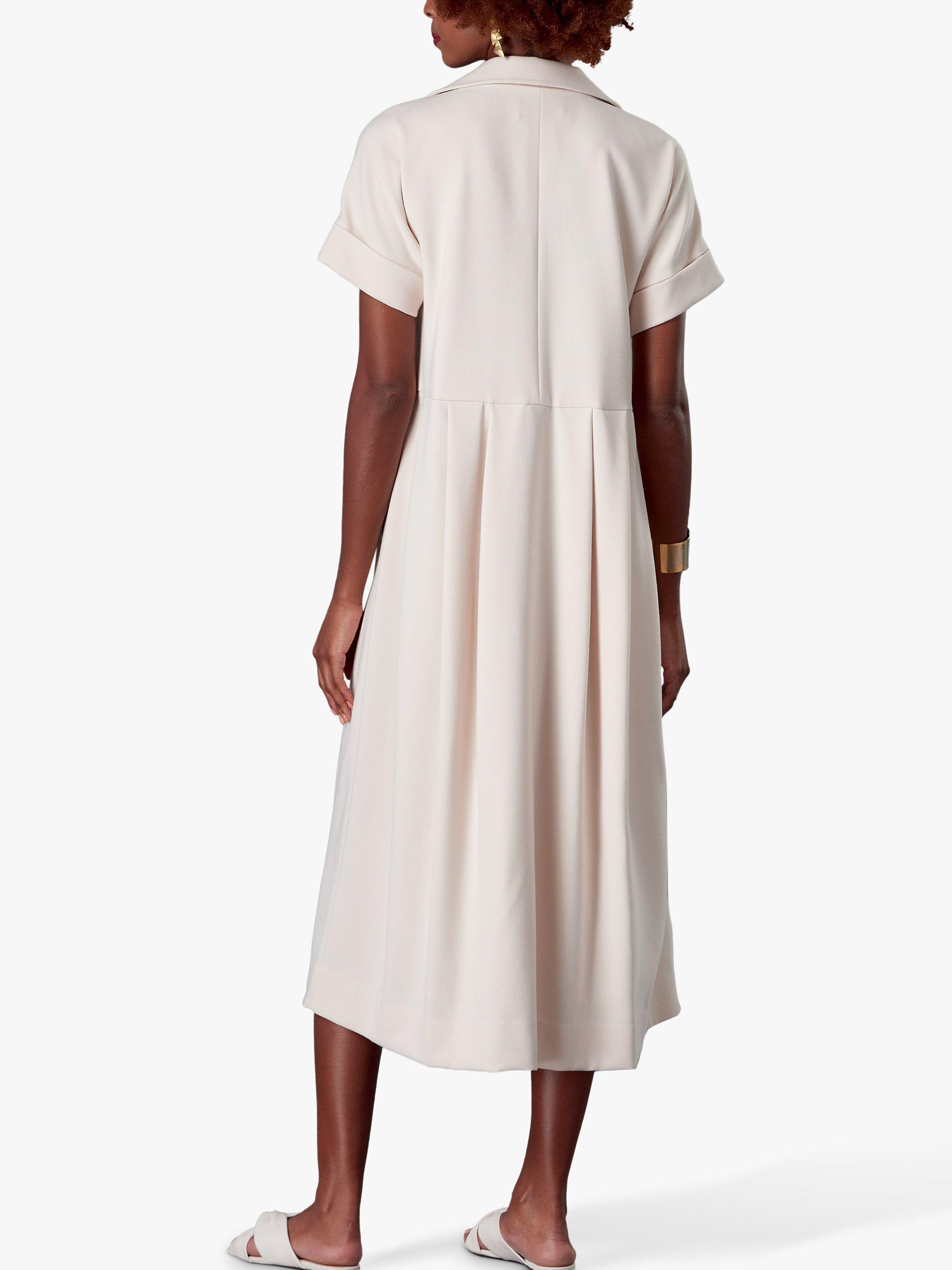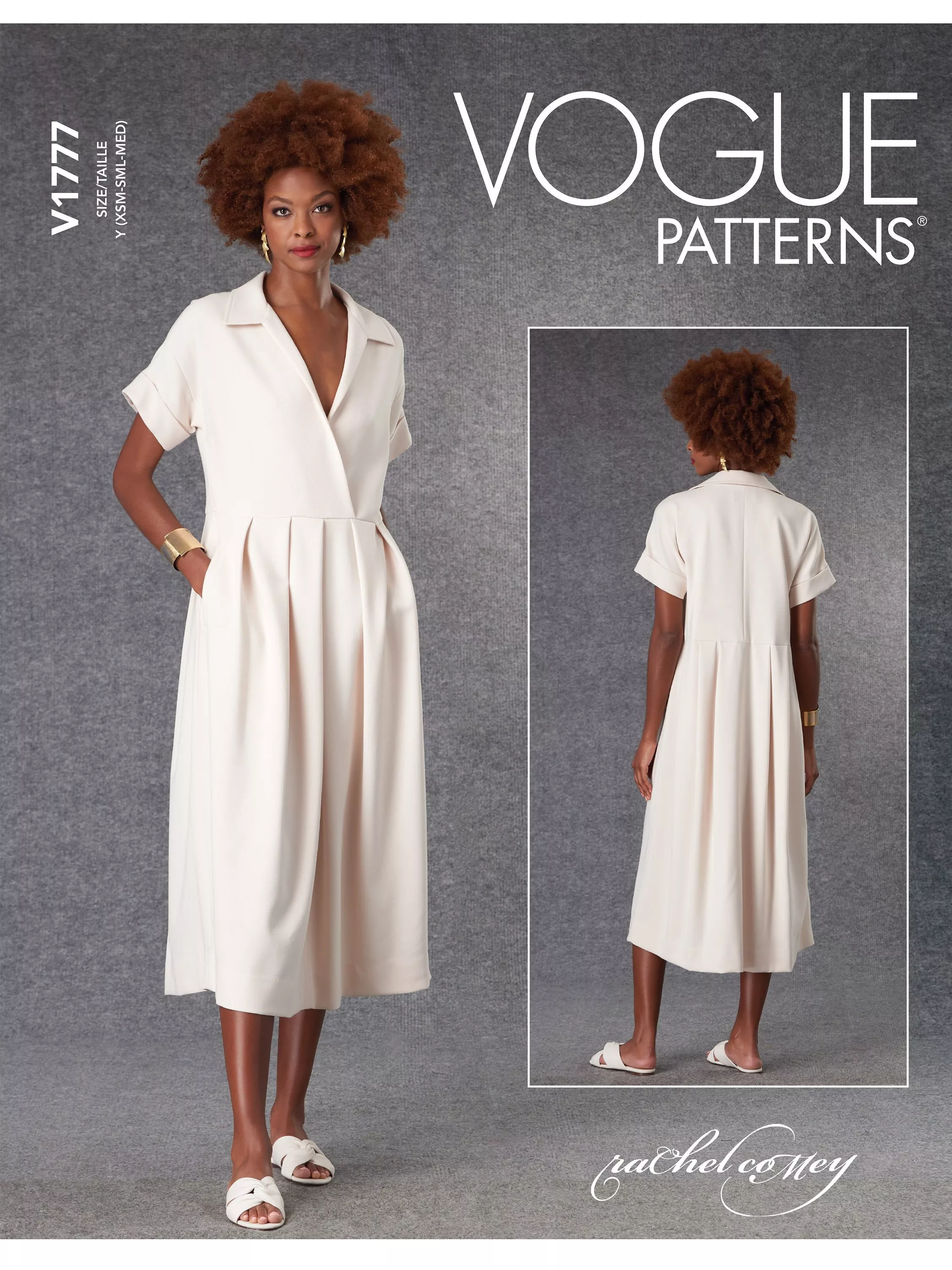 A Vogue Misses' sewing pattern for a loose-fitting, partially lined pullover dress with dropped shoulders, short sleeves with turn-back cuffs, bust darts, waistline pleats and welt pockets.