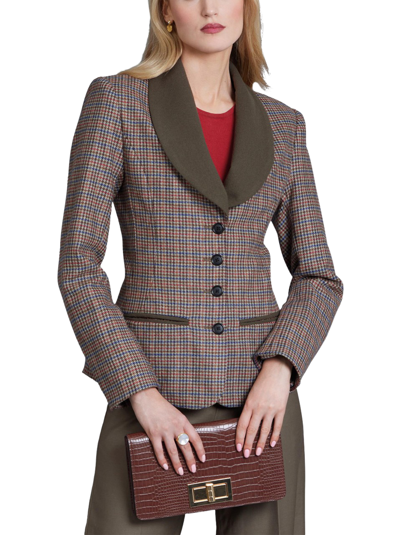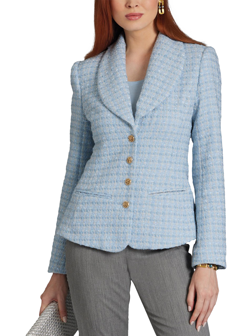 Semi-fitted, lined jacket has shawl collar, princess seams, slightly extended shoulders with shoulder pads, front pockets, side panels (no side seams) and long two piece sleeves with buttoned vents.