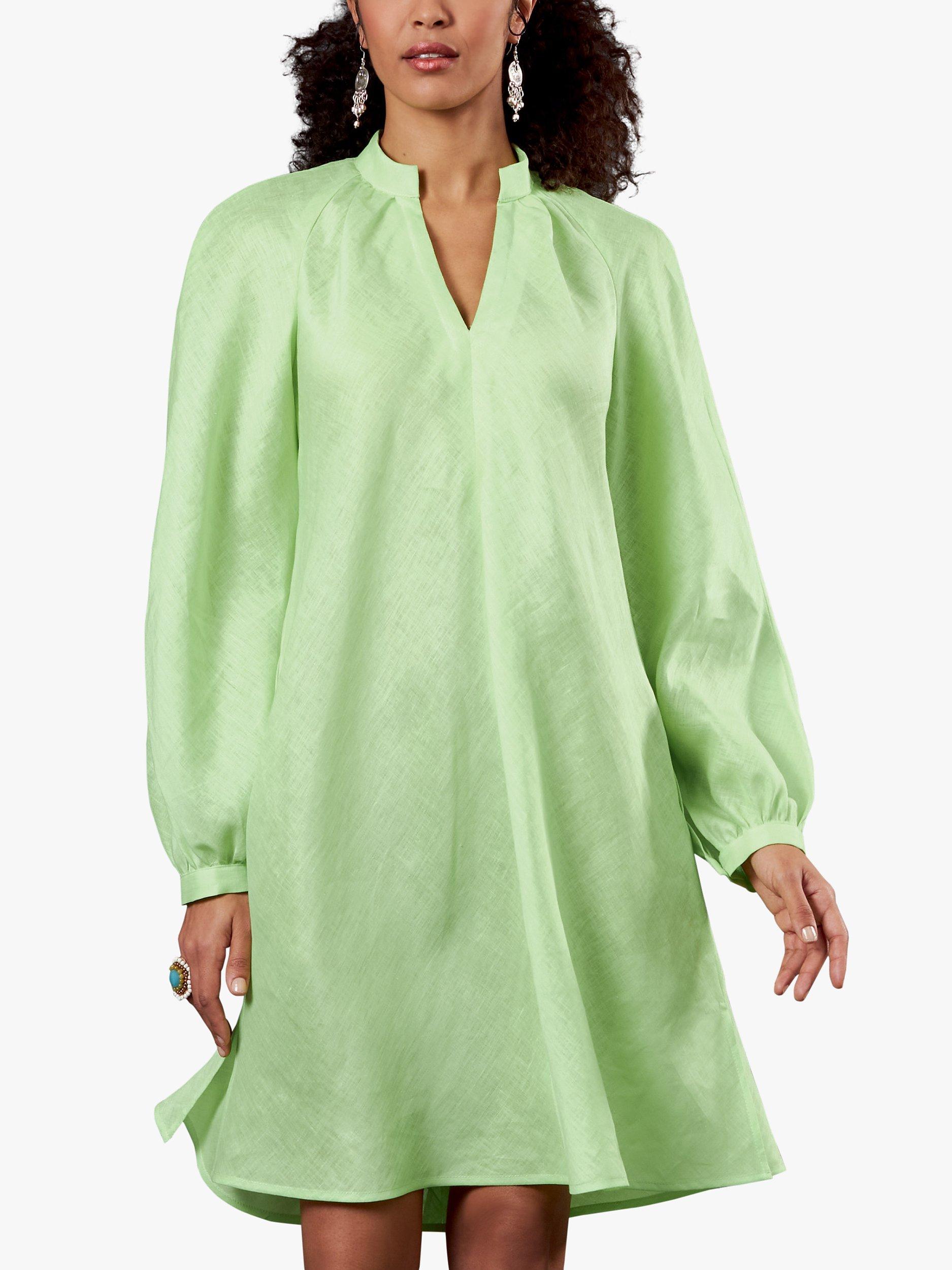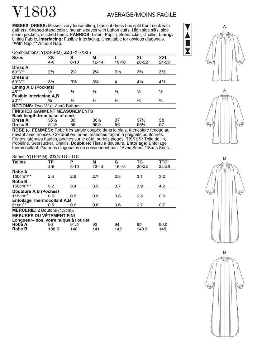 A Vogue Misses' sewing pattern for a very loose-fitting bias-cut dress with a split front neck with gathers, shaped stand collar, raglan sleeves with button cuffs, high side slits, side seam pockets and stitched hems.