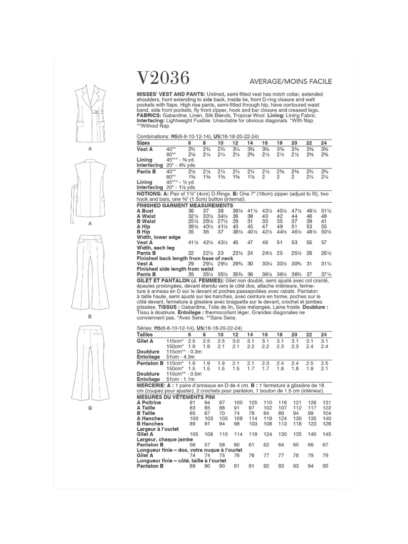 SimplicityVogue Misses' Vest and Pants Sewing Pattern, V2036