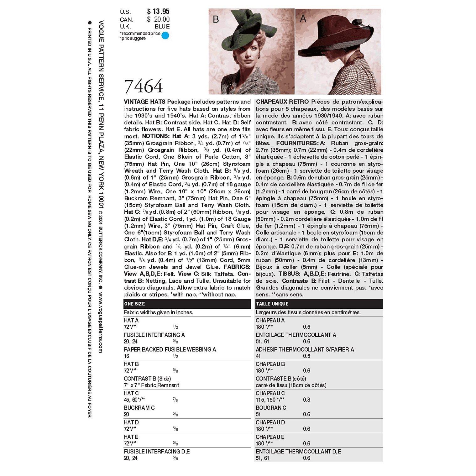 VogueWomen's Accessories Hats Sewing Pattern, 7464