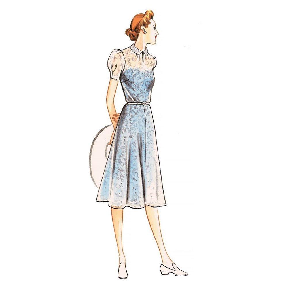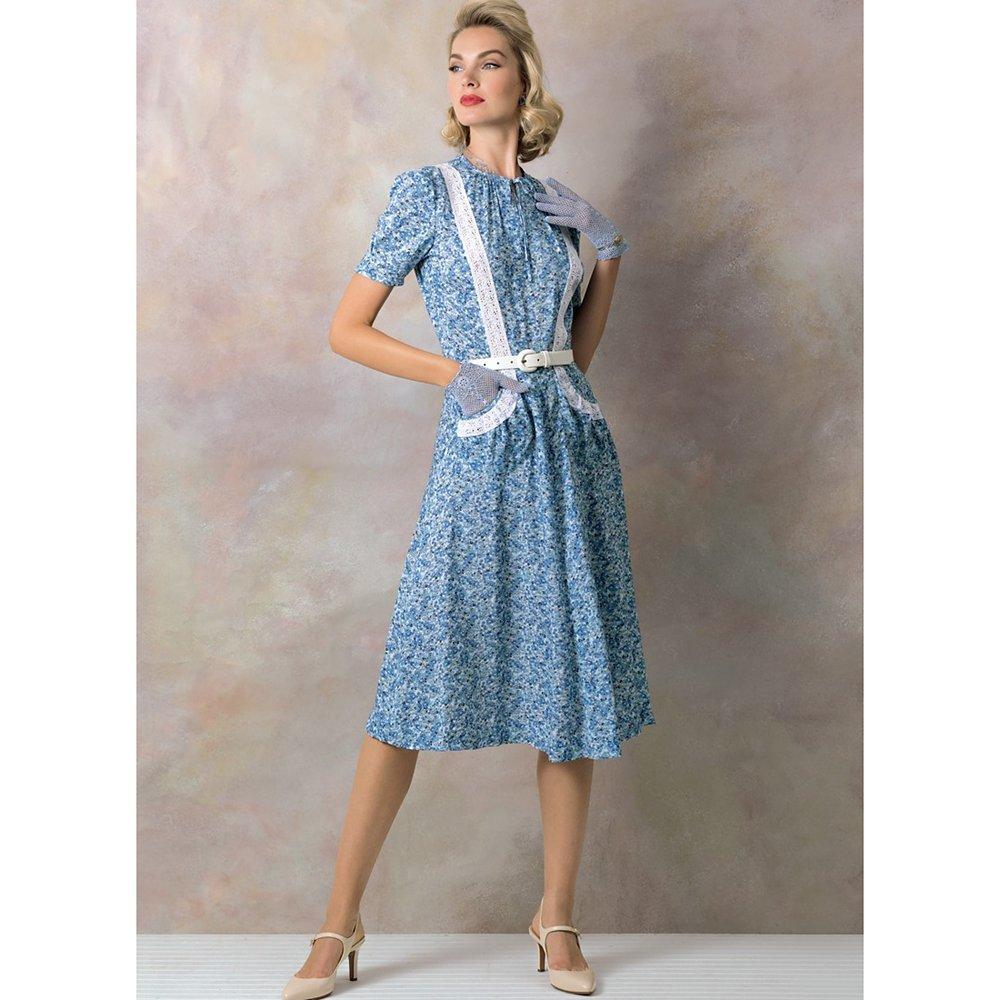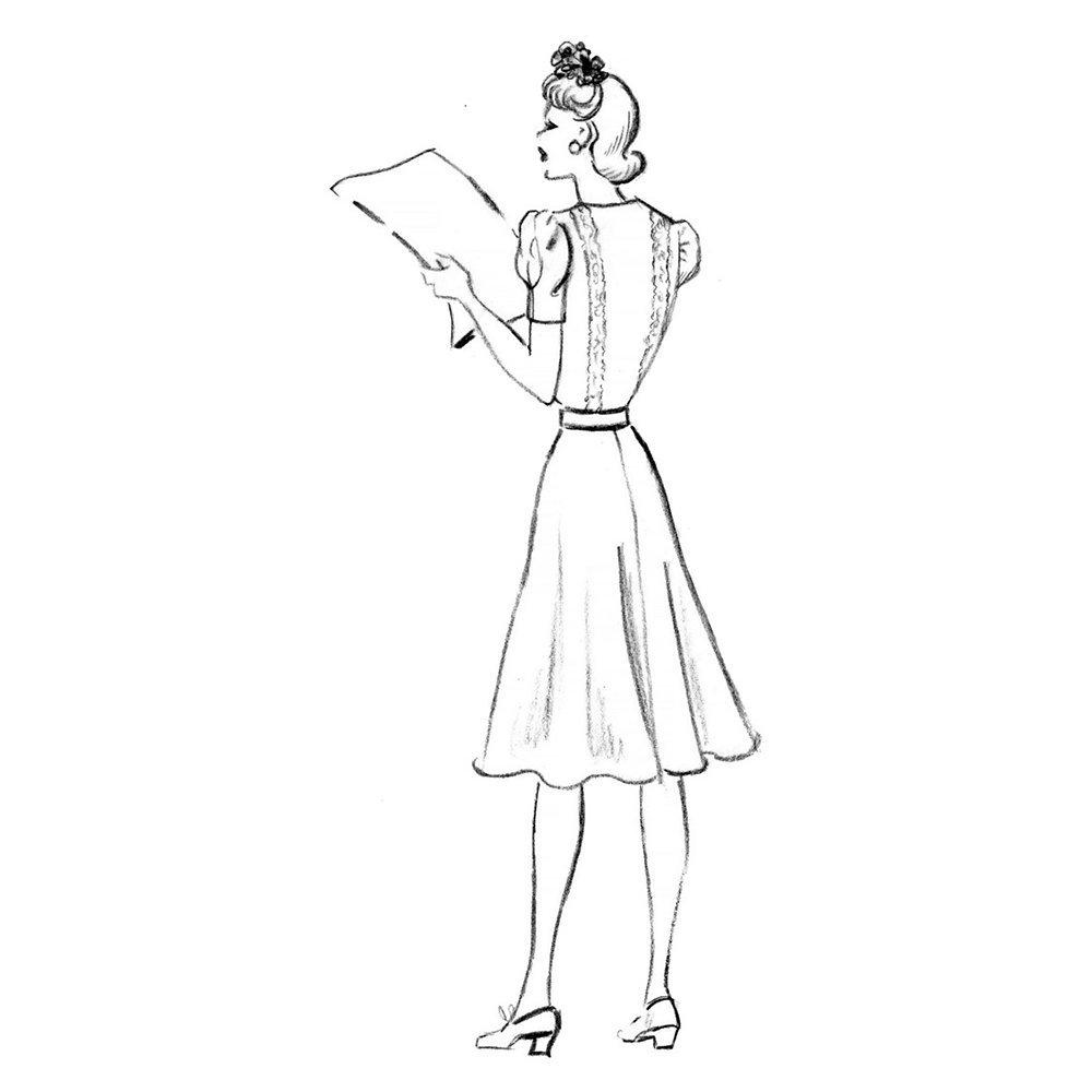 Following this pattern you can create a fitted dress with neckline variations, gathered sleeves, side snap or zipper closures and pocket detailing.