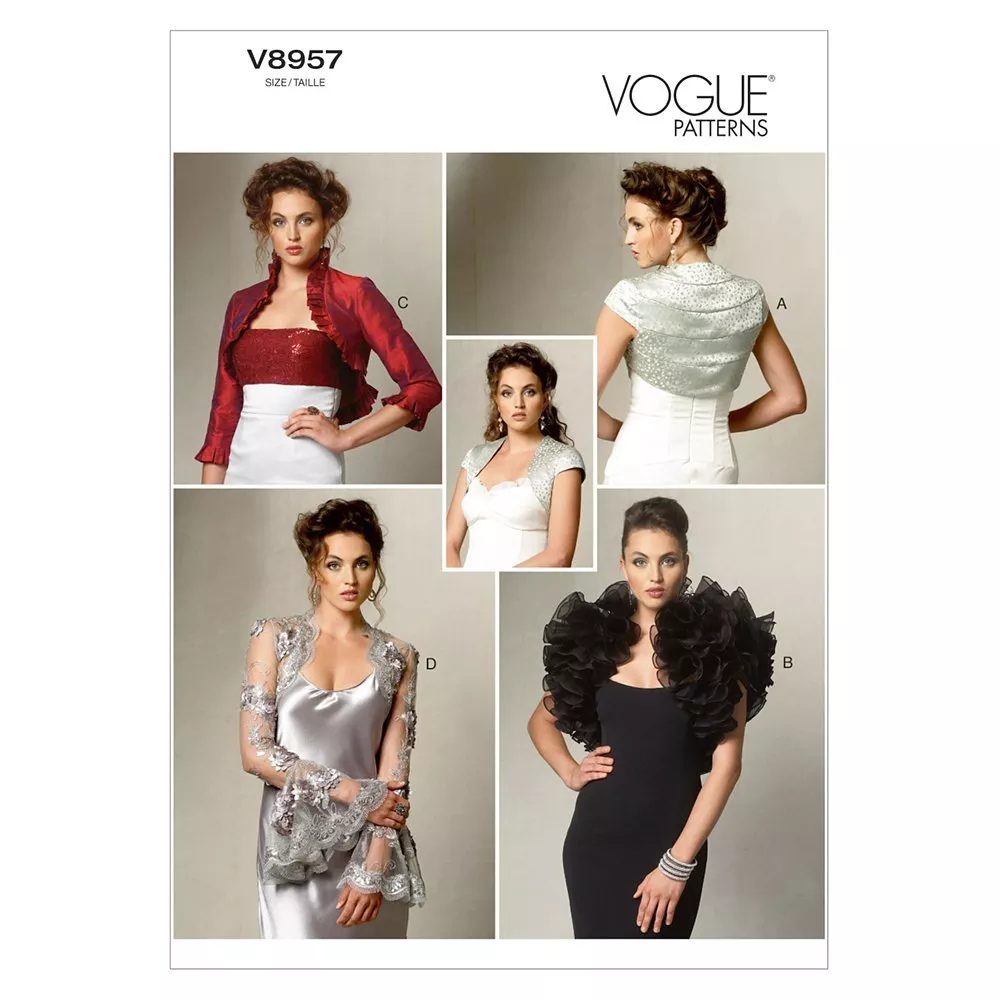 This pattern presents four designs of a cropped, close-fitting jacket to be worn over dresses and tops for a formal/smart occasion. Variant A has cap sleeves. Variant B is sleeveless with single-layer flounces. Variant C has pleated ruffles. Variant D is unlined with sleeve flounces.