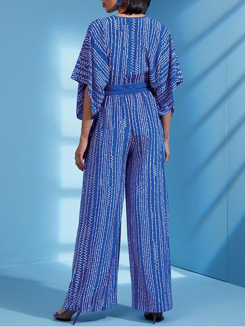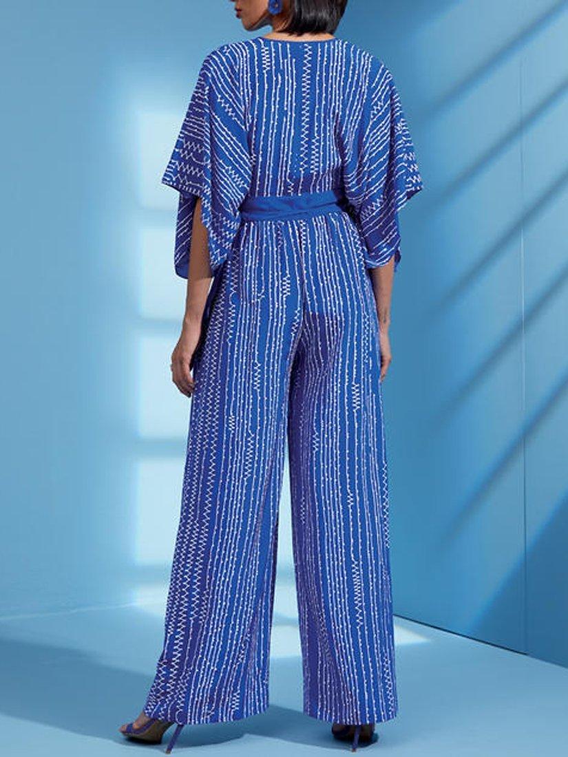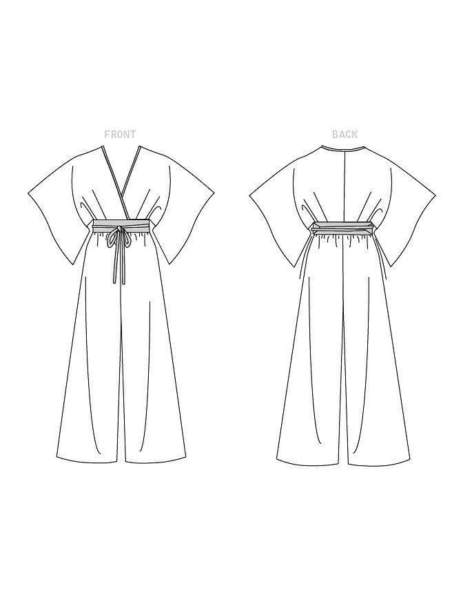 Following this pattern you can create a jumpsuit with kimono-style sleeves, a deep V-neckline and an elasticated waist.