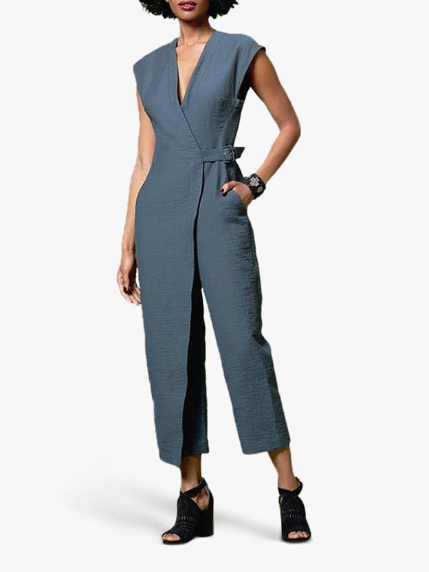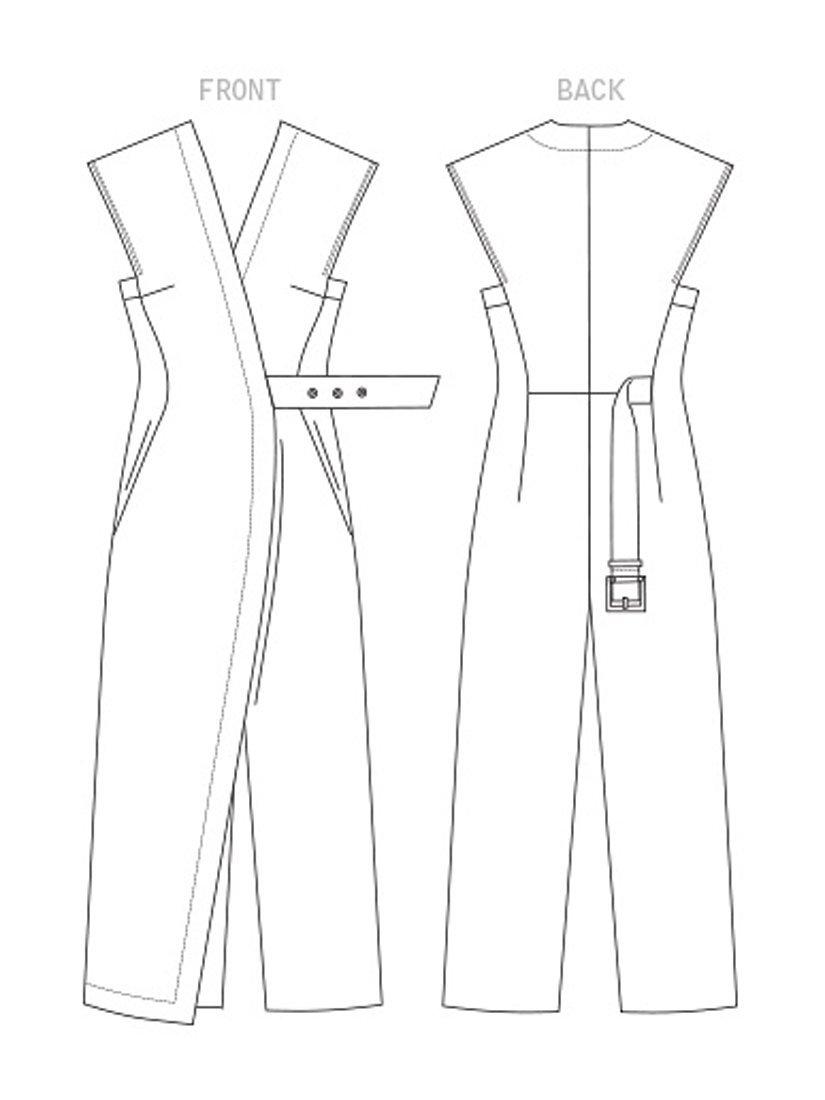 Following this pattern you can create a jumpsuit with mock-wrap detail, side slant pockets, squared-off armholes and half self-belt.