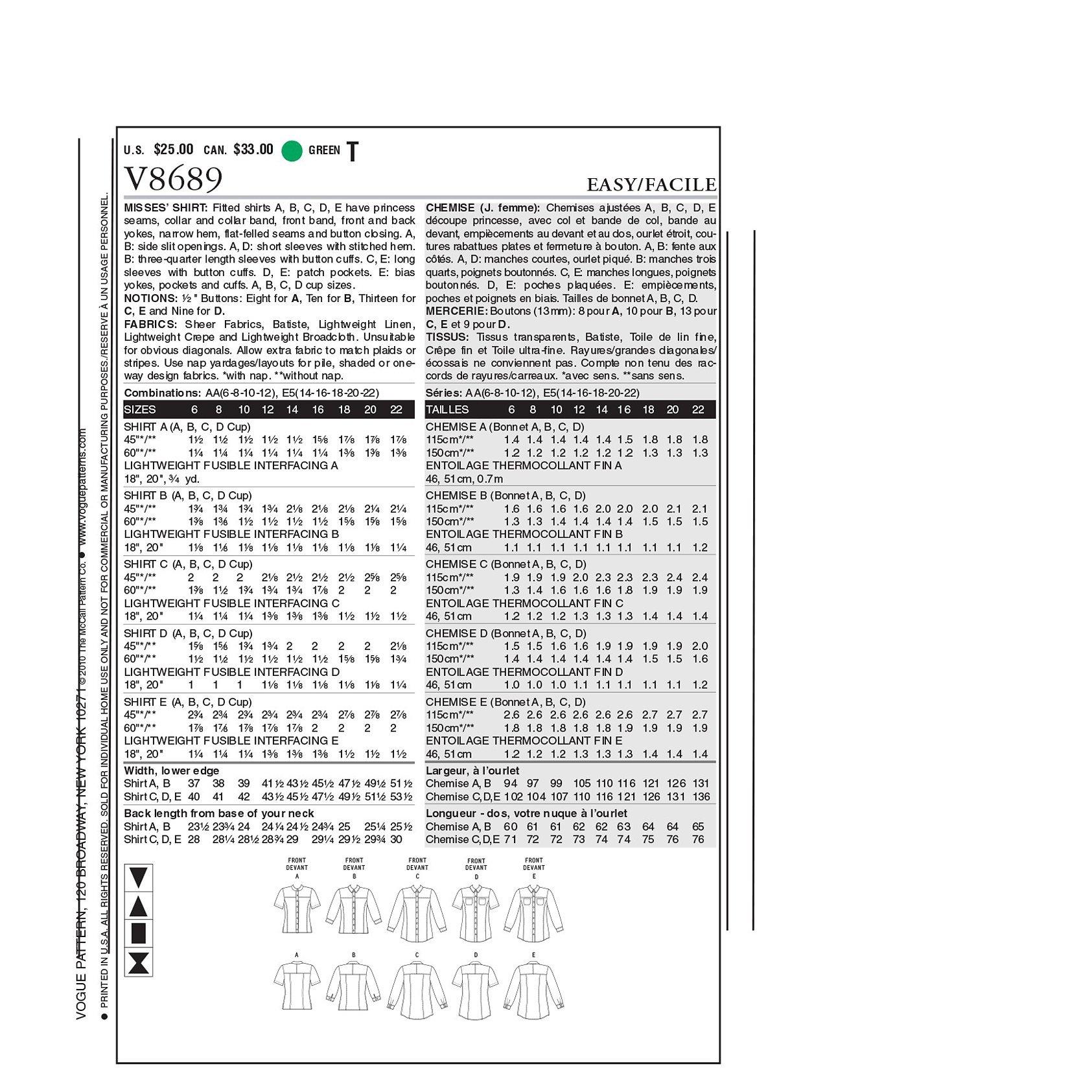 VogueWomen's Shirt Sewing Pattern, 8689