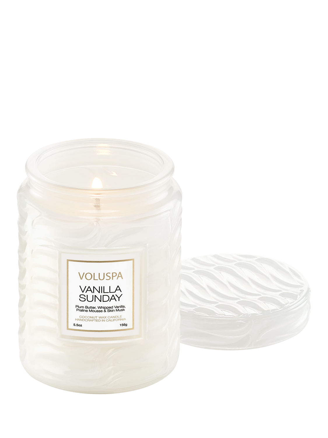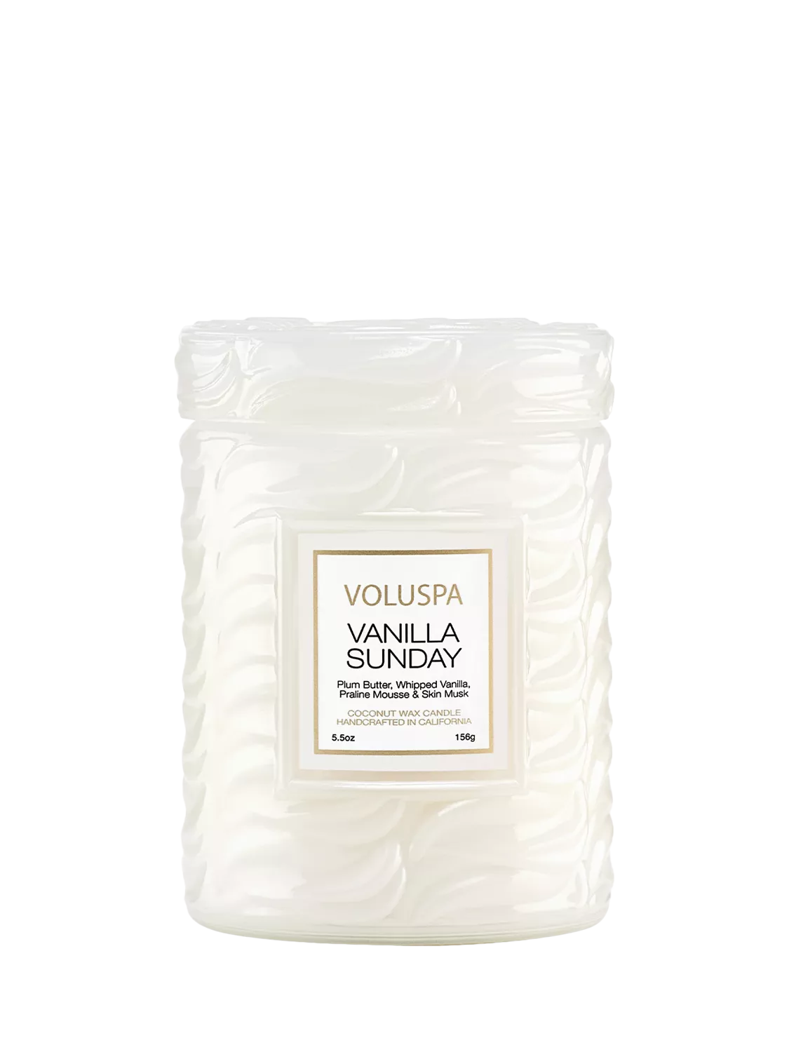 Sundays are not meant to be scary. Let your hair down and sink into a swirl of comforting sweetness. Invite cravings of endless possibilities and tantalising inspiration with a dollop of velvety Plum Butter and airy Freesia. Whipped Vanilla and Praline Mousse melt into a soft cloud of Orris, Amber, and Skin Musk. Don’t worry about tomorrow, live in a Vanilla Sunday. Vanilla Sunday is housed in a white glass vessel adorned with an embossed swirl pattern reminiscent of a creamy vanilla sundae. This fragrance is a tactile tribute to comfort and delight—made to be displayed, touched, and treasured. Single wick, with embossed swirly white glass, topped with a coordinating embossed glass lid.