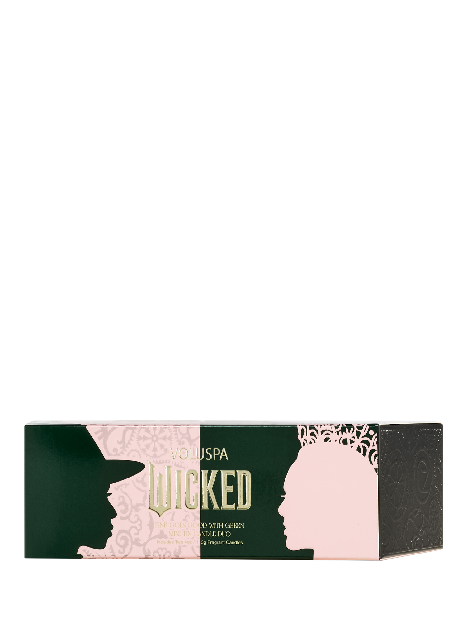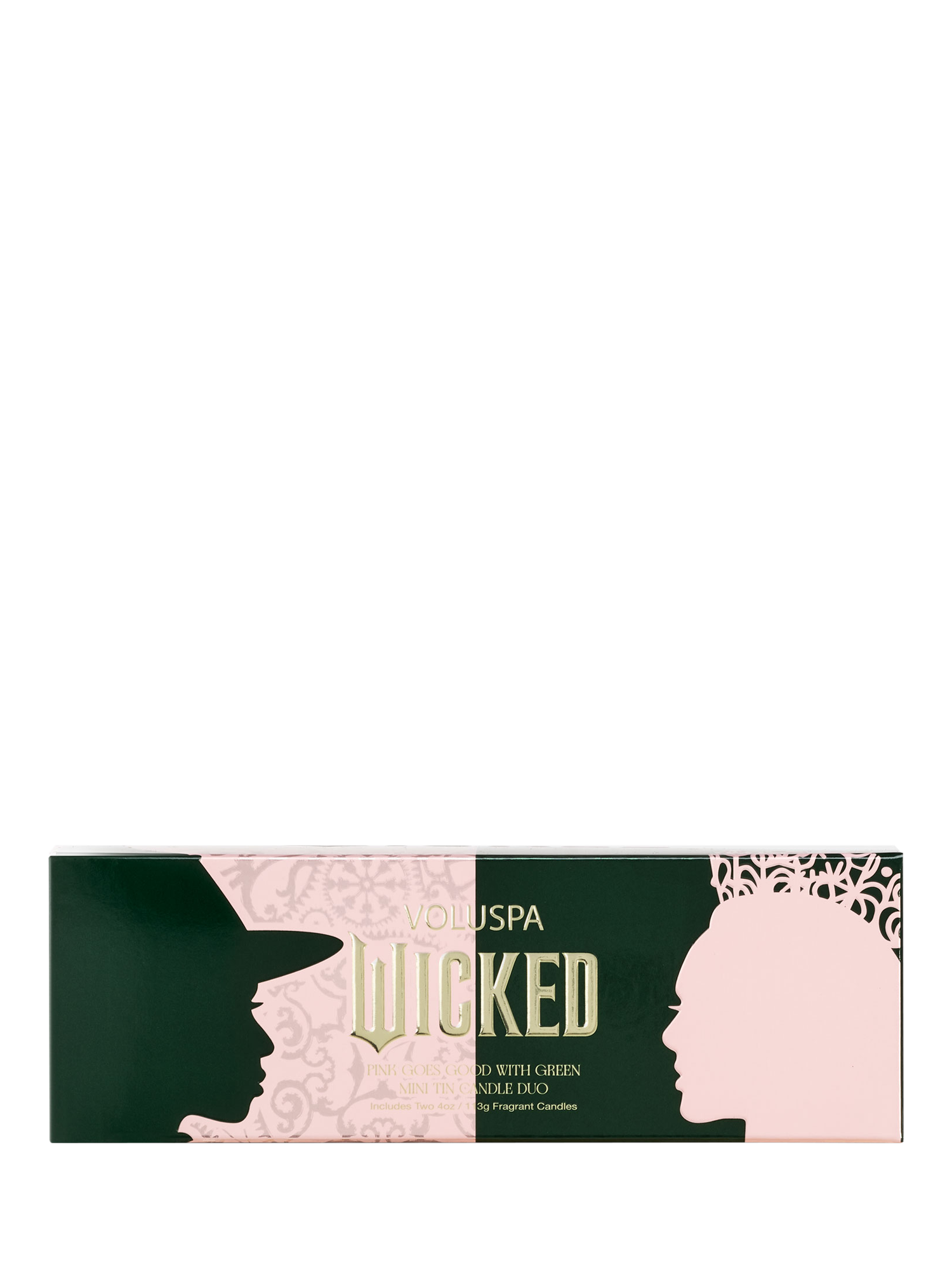 Uncover the aromatic tale of two opposites that attract. This set includes 2 decorative tin candles with intricate Emerald City details. Each lid features a silhouette of Glinda and Elphaba's profile inside of an embossed gold-patterned frame. Packaged in an extravagantly decorated pink and green box. This set includes Glinda's Perfectly Pink Yuzu and Elphaba's Bewitching Banyan Forest Mini Tin Candles. Each candle is 4oz /113g.