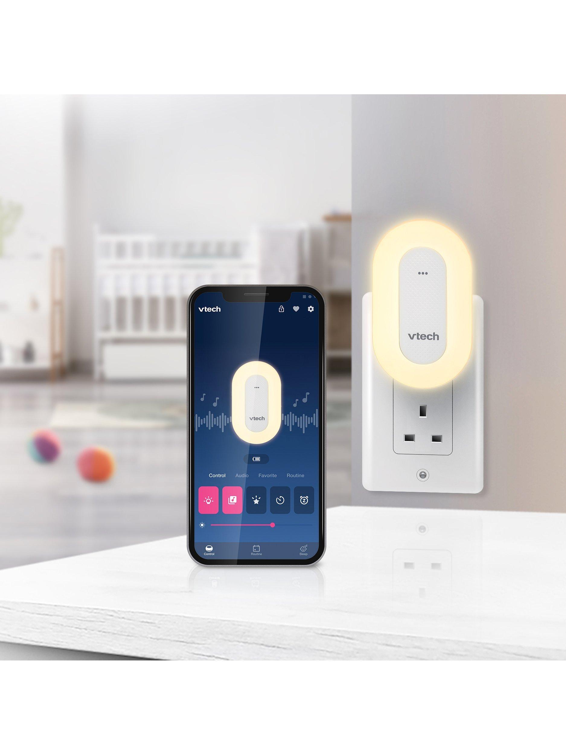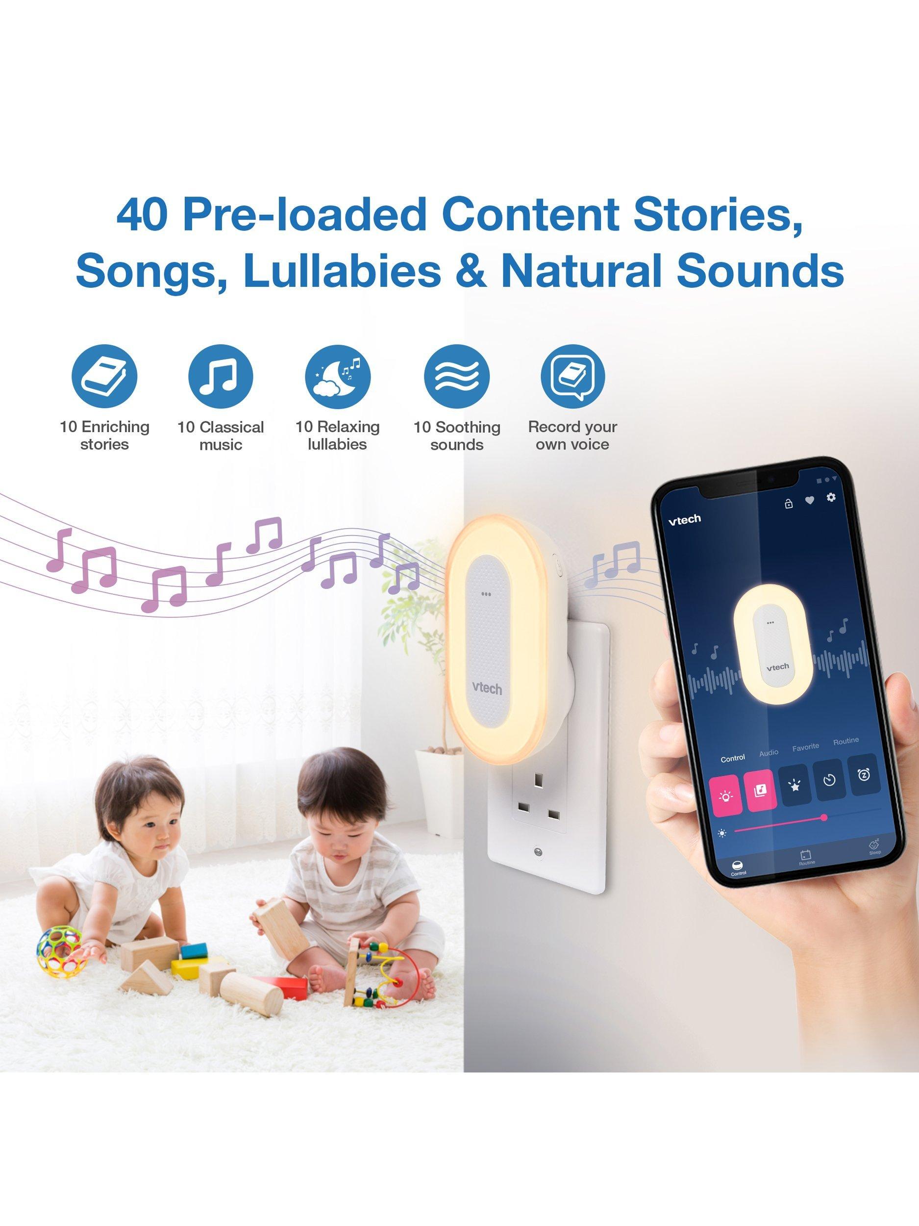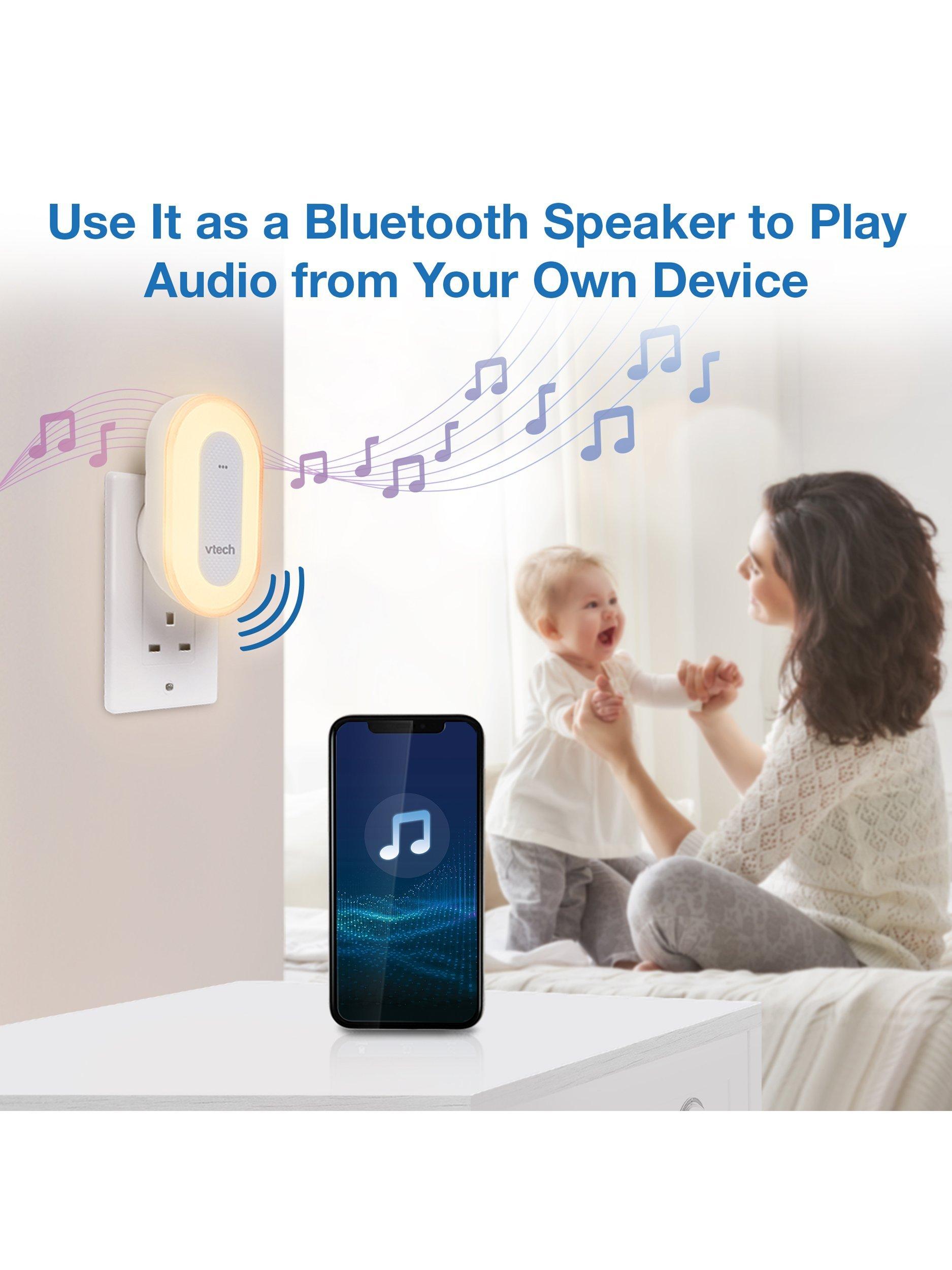 The sleek VTech Sleep Training Soother portable Bluetooth speaker includes a sleep training program and colourful one-touch night light, plus preloaded stories, classical music, lullabies, and natural sounds.