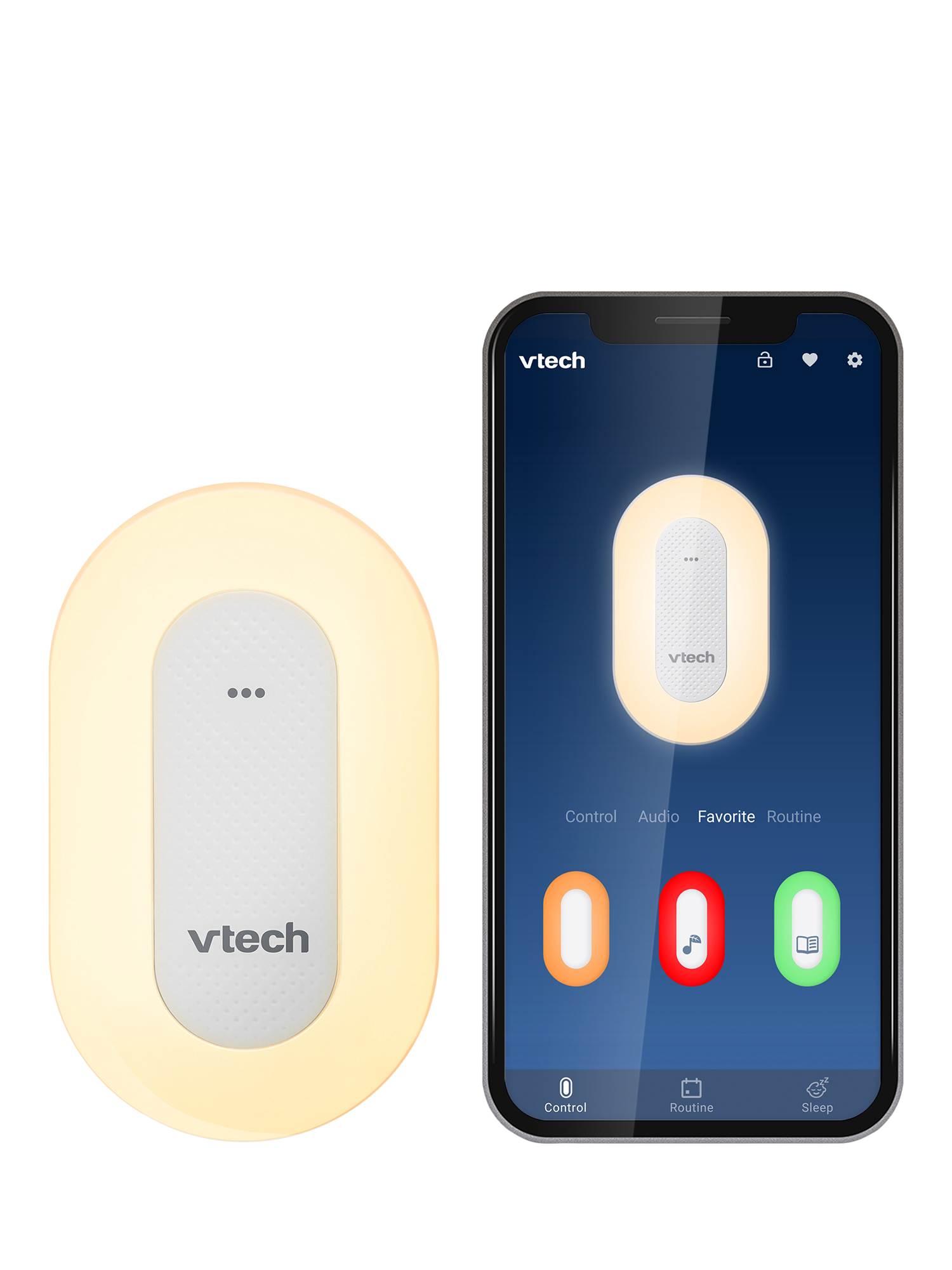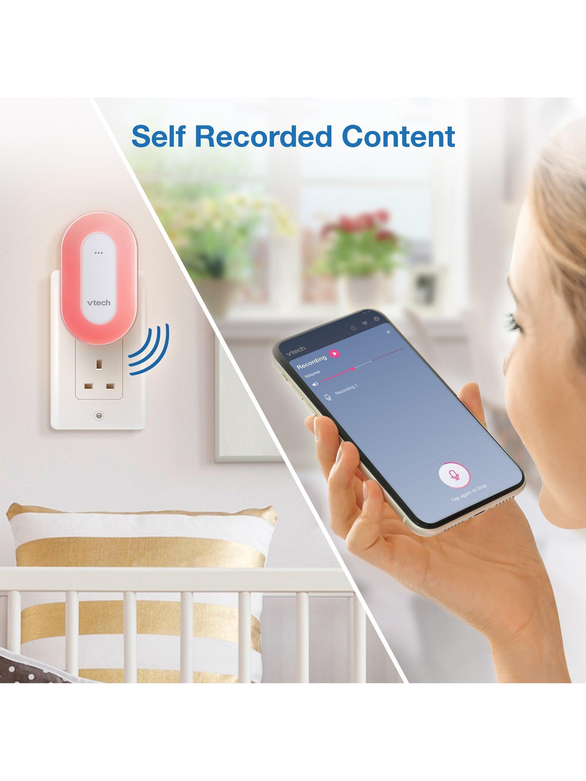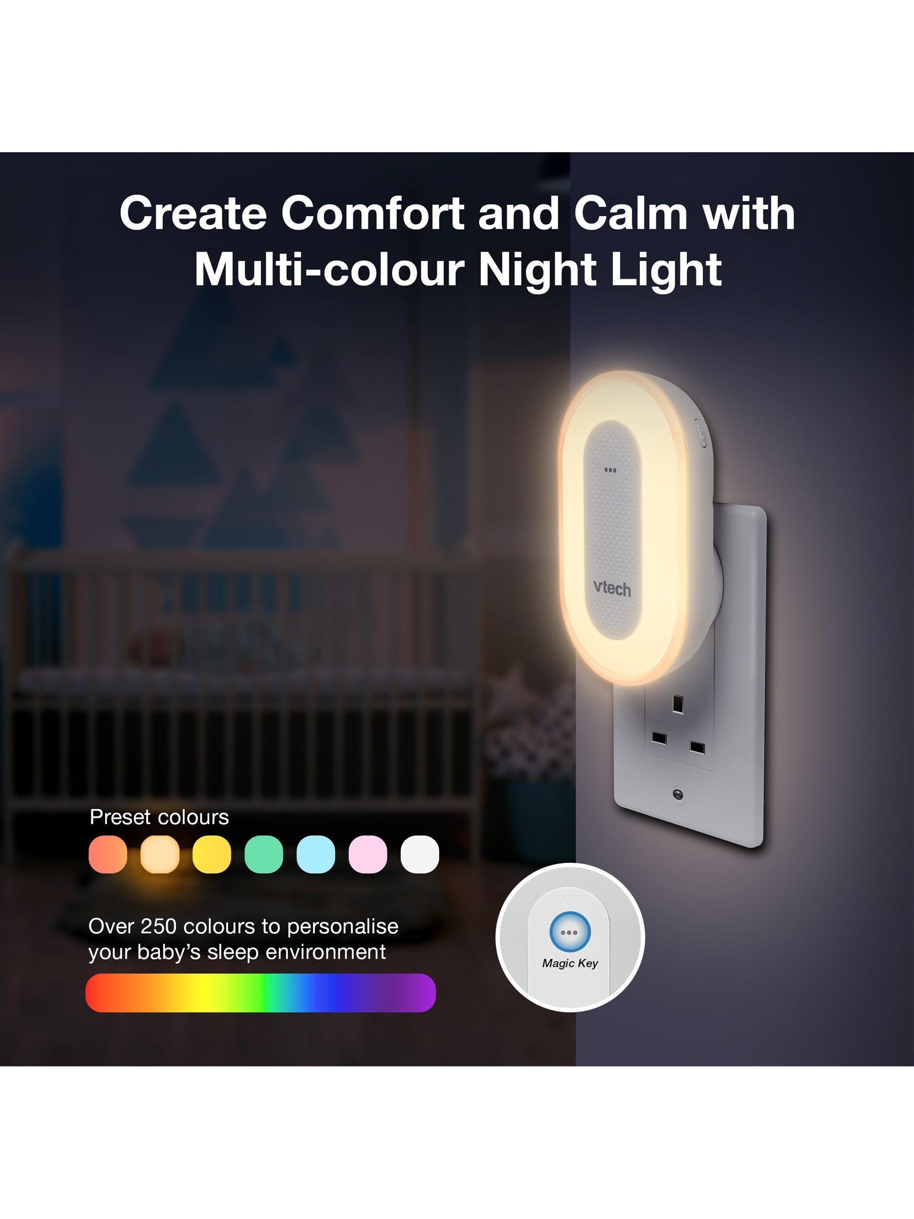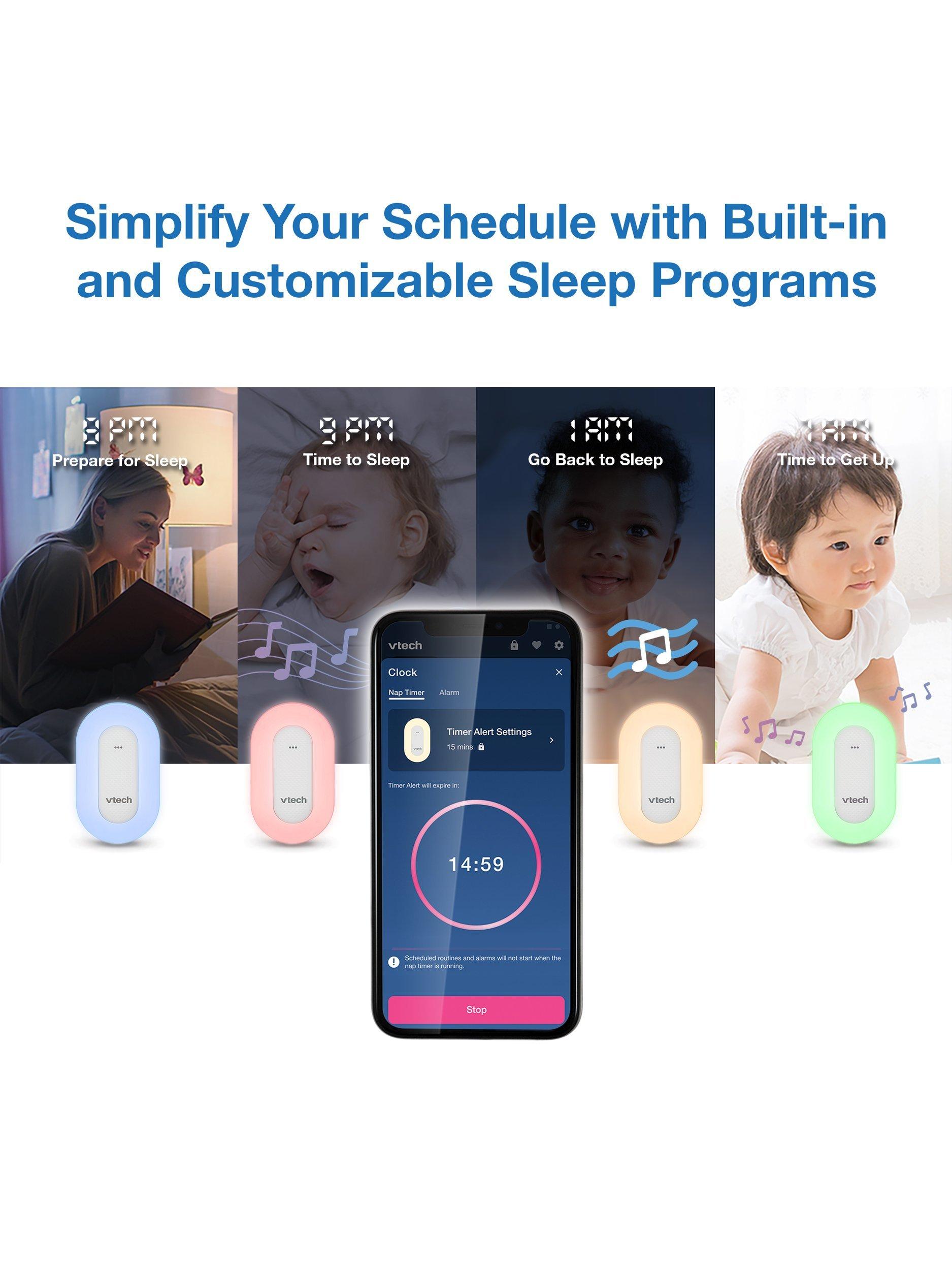 The sleek VTech Sleep Training Soother portable Bluetooth speaker includes a sleep training program and colourful one-touch night light, plus preloaded stories, classical music, lullabies, and natural sounds.