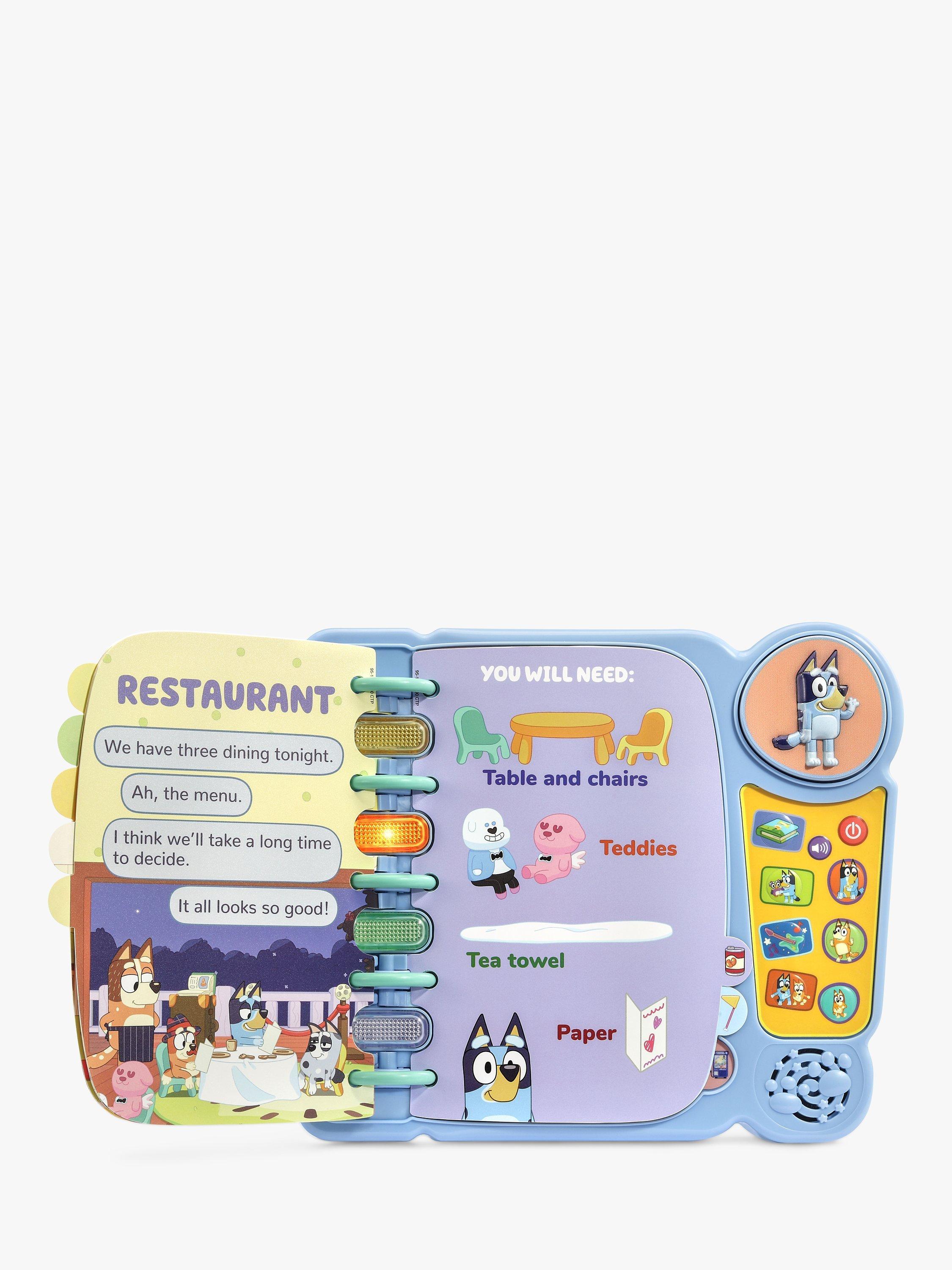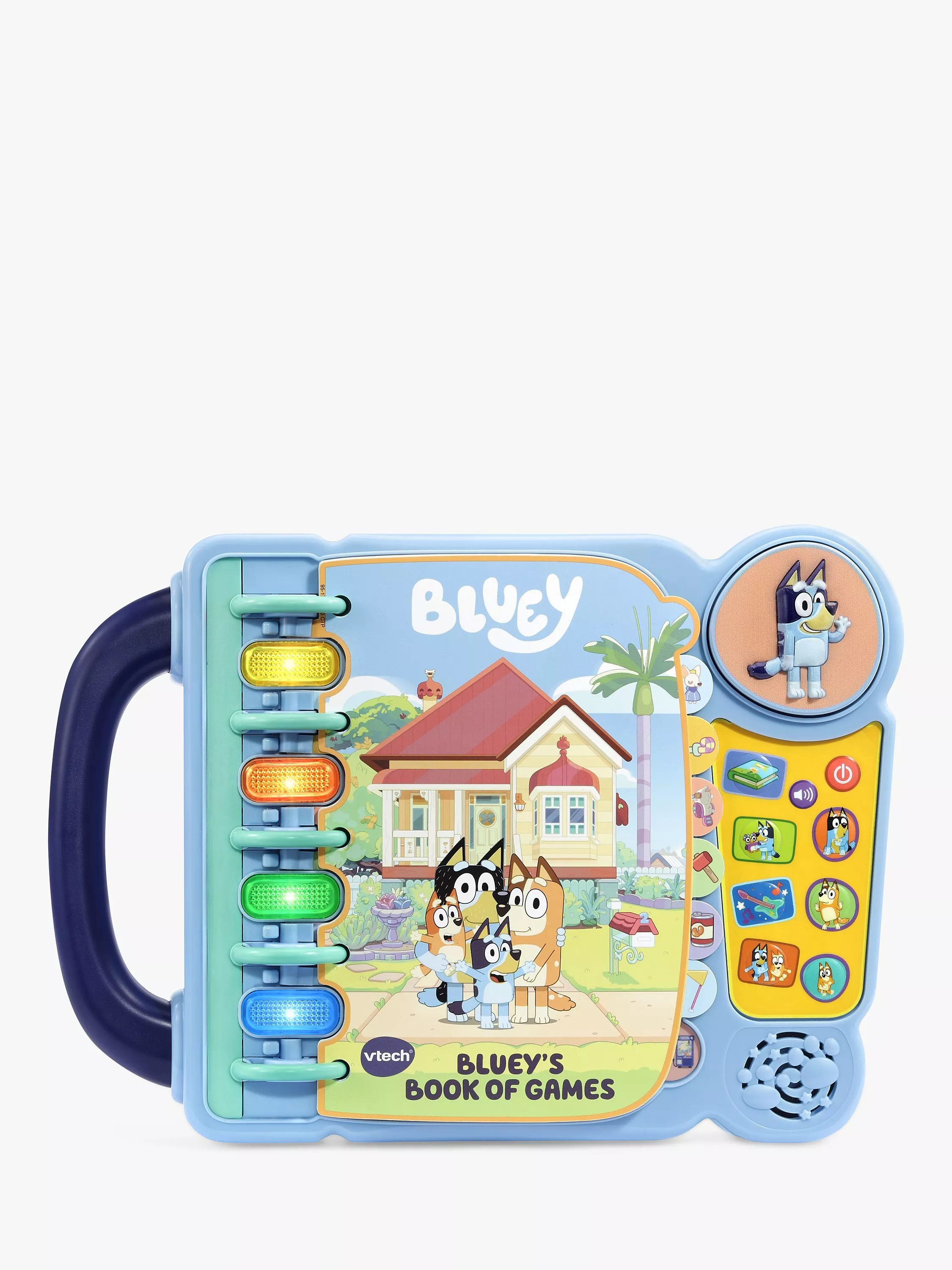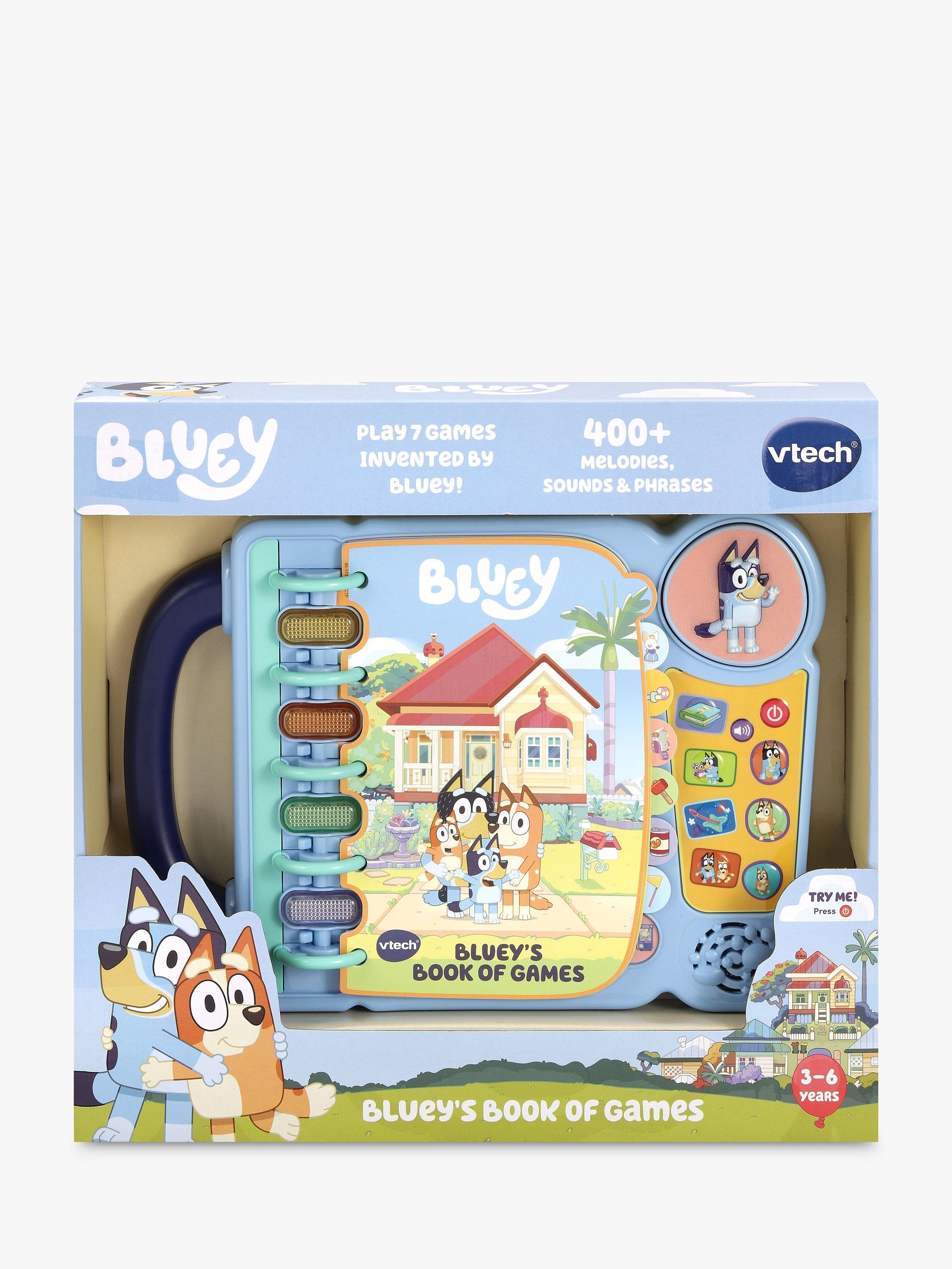 Let’s play! Turn the pages of Bluey’s Book of Games and pretend with Bluey and Bingo. Playful pups Bluey and Bingo love playing pretend using objects around the house. Seven pages encourage discovery and showcase Bluey and Bingo’s pretend-play adventures from the show. Press the large Bluey button to hear her say familiar phrases. Hear Bingo introduce their parents and herself by pressing the Bingo, Dad and Mum buttons. Want to play a game? Choose four different activities to play with Bluey and Bingo.