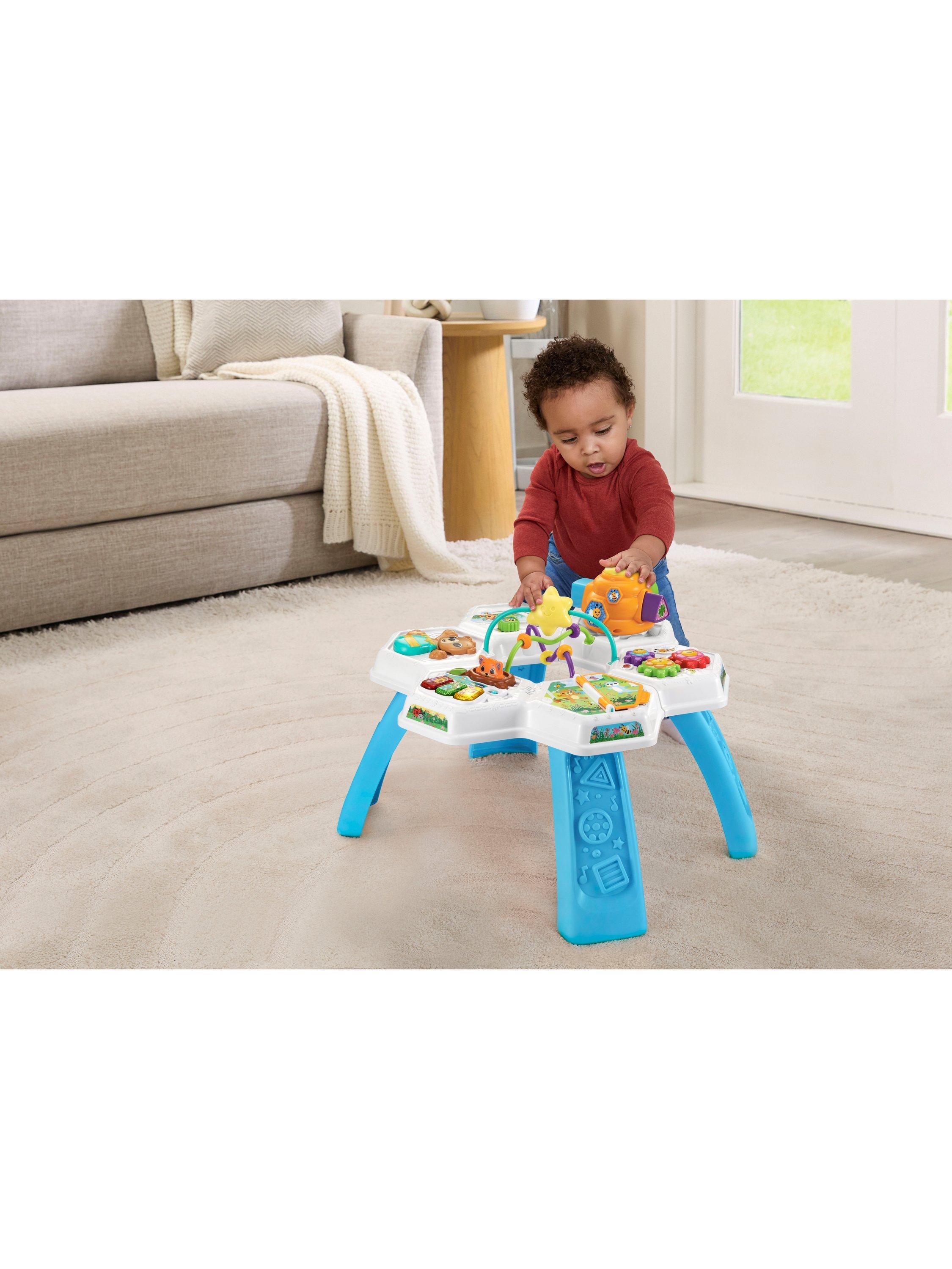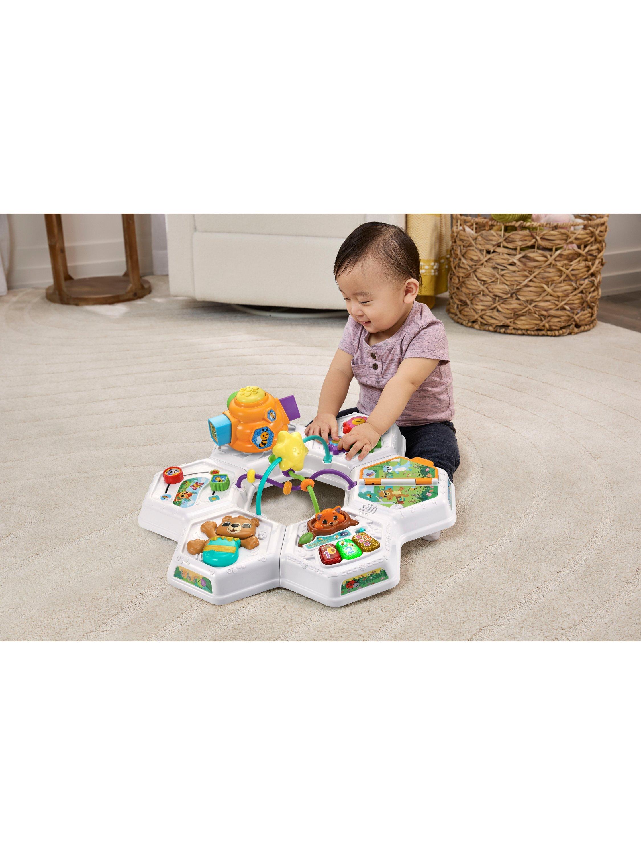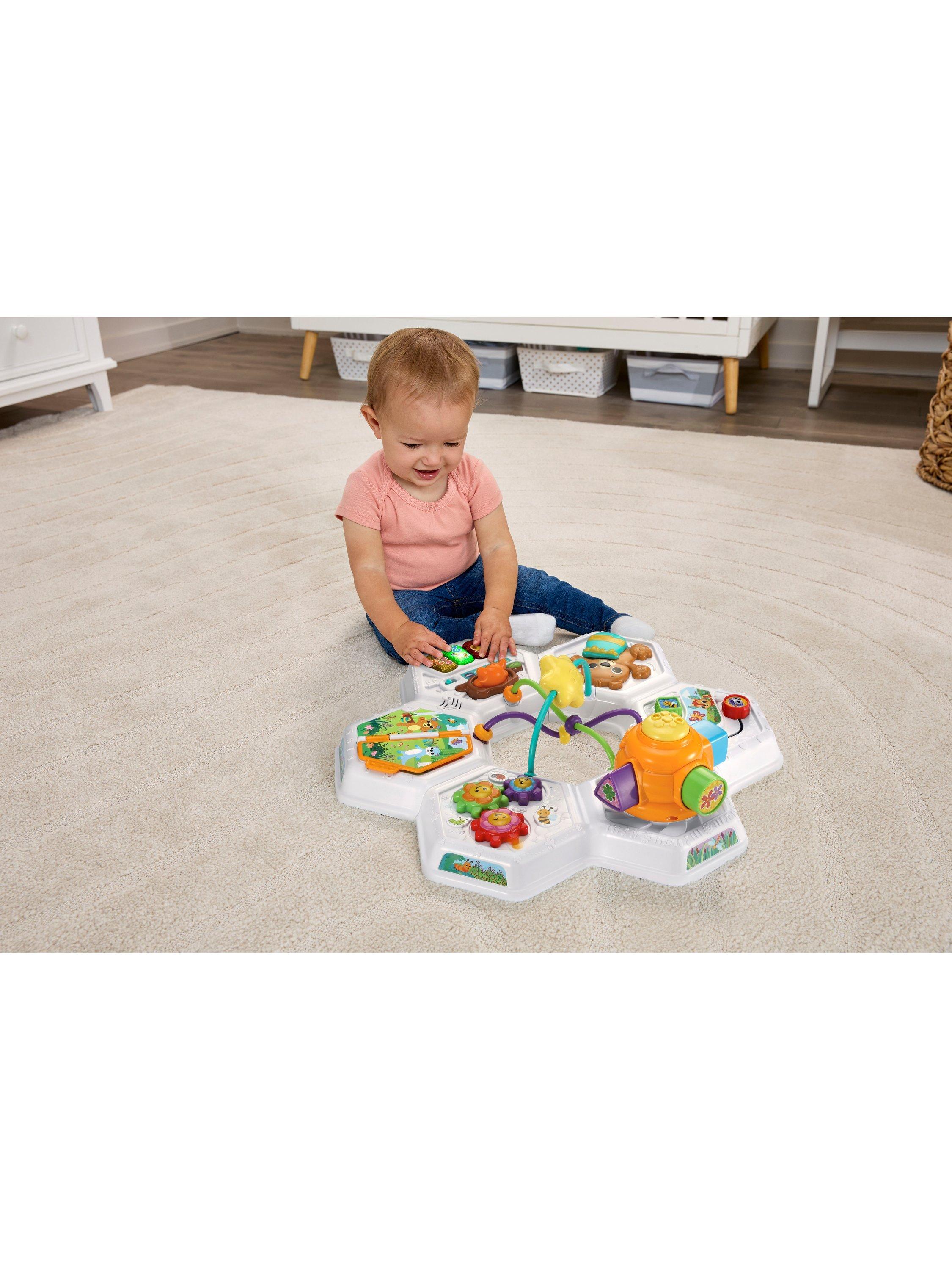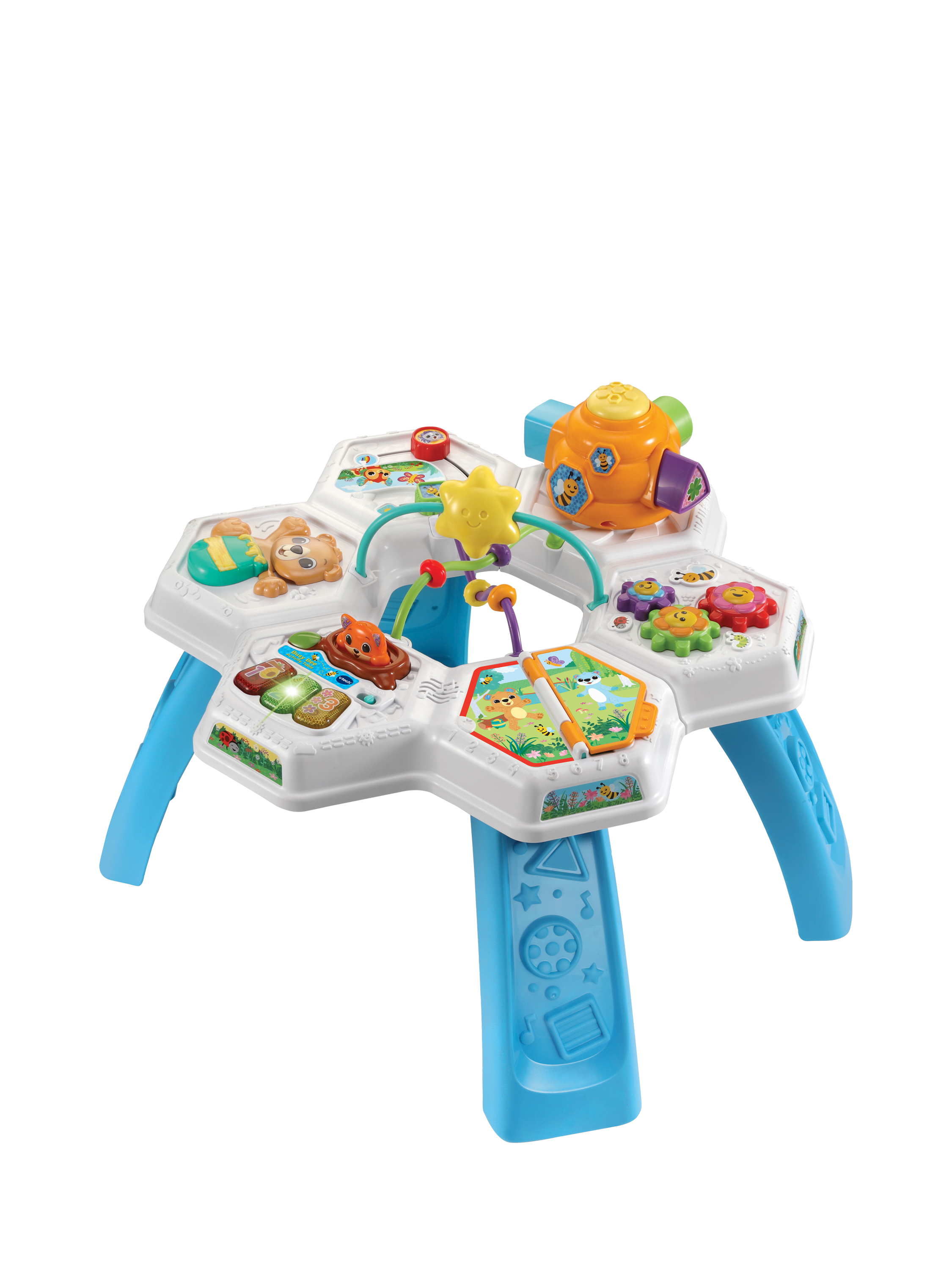 An interactive table features six play zones: light up piano keys and peek-a-boo fox, mini story book, cute twisting bear, animal maze, colourful gears and beehive shape-sorting. All zones feature a combination of early learning and development skills introducing colours, animals, numbers and songs whilst encouraging motor skills, sensory and auditory awareness and early language skills.
