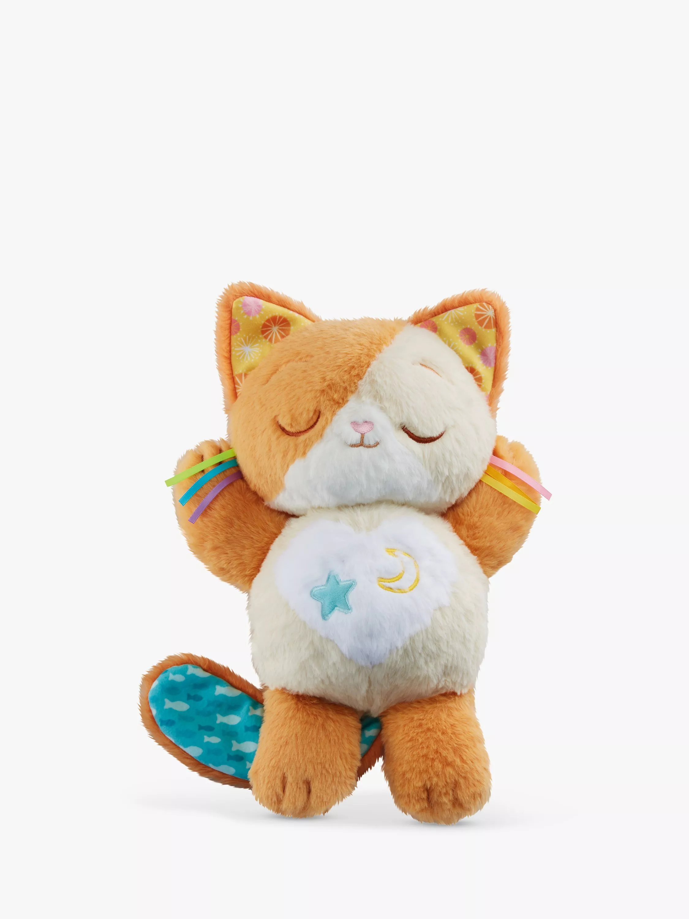 Kitty loves to snooze and mimics a real kitten with its cute motions. As Kitty relaxes its head gently moves from side to side and its nose wrinkles as it dreams. Kitty’s round tummy goes up and down to imitate breathing to calm baby as they relax.