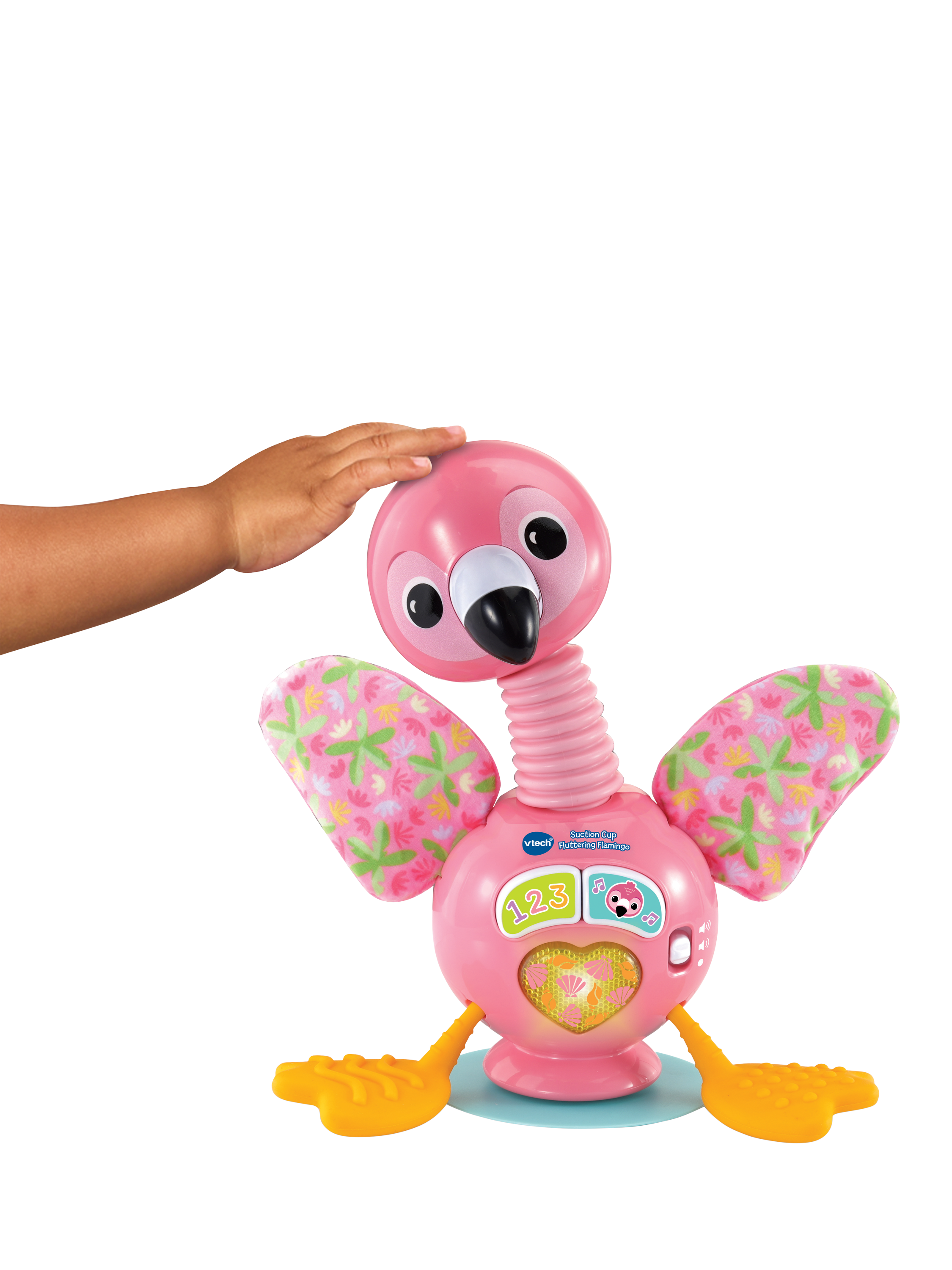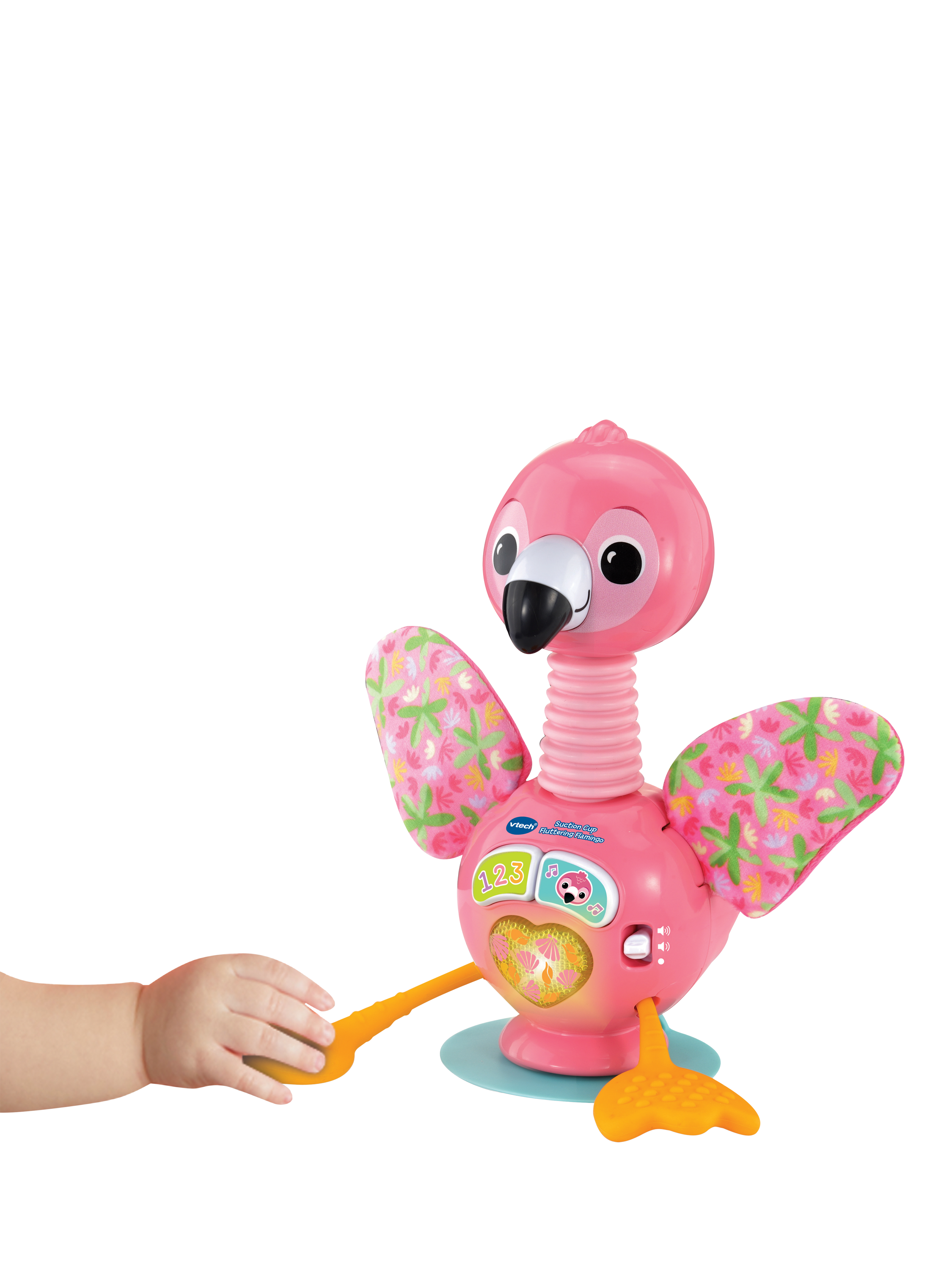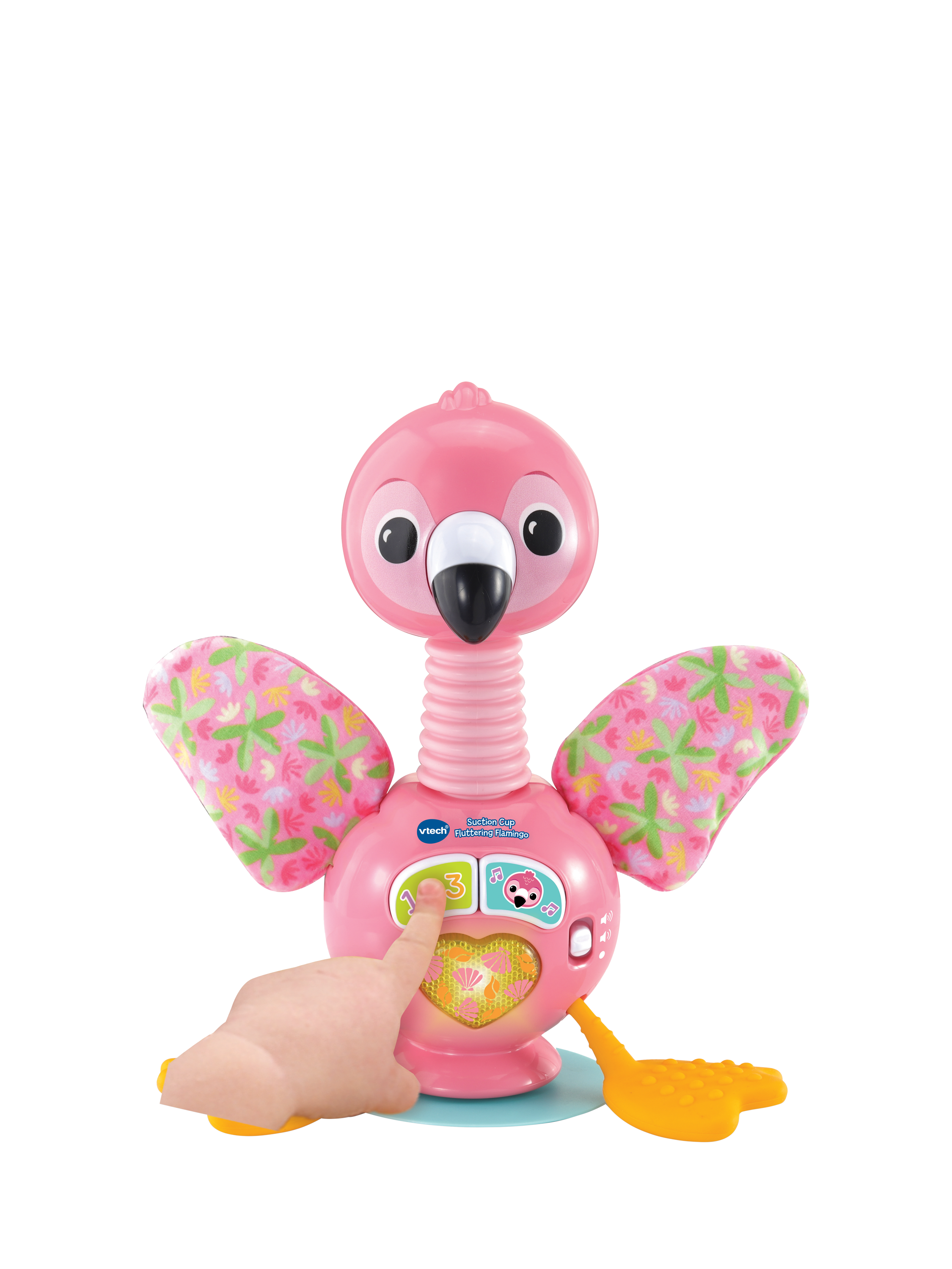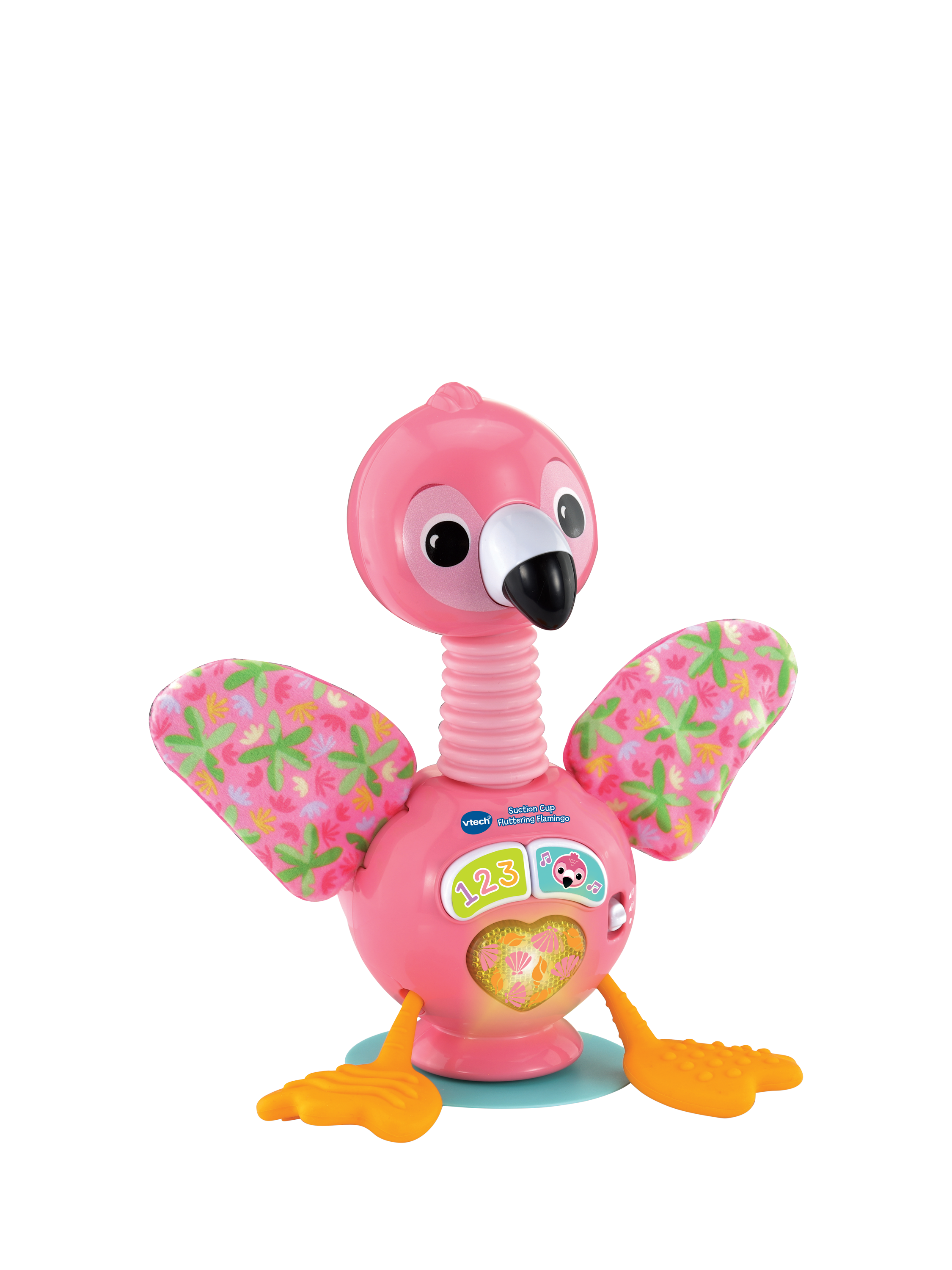 The toy includes a variety of textures and movements to encourage exploration and tactile discovery. Its secure suction base keeps it steady on highchairs or tables. Babies will love bending the flamingo's neck to see its head wobble and pulling the soft, textured silicone legs for a fun surprise.