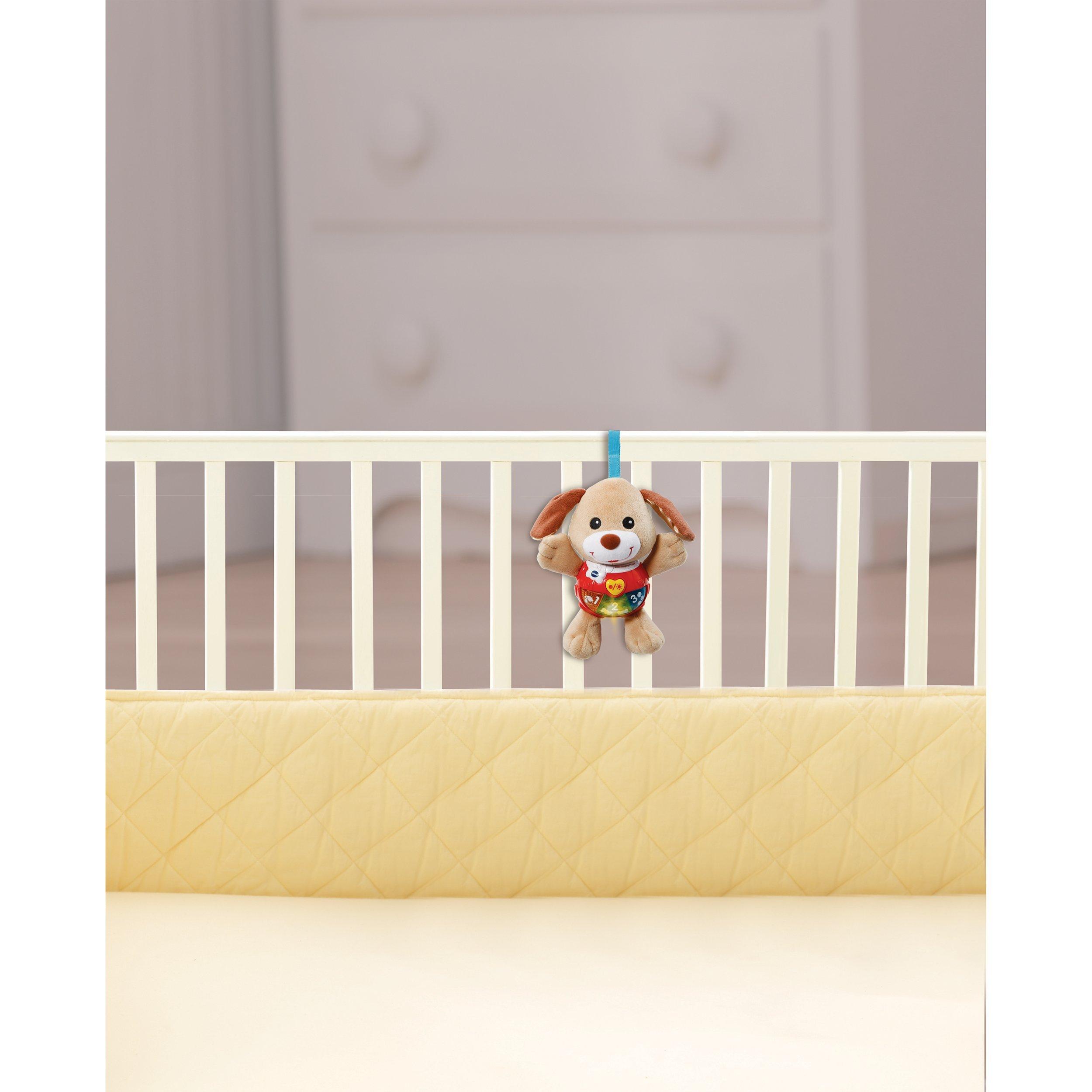 Press the puppy's 3 light-up buttons to be introduced to numbers, feelings, puppy objects and lots of fun phrases! 3 lovely sing-along songs and 15 happy melodies with fun puppy sound effects add to the learning fun. Pressing the light up buttons enhances fine motor skill development while his soft huggable body encourages tactile stimulation. The puppy can be attached to a cot, pushchair or car seat with his attachment strap for fun on the go. English speaking voice promotes recognition and accelerates learning.