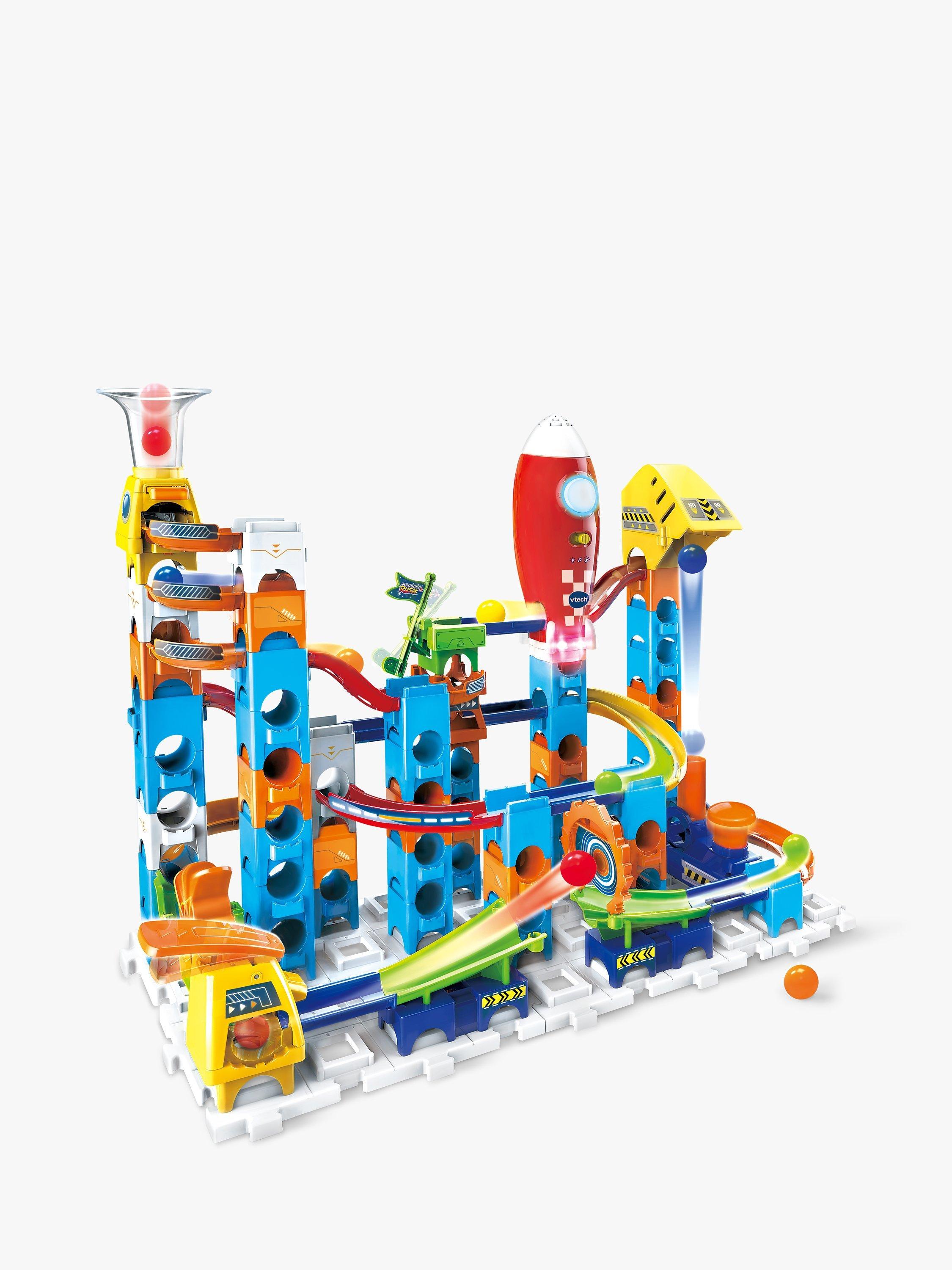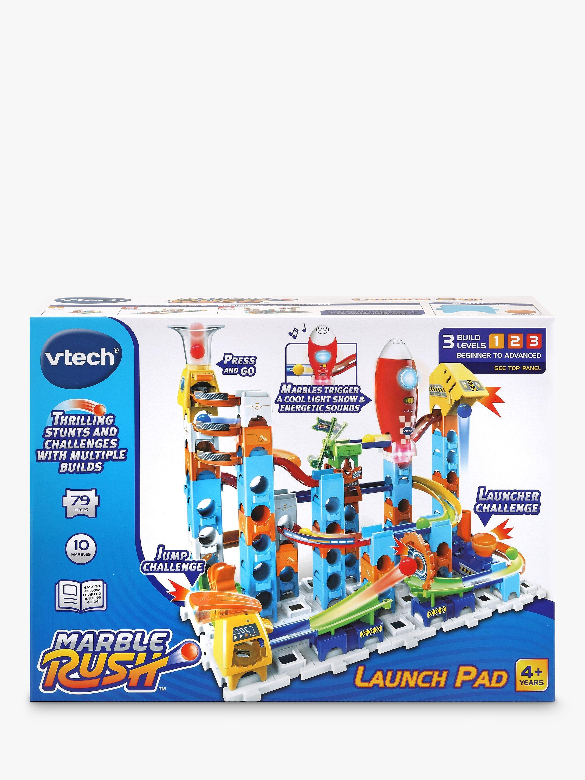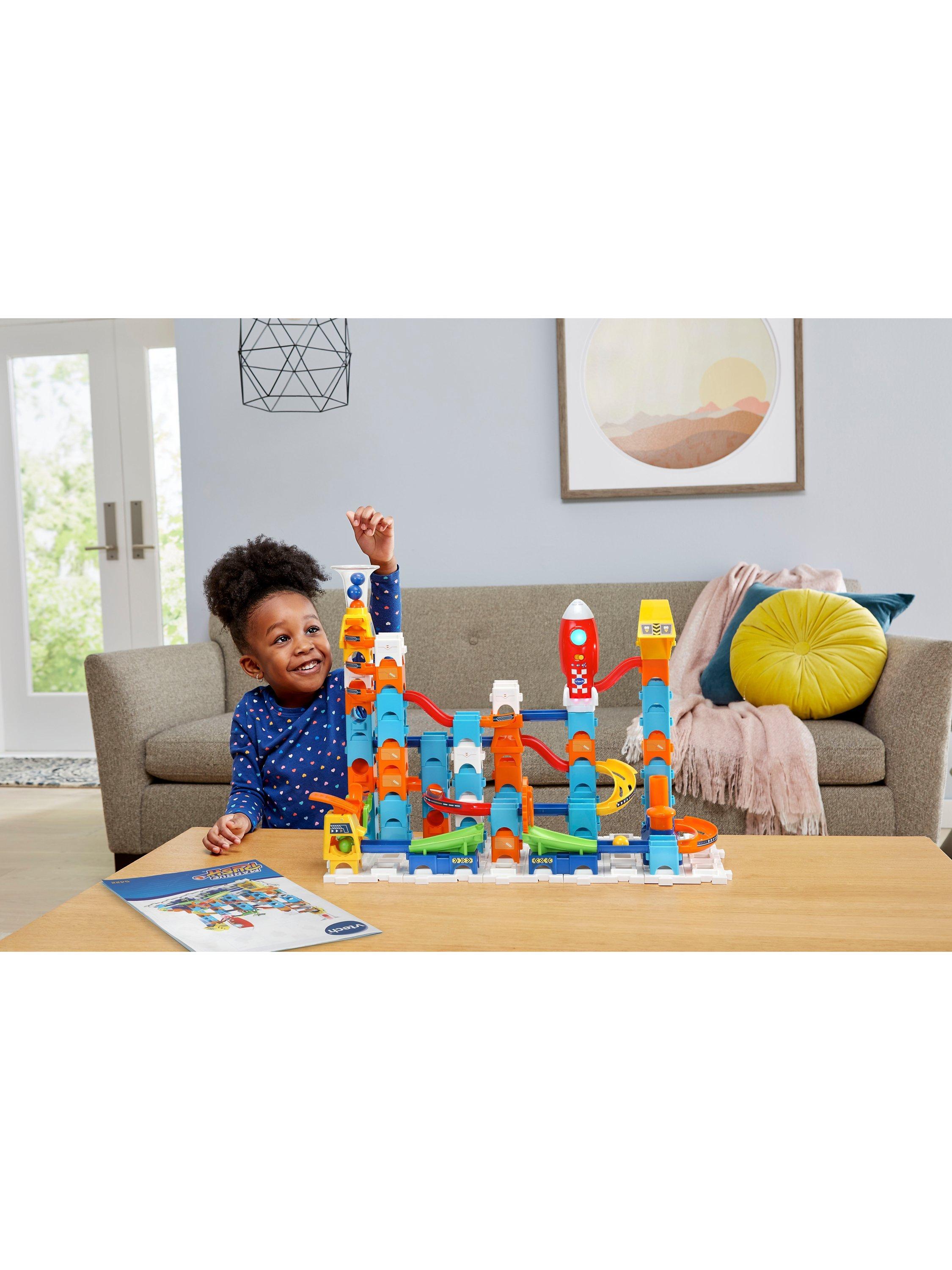 The electronic space ship module triggers cool music and sound effects when marbles run through it, enhancing your outer space themed adventure! With 10 marbles included and 79 building pieces to assemble, there is plenty of fun to be had! This toy includes easy to follow assembly instructions and is compatible with other VTech® Marble Rush items.