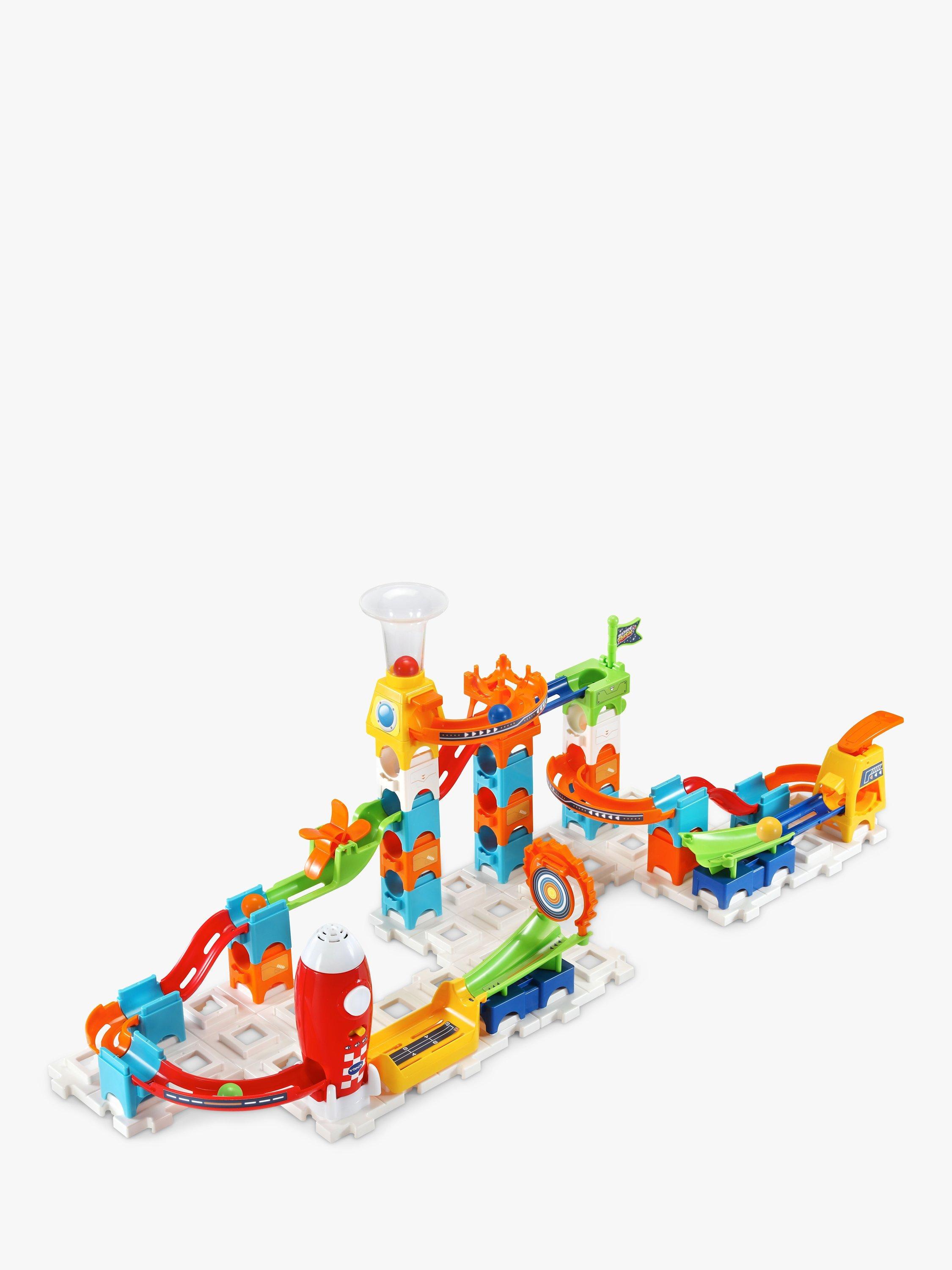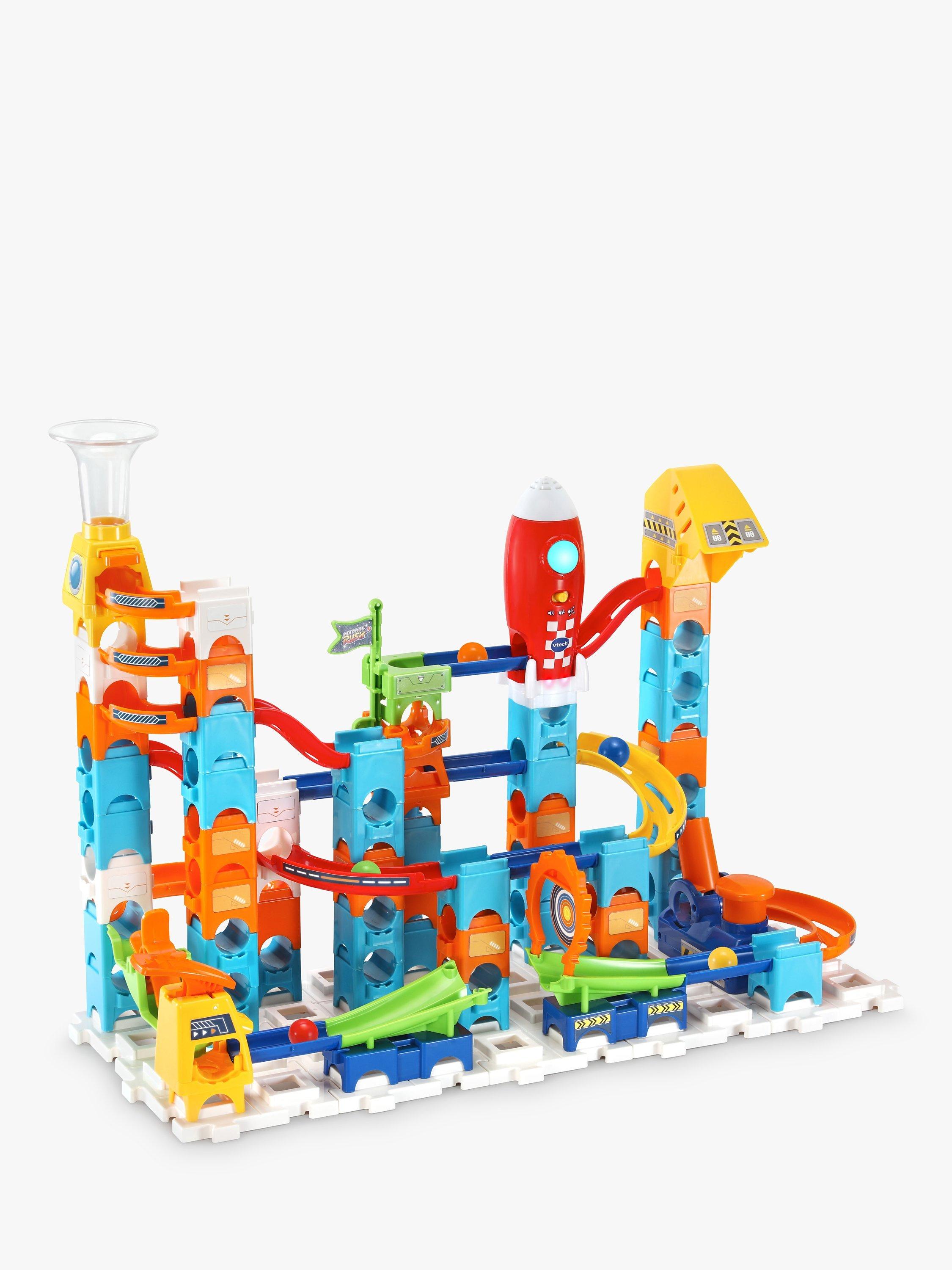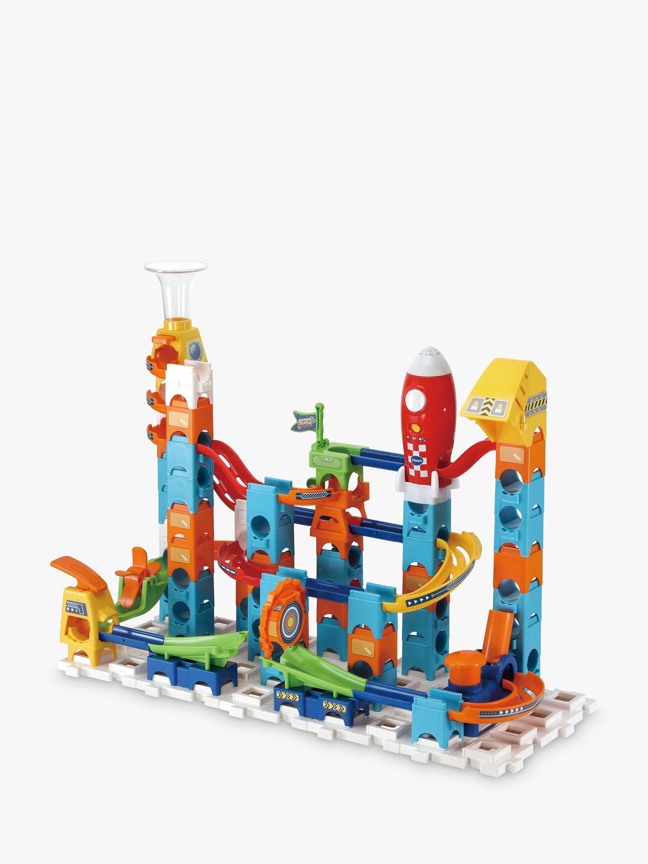 The electronic space ship module triggers cool music and sound effects when marbles run through it, enhancing your outer space themed adventure! With 10 marbles included and 79 building pieces to assemble, there is plenty of fun to be had! This toy includes easy to follow assembly instructions and is compatible with other VTech® Marble Rush items.