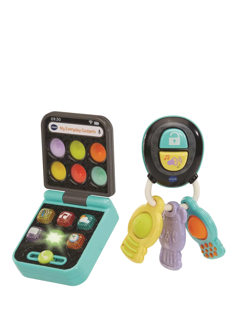 My Everyday Gadgets feature both hard and soft materials to promote sensory exploration and provide tactile stimulation. The 6 multi-coloured light-up buttons introduce apps such as weather, music and more! Car keys include 1 bear teether and 2 textured popper keys. The 6 light-up buttons illuminate even when the phone is folded! Phone features clicking sound slider, 2 sing-along songs and 10 melodies! Press the car key buttons to hear them squeak!